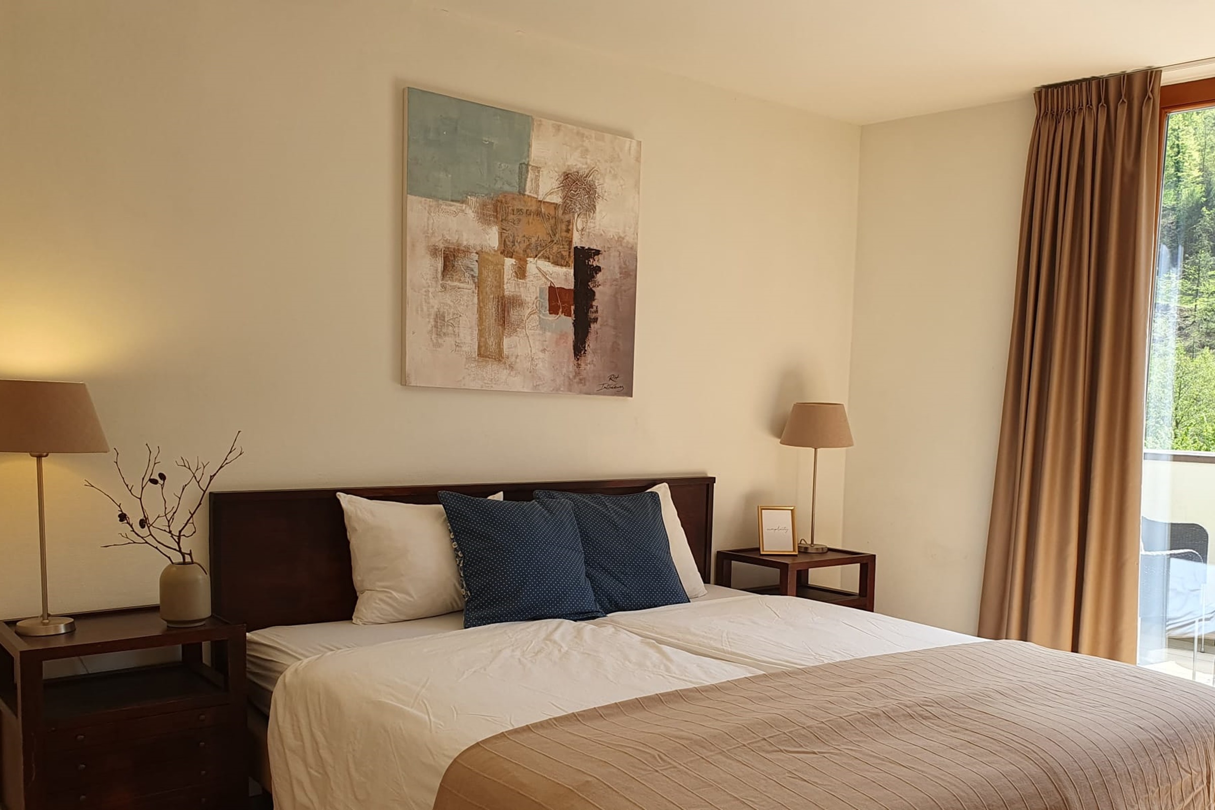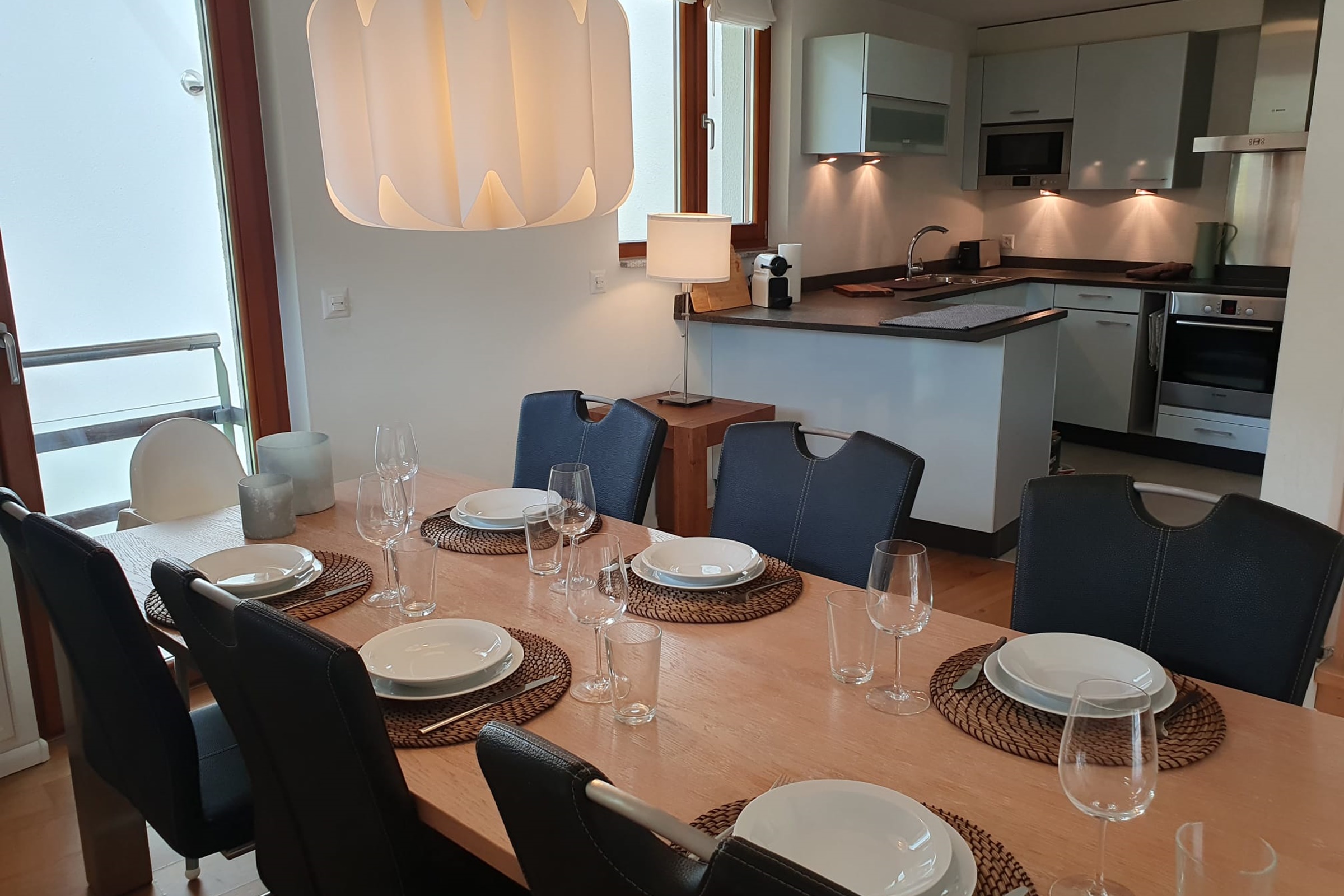 Die Ferienwohnung verfügt überdrei Schlafzimmer mit jeweils einem Doppelbettdrei Badezimmer mit Dusche, Whirlpool-Badewanne, Lavabo und einem Gäste-WCein Wohn-/Esszimmereine offene KücheInneneinrichtung & Technik
