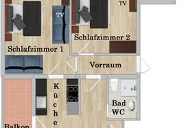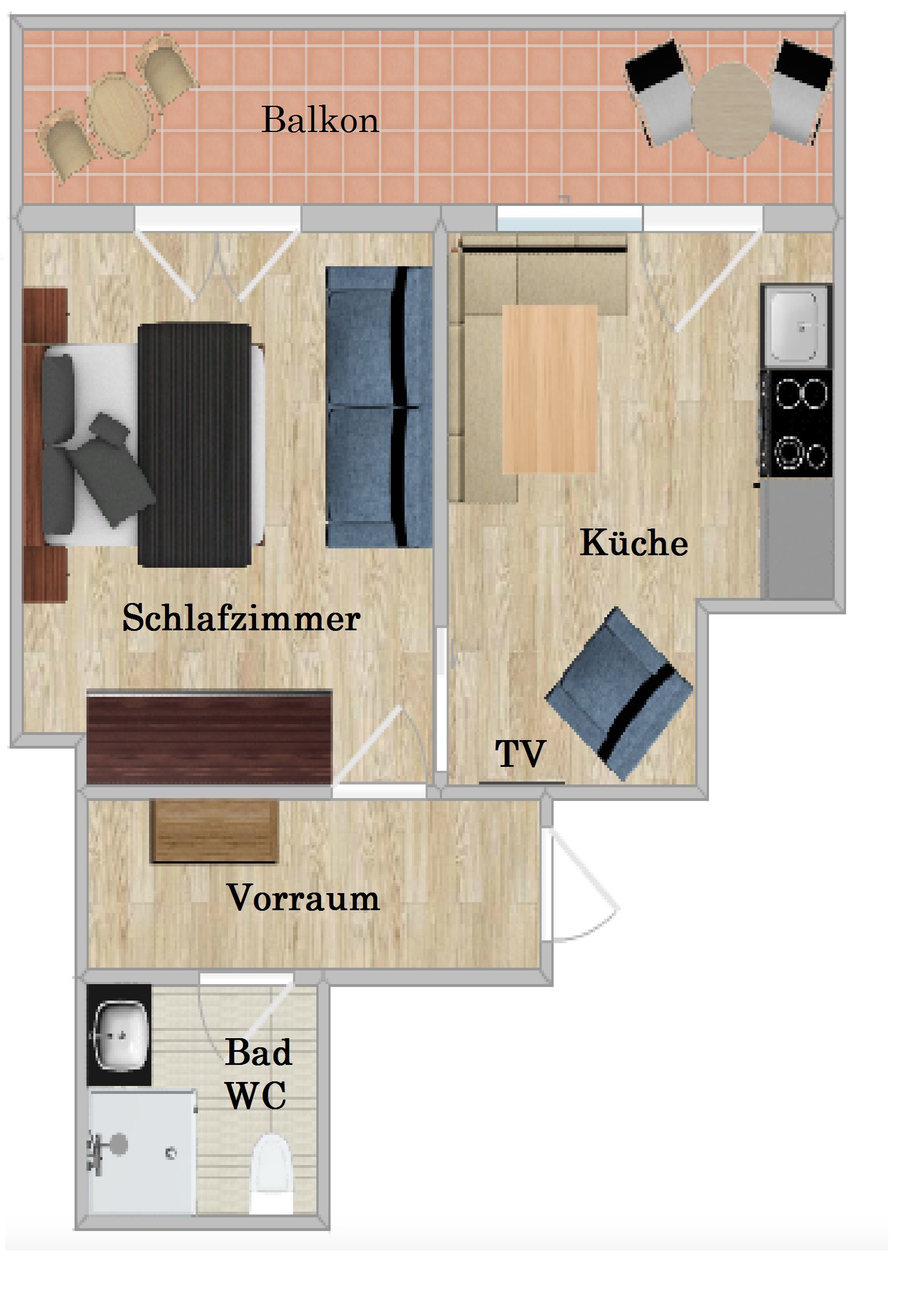 Alle Räume verfügen über einen eigenen Ost-Süd und Süd Balkon, mit Gartenmöbel und SAT-Flach-TV.