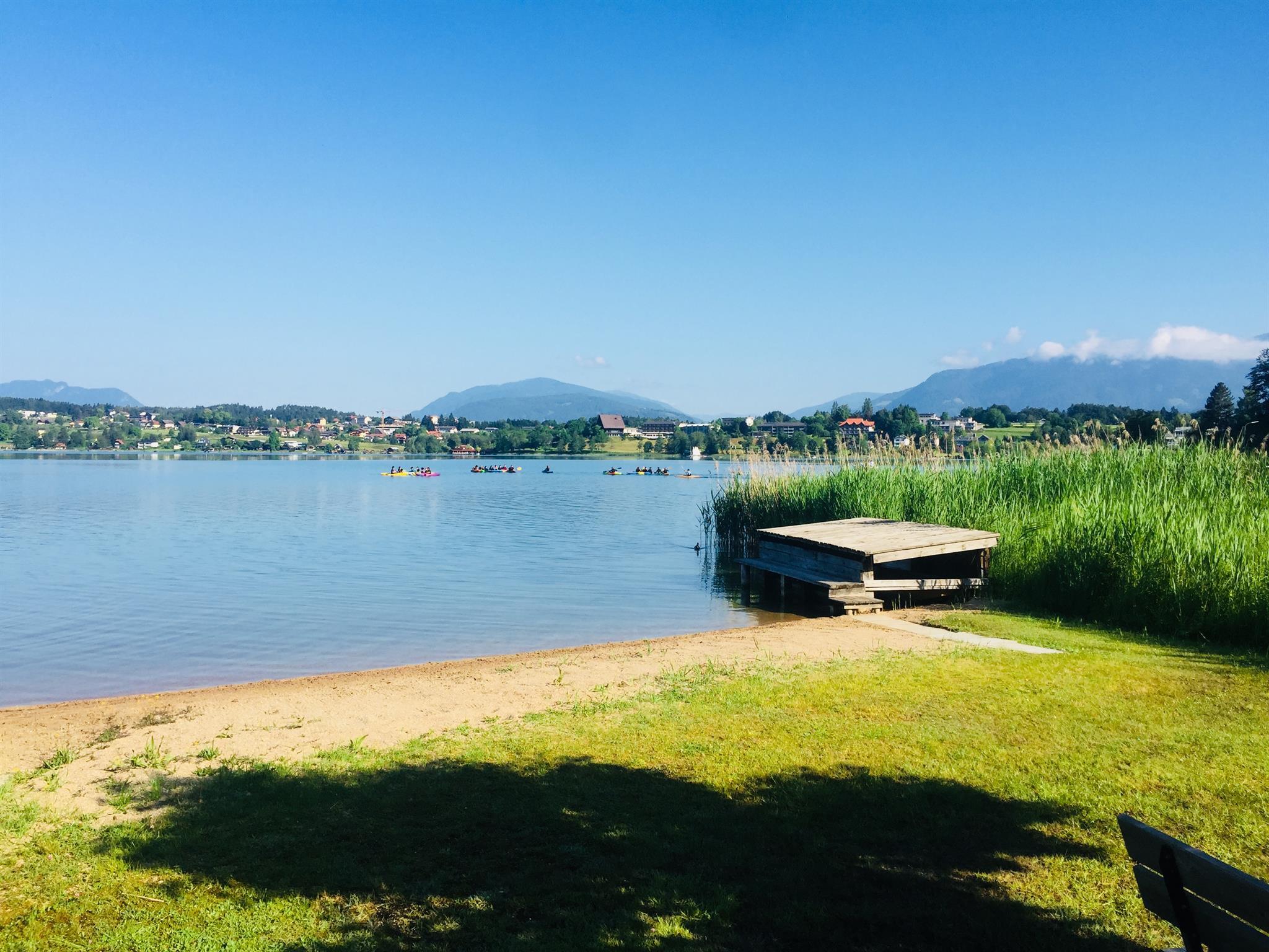 Entspannen Sie sich auf unserer Liegewiese mit kostenlosen Liegen am hauseigenen Badestrand, welcher mit einigen Schritten erreichbar ist und vergessen Sie Ihren Alltagstress. Auch für sportliche Aktivitäten ist gesorgt: Spielen Sie eine Runde Boccia auf unserer Bocciabahn, oder erkunden Sie mit dem für Sie kostenlosen Ruderboot, den herrlich türkisblauen See und genießen die atemberaubende Kulisse der Berge, oder messen Sie sich beim Tischtennis.