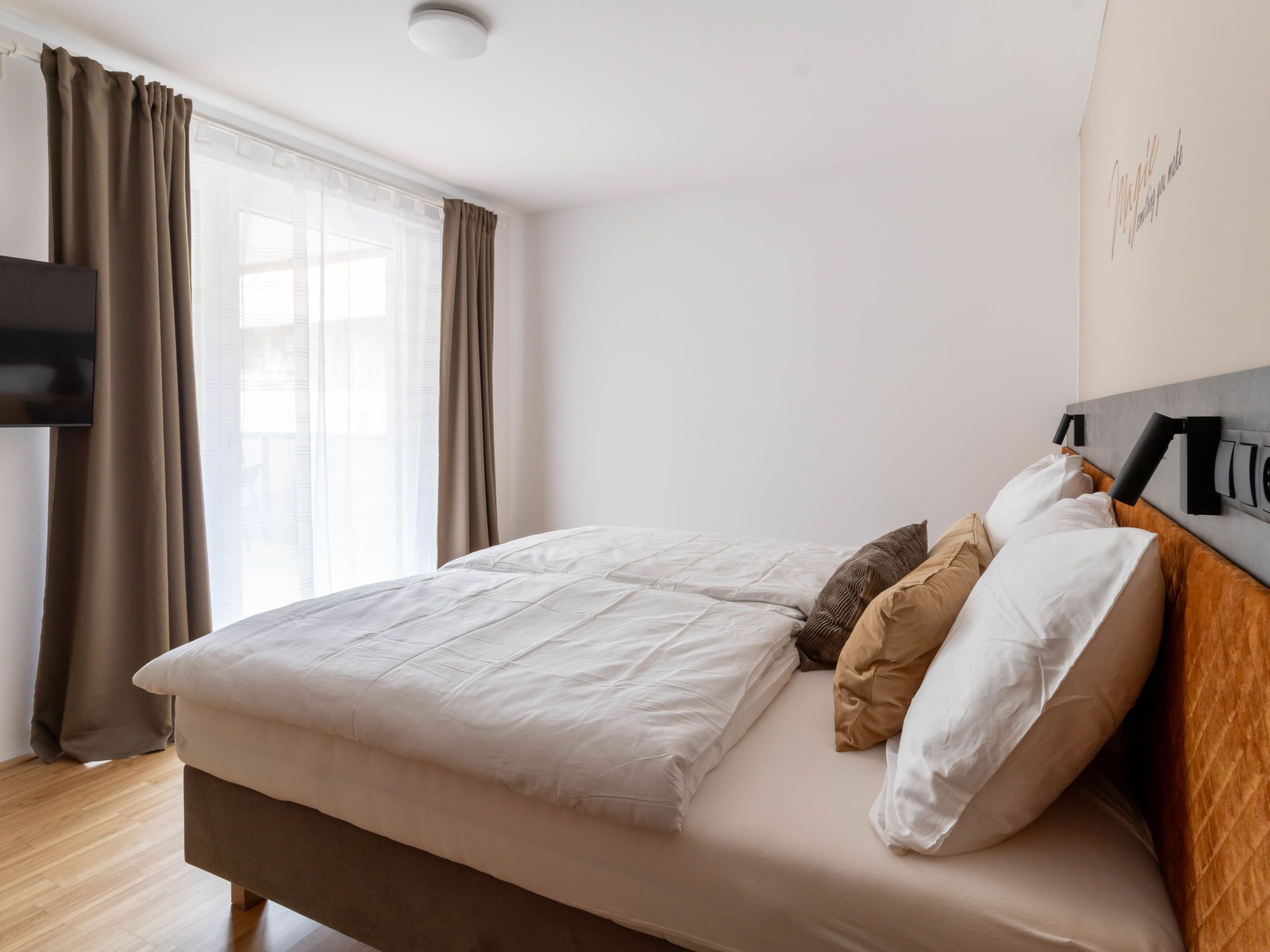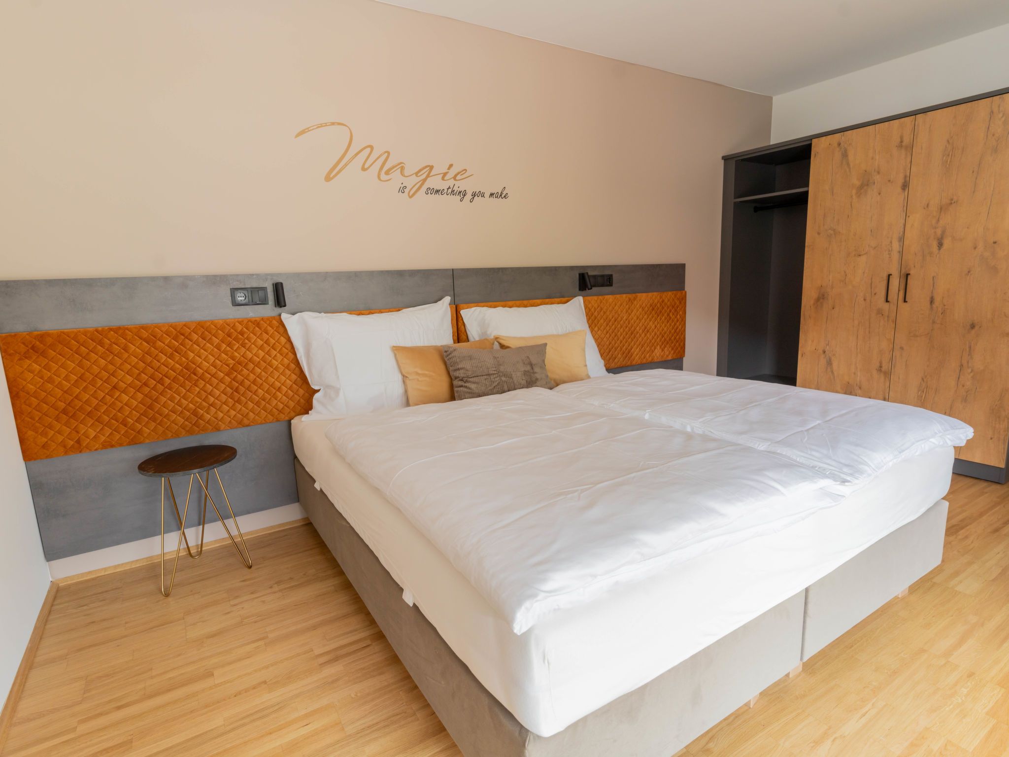 be magic, 2-Zimmer-Wohnung 61 m2, im erhöhten Erdgeschoss. Modern und stilvoll eingerichtet: Eingang. 1 Doppelzimmer mit Sat-TV (Flachbildschirm). Ausgang zur Terrasse. Grosse Wohnküche (Backofen, Geschirrspüler, 4 Glaskeramikplatten, Toaster, Wasserkocher, elektrische Kaffeemaschine, Kapseln für die Kaffeemaschine (Nespresso) extra) mit 1 Doppeldiwanbett (1 x 160 cm, Länge 200 cm), Esstisch und Sat-TV (Flachbildschirm), elektrischem Rollladen. Ausgang zur Terrasse, Richtung Norden. Dusche, sep. WC. Heizung. Parkettboden. Terrasse 14 m2. Balkonmöbel. Seitliche Sicht auf die Berge. Zur Verfügung: Haartrockner. Internet (Wireless LAN, gratis). Garage (1 Auto), Höhe 210 cm. Bitte beachten: Nichtraucher-Unterkunft. Rauchmelder.