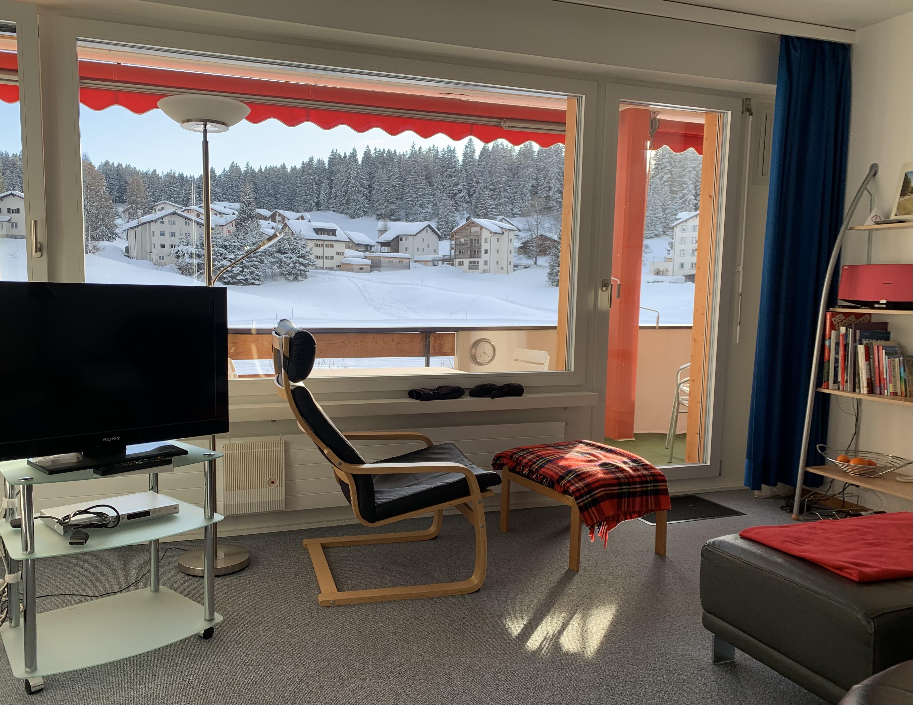 Gemütliche 2.5 - Zimmerwohnung in einem Mehrfamilienhaus im Zentrum von Parpan. Die Wohnung hat ein geschlossenes Schlafzimmer und zwei Schrankbetten im Wohnbereich. Zusätzlich verfügt die Wohnung über einen gedeckten Süd-Balkon.