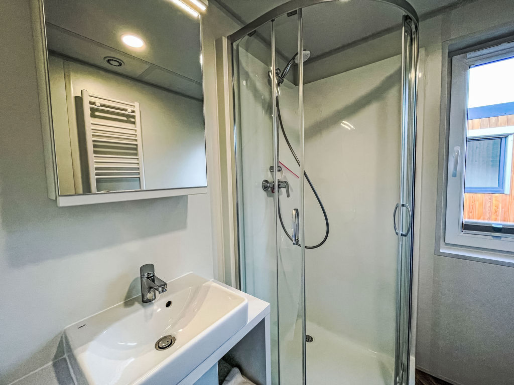 Tiny Haus Villa Sunrise, 3-Zimmer-Mobilheim 32 m2. Gemütlich eingerichtet: Wohnzimmer mit Sat-TV (Flachbildschirm). Ausgang zur Terrasse. 1 Zimmer mit 1 franz. Bett (140 cm, Länge 200 cm). 1 Zimmer mit 2 Betten (80 cm, Länge 200 cm). Kochnische (4 Glaskeramikplatten, Wasserkocher, elektrische Kaffeemaschine). Dusche/WC. E-Heizung. Terrasse. Terrassenmöbel. Zur Verfügung: Haartrockner. Parkplatz (1 Auto) in 30 m. Bitte beachten: Nichtraucher-Haus. Rauchmelder.