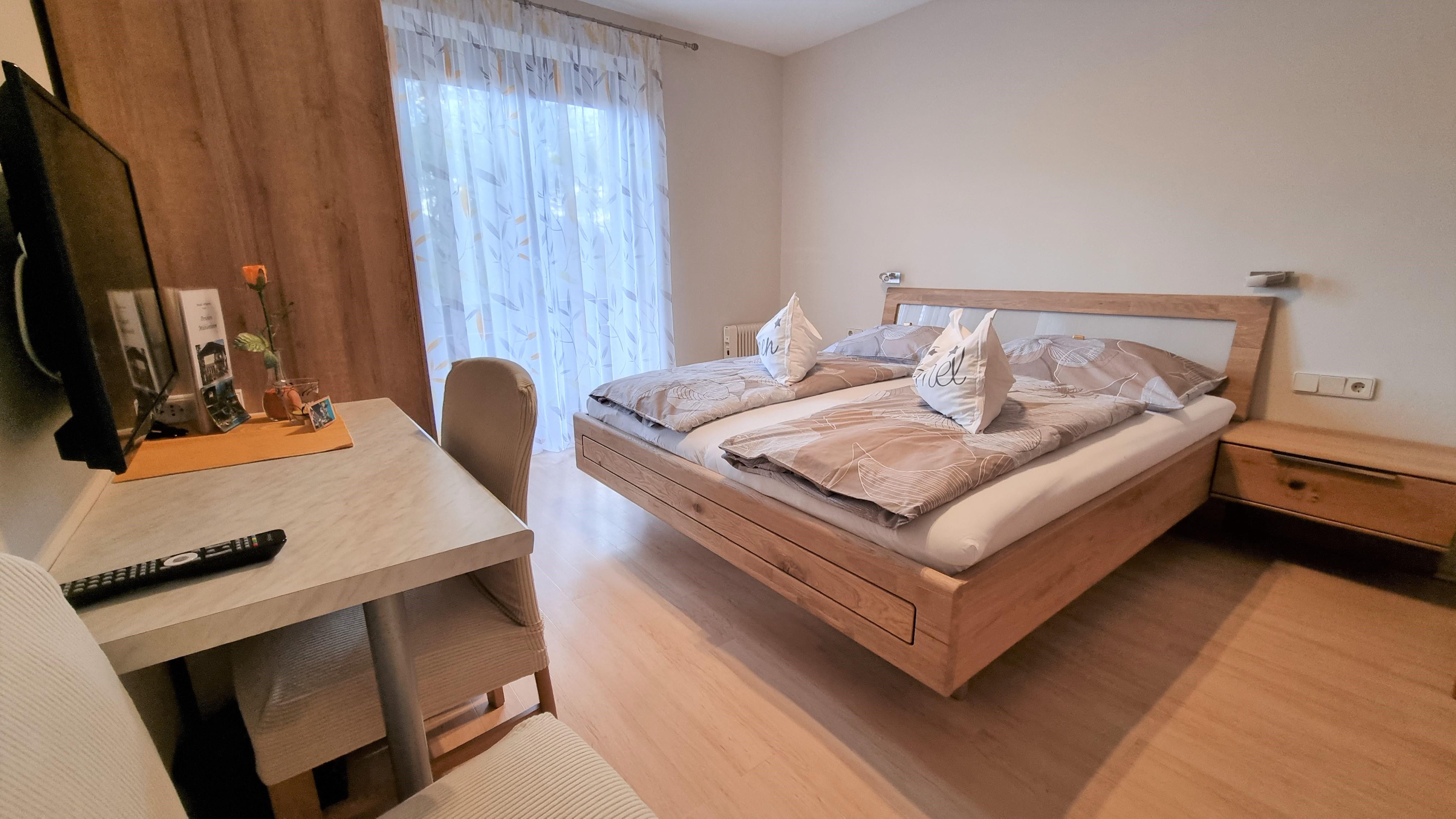 Doppelzimmer 14m2, mit DU/WC mit Fön, SAT/TV, Kühlschrank und Süd-Balkon mit Gartenmöbeln ausgestattet.
