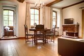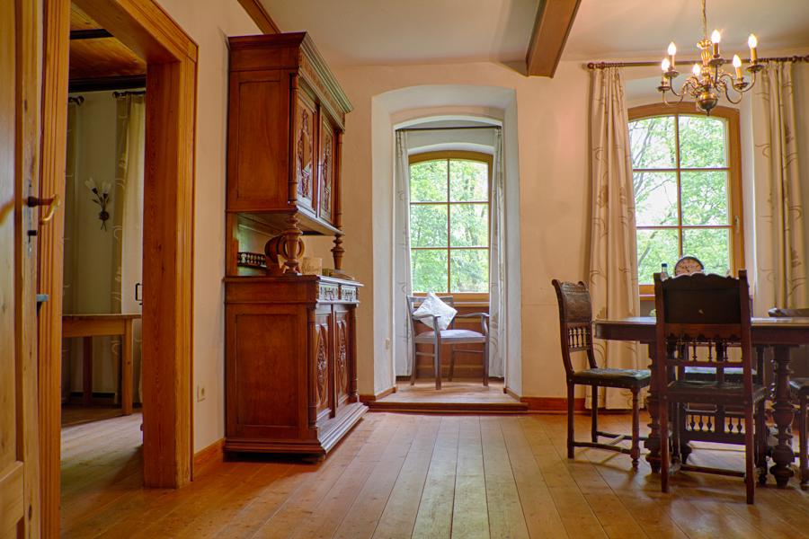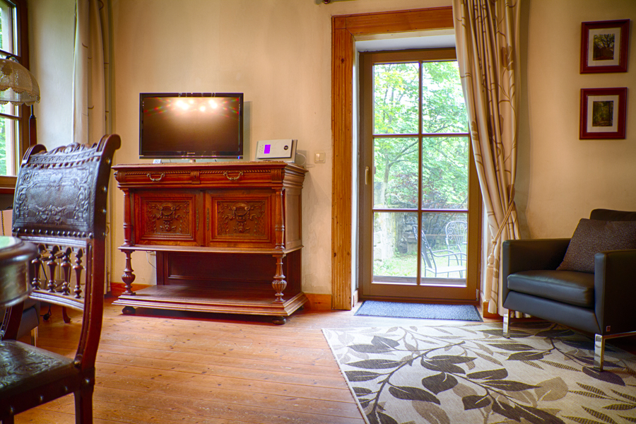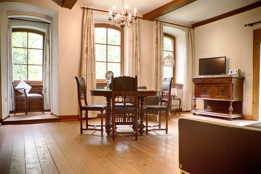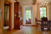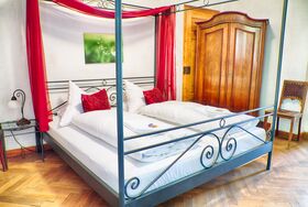 Die Ferienwohnung „Schlossgarten“ bietet auf 65 m² Platz für bis zu 4 Personen und befindet sich im Erdgeschoss des Haupthauses. Die Wohnung verfügt über zwei Schlafräume, von denen einer mit einem Doppelbett und einer mit einem Etagenbett ausgestattet ist. Die Küchenzeile mit Backofen, Geschirrspüler, Kaffee- und Teekocher, Kühlschrank, Mikrowelle und Toaster lässt keine Wünsche offen. Das Badezimmer rundet das Gesamtbild der Wohnung ab. Das WLAN und den Parkplatz können Sie gerne kostenfrei nutzen.