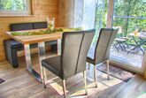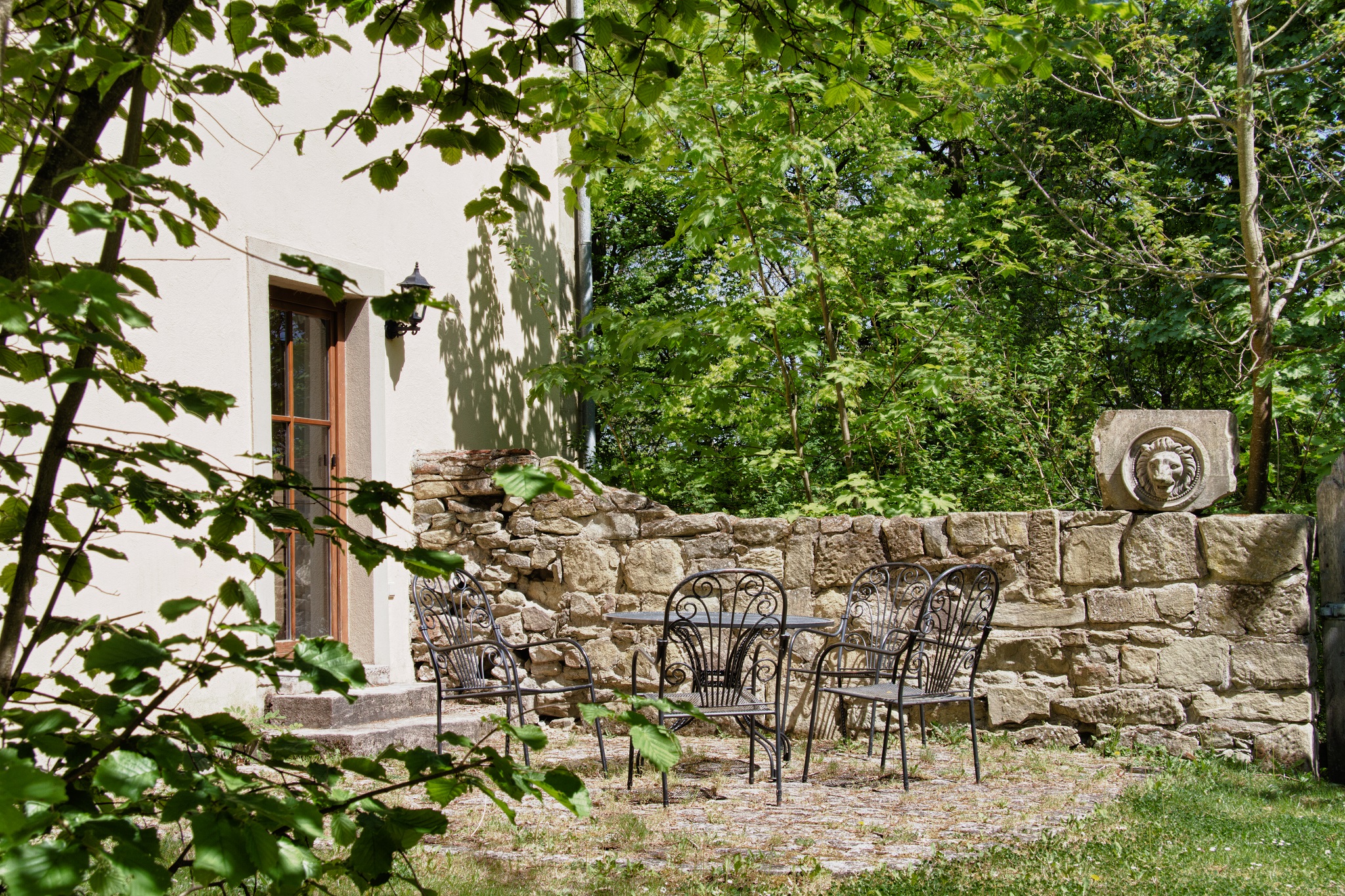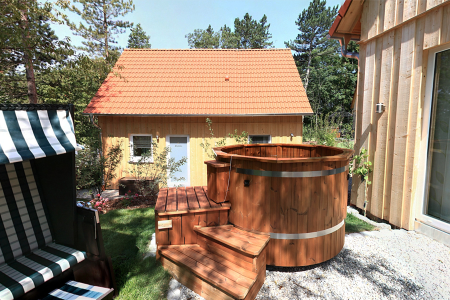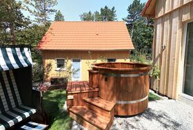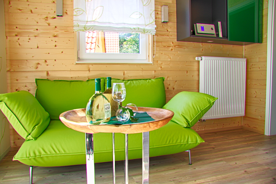 Das in grün gehaltene Haus, von Weinstöcken umgeben, bietet auf der Kiesterrasse neben der Holzgarnitur einen Strandkorb der Extraklasse. Hier können Sie ein Glas Frankenwein genießen oder nach dem Baden im Whirlpool ruhen. Sie schlafen himmlisch im Bett mit Baldachin, der Sie heimelich umhüllt. Das Ferienhaus bietet auf 70 m² Platz für bis zu 5 Personen. Die voll ausgestattete, moderne Küche mit Kühlschrank, Spülmaschine, Herd, Backofen, Wasserkocher und Kaffeemaschine lässt keine Wünsche offen und lädt zu gemütlichen Kochabenden ein. Das WLAN und den Parkplatz können Sie gerne kostenfrei nutzen.