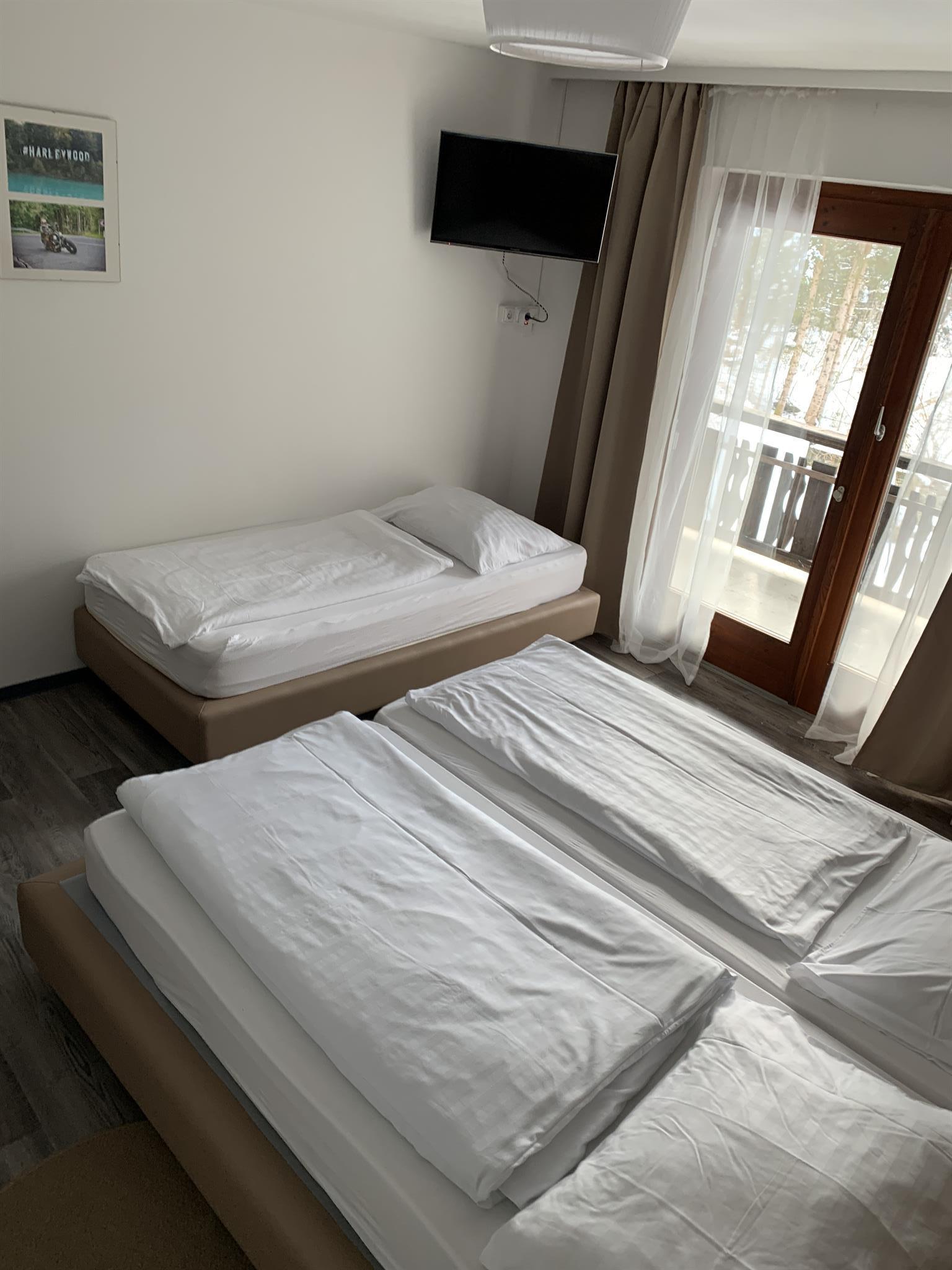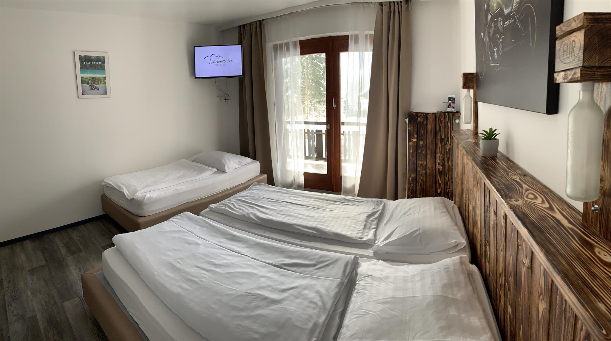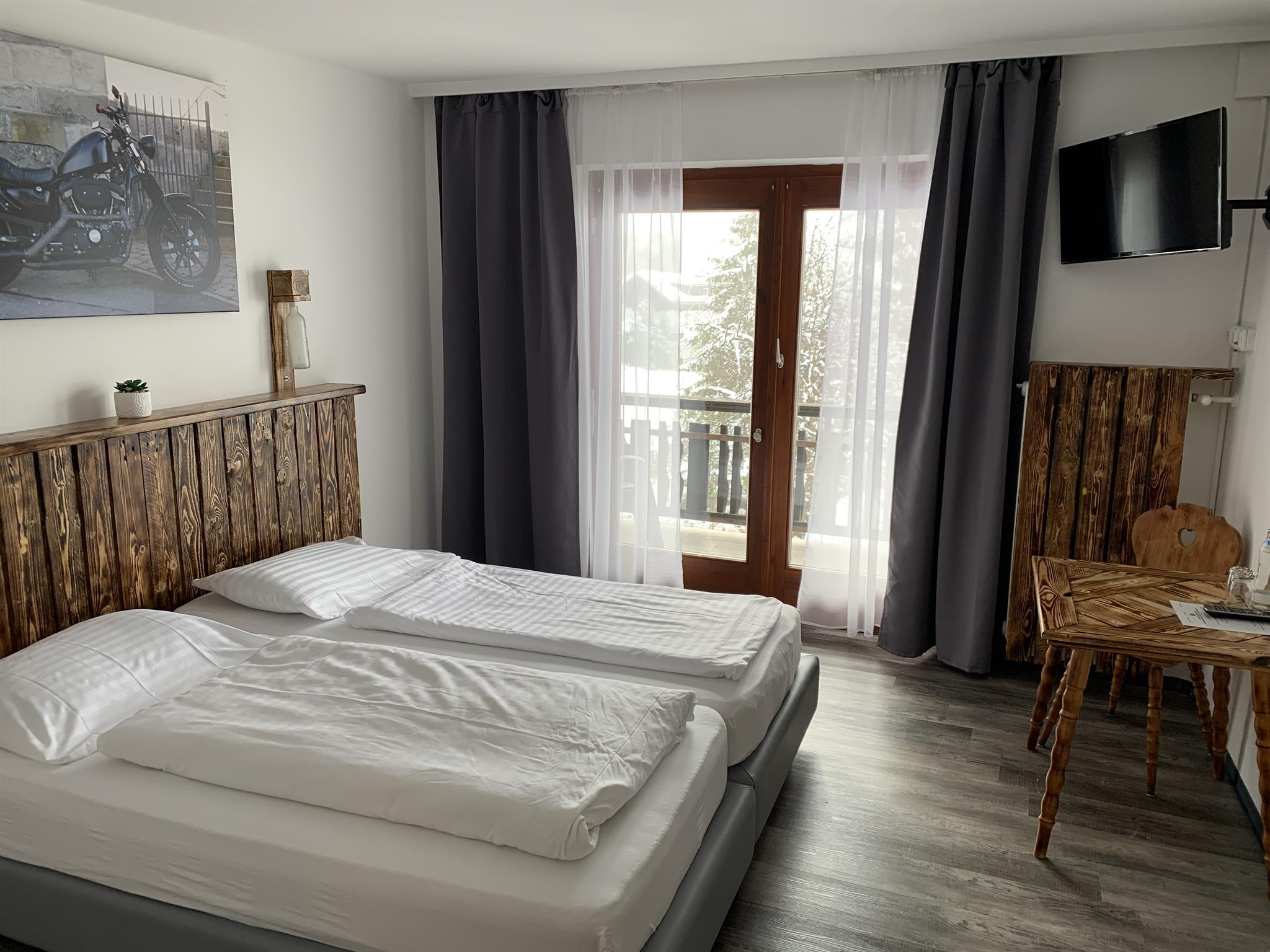Unsere neu gestalteten Comfort Zimmer beinhalten jeweils ein Doppel Boxspringbett oder zursätzlich noch ein Einzelboxspringbett. Jedes Zimmer verfügt über einen Balkon, sowie ein Sitzgelegenheit im Zimmer. Im großen privaten Duschbad finden Sie Körperpflegeprodukte sowie Handtücher und einen Haarföhn. Natürlich befindet sich auch auf jedem Zimmer ein TV. WLAN ist im ganzen Haus kostenfrei verfügbar.
