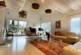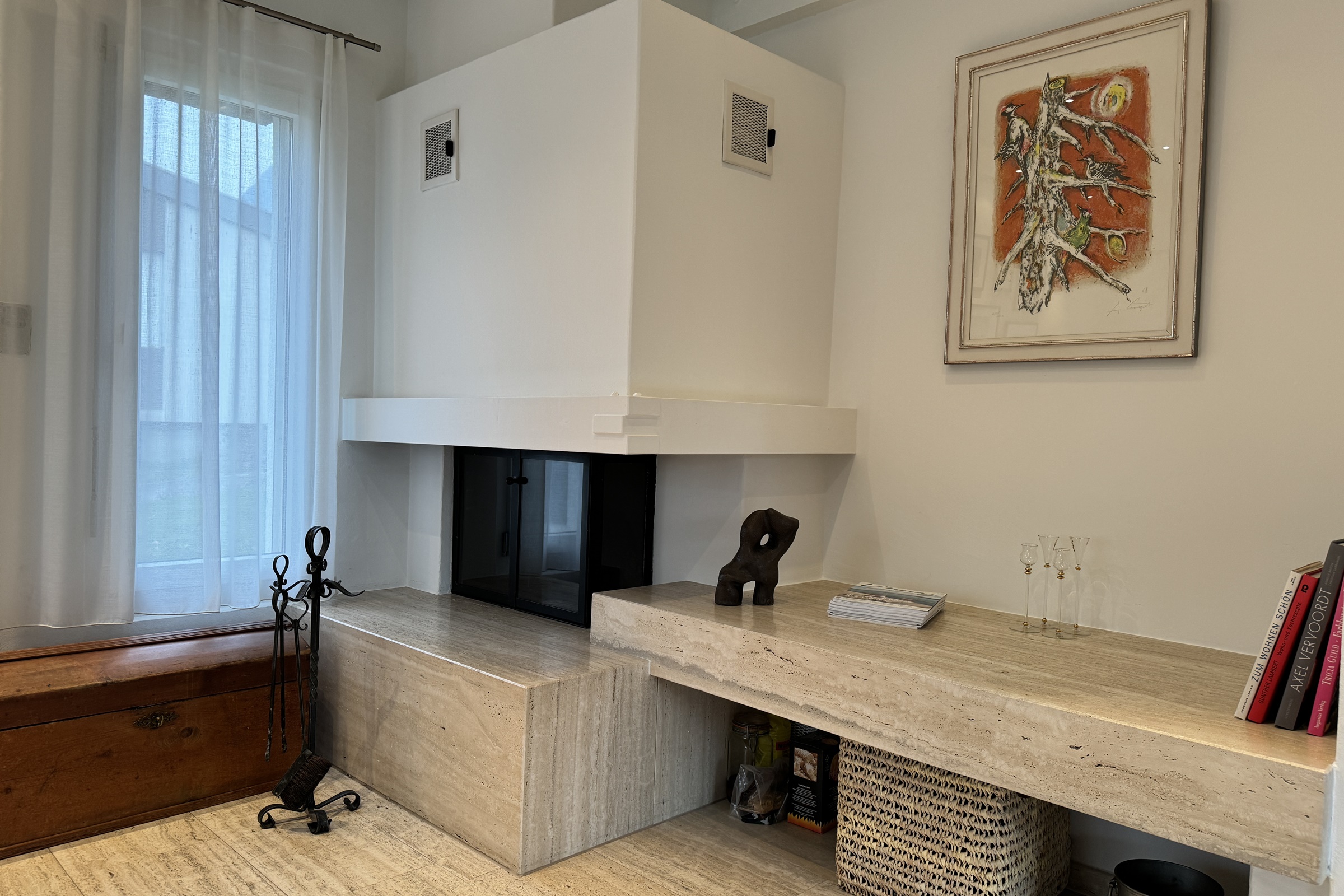 Das grosszügige Wohnzimmer verfügt über ein Sofa, Cheminée und ein Essbereich mit Sitzgelegenheit. Küche