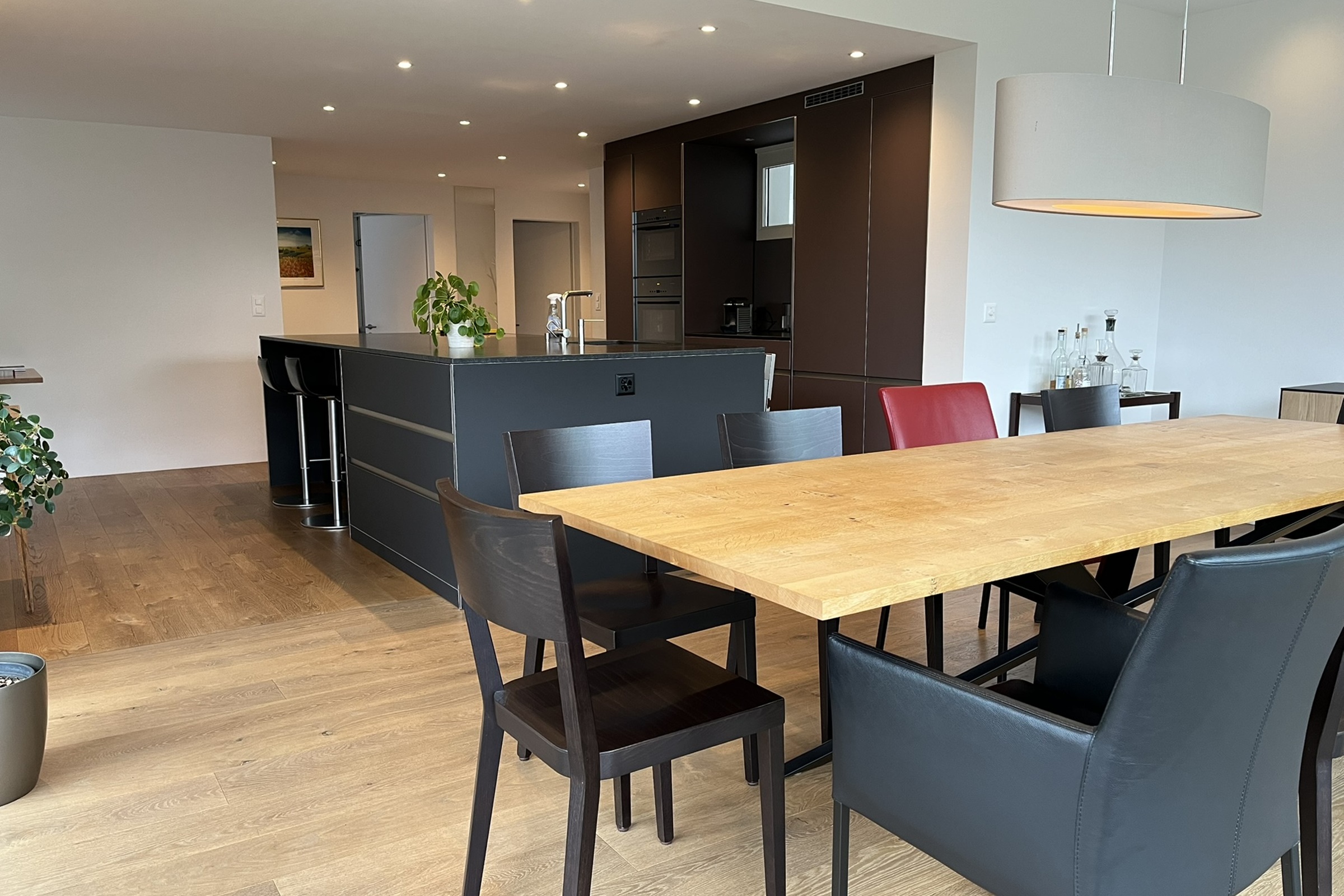 Die offene Küche ist vollausgestattet und verfügt über Induktionsherd, Kombi Steamer, Backofen, Kühlschrank, Gefrierschrank, Geschirrspülmaschine und Nespresso-Kaffeemaschine. Inneneinrichtung