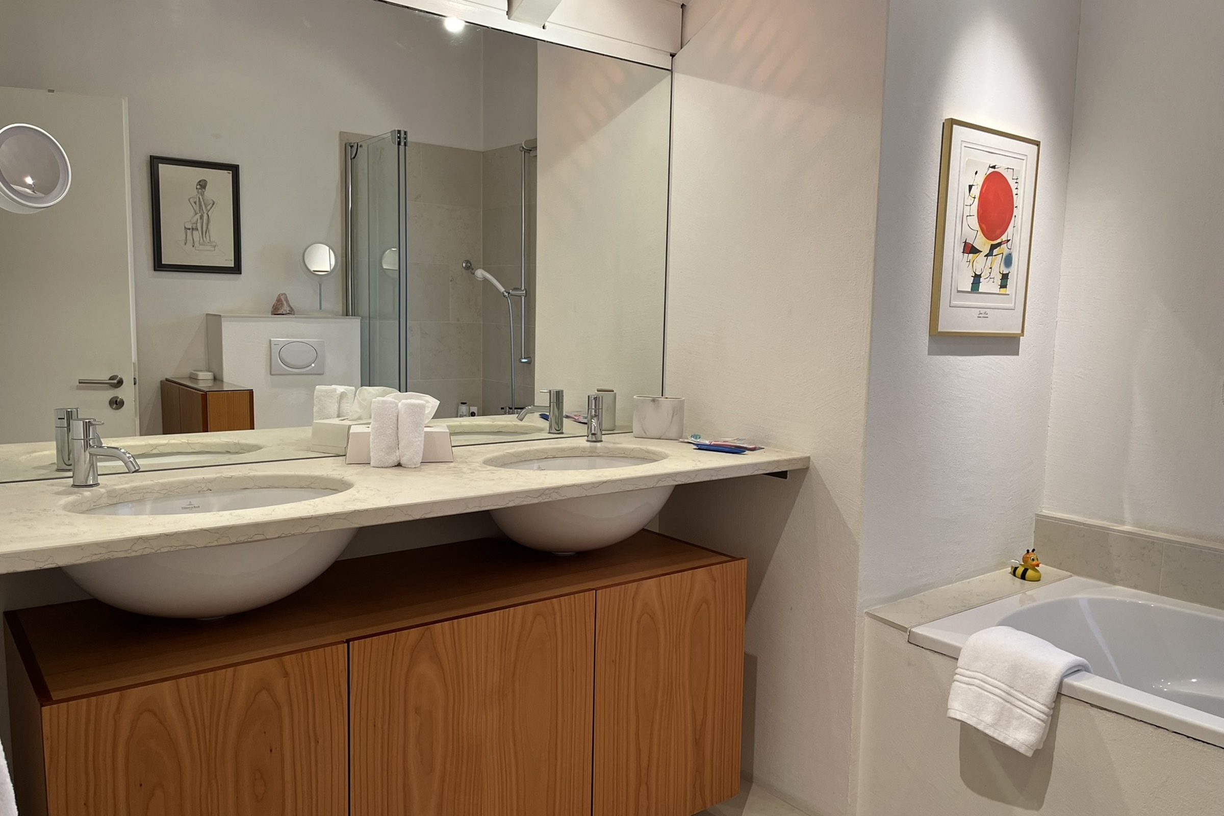 3 Schlafzimmer mit jeweils einem Doppelbett. Ein Schlafzimmer verfügt zusätzlich über ein Ankleidezimmer. Badezimmer