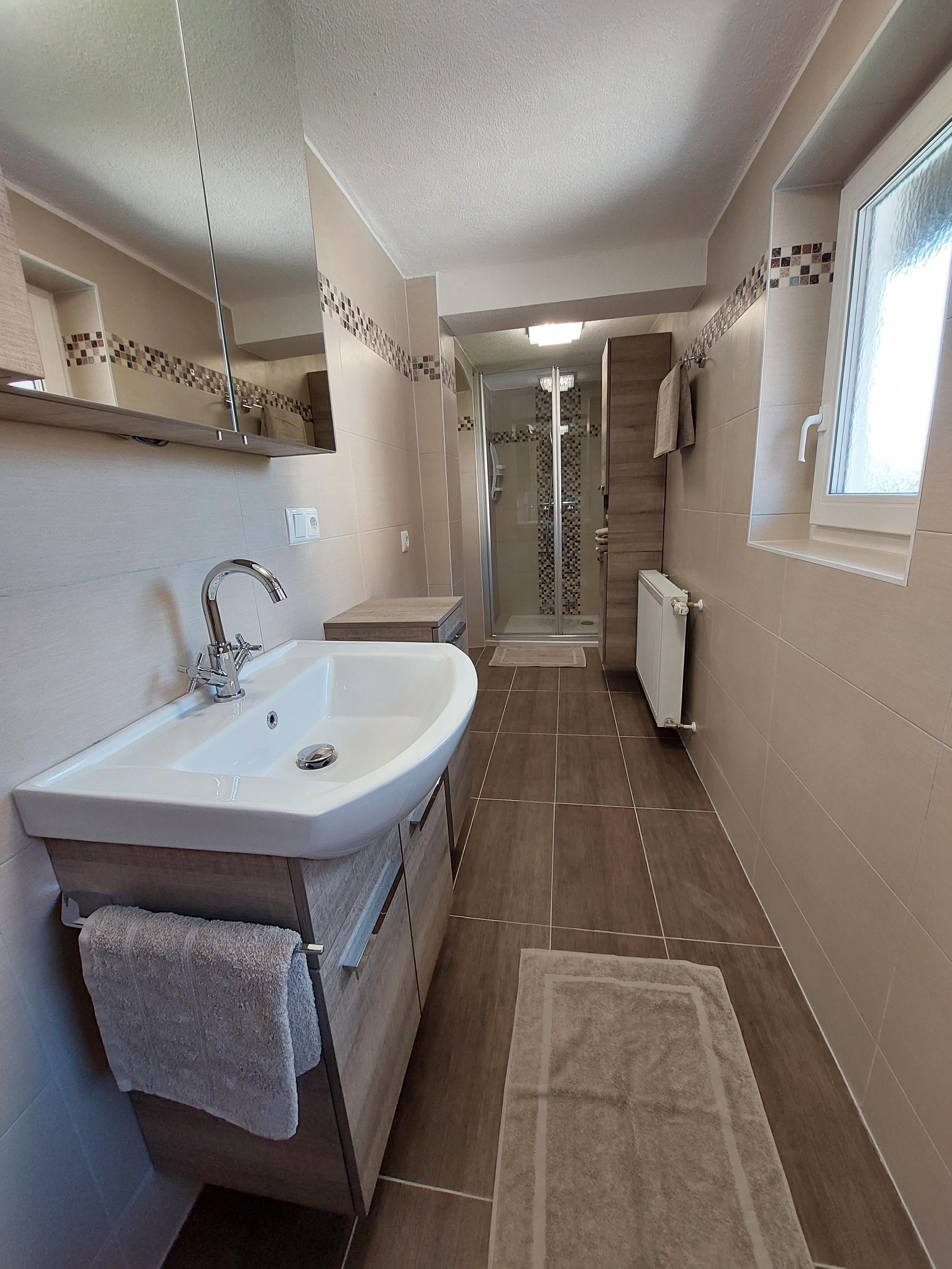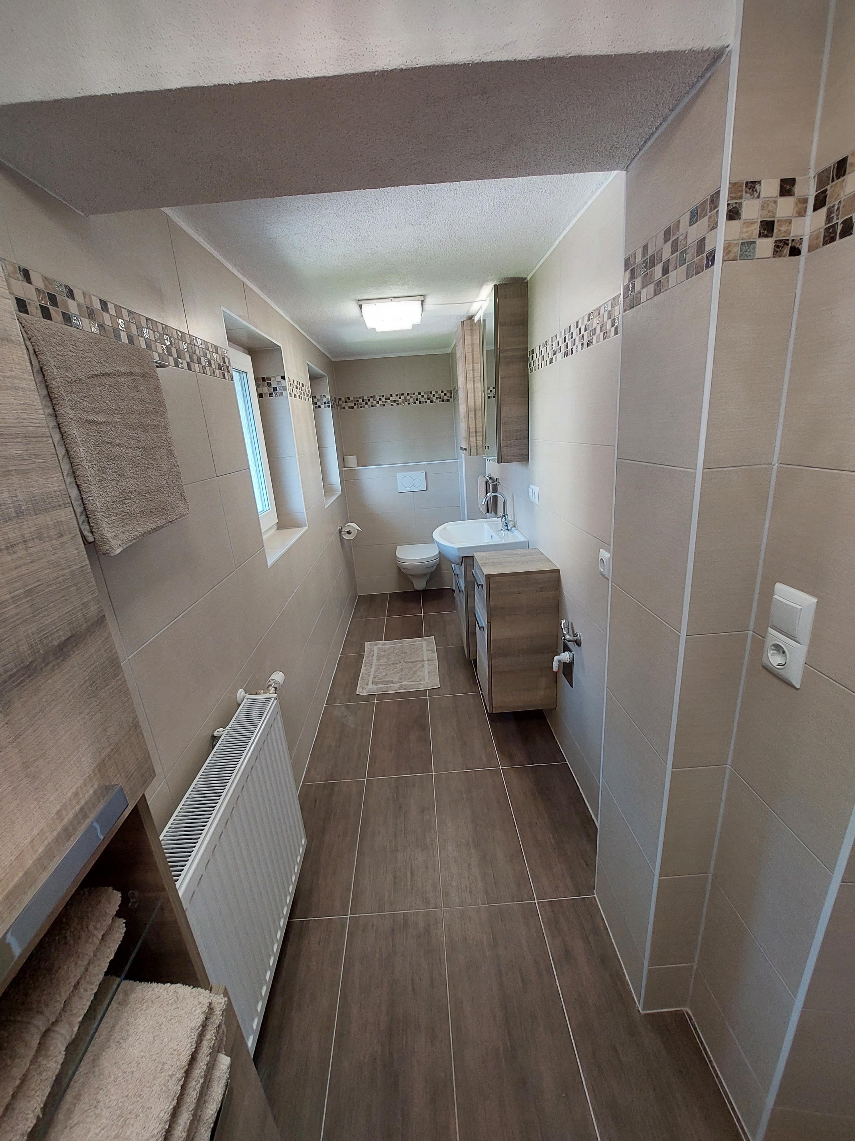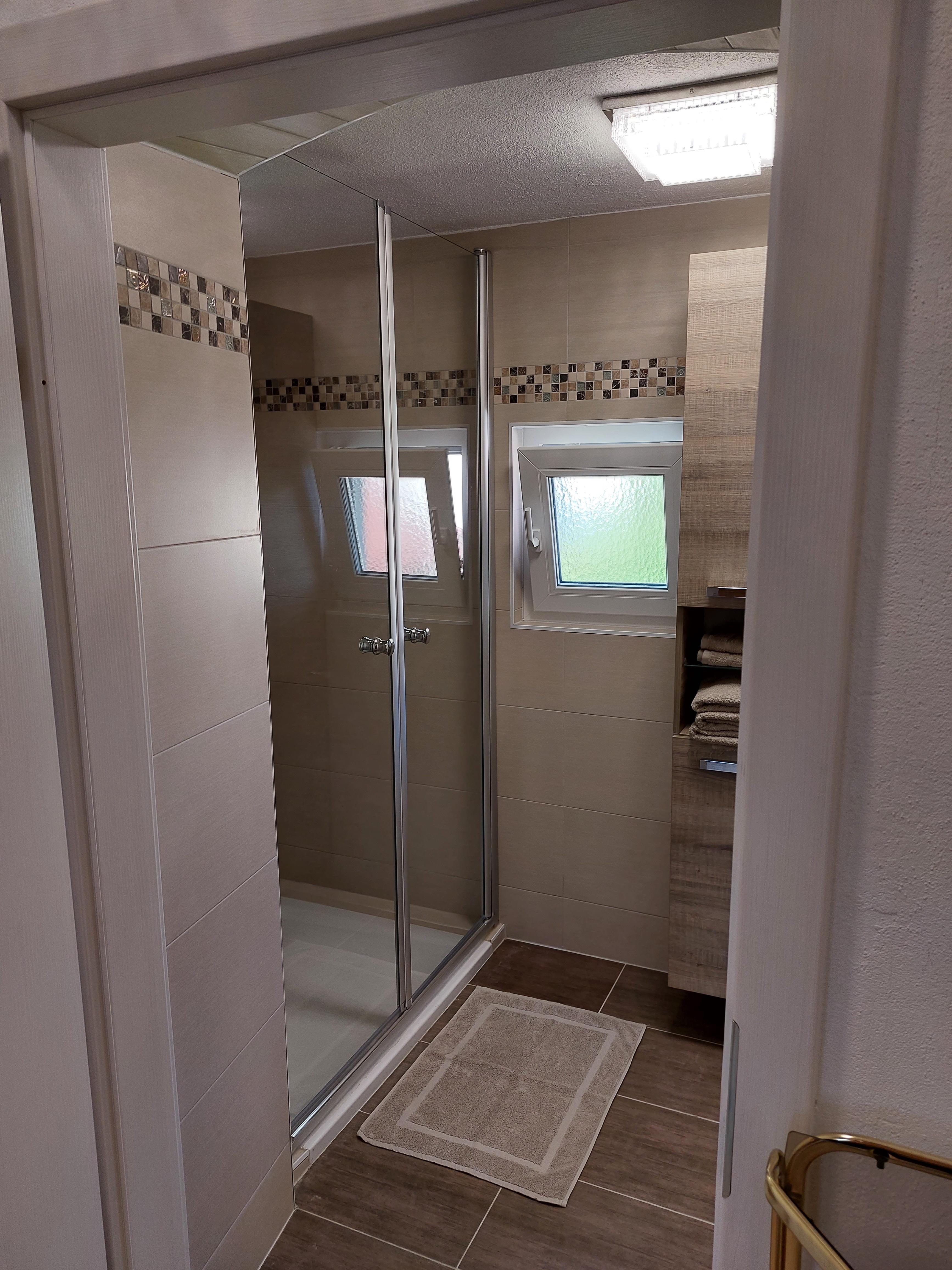 1 Badezimmer mit großer Dusche, Fenster, und einem WC