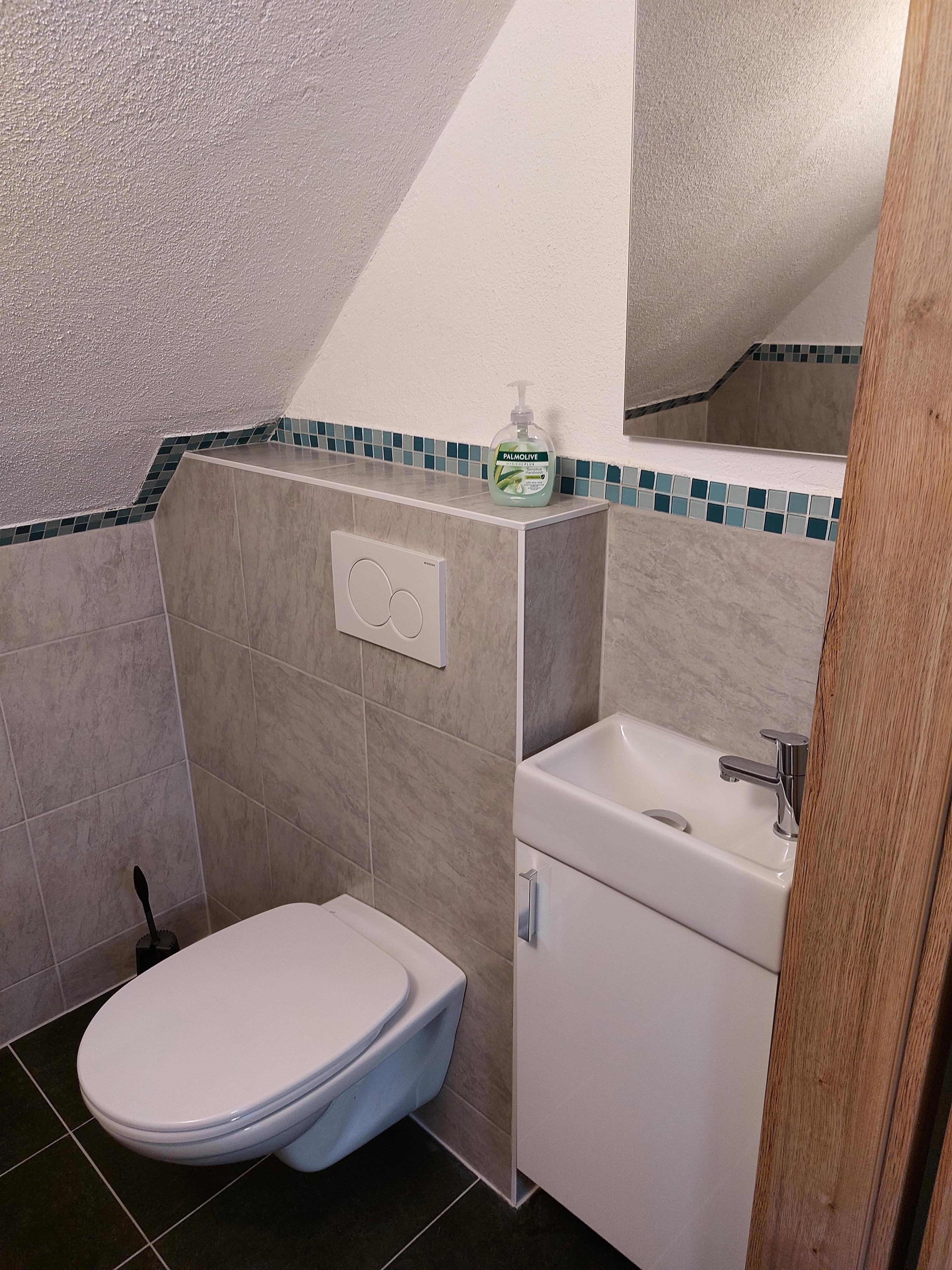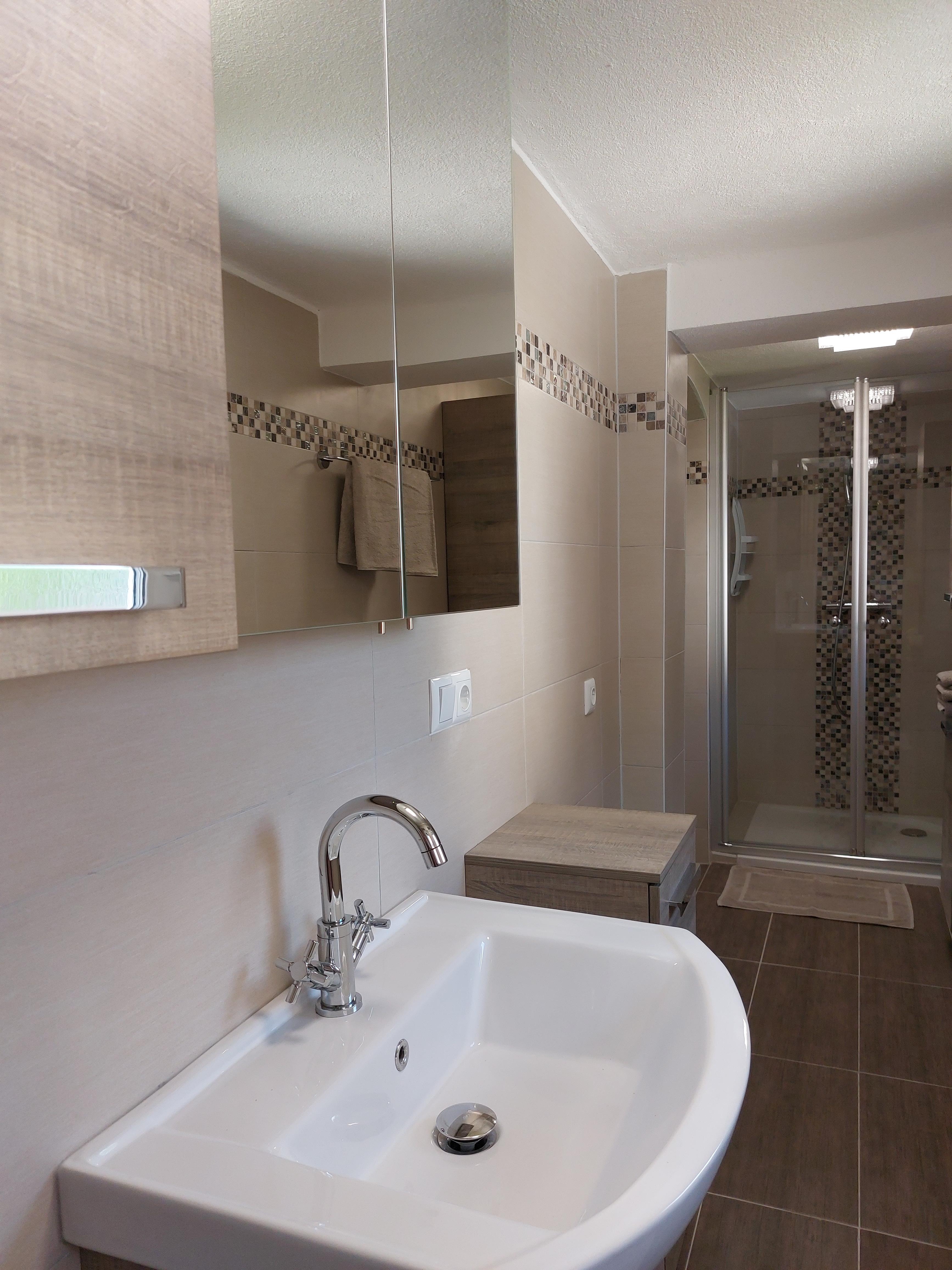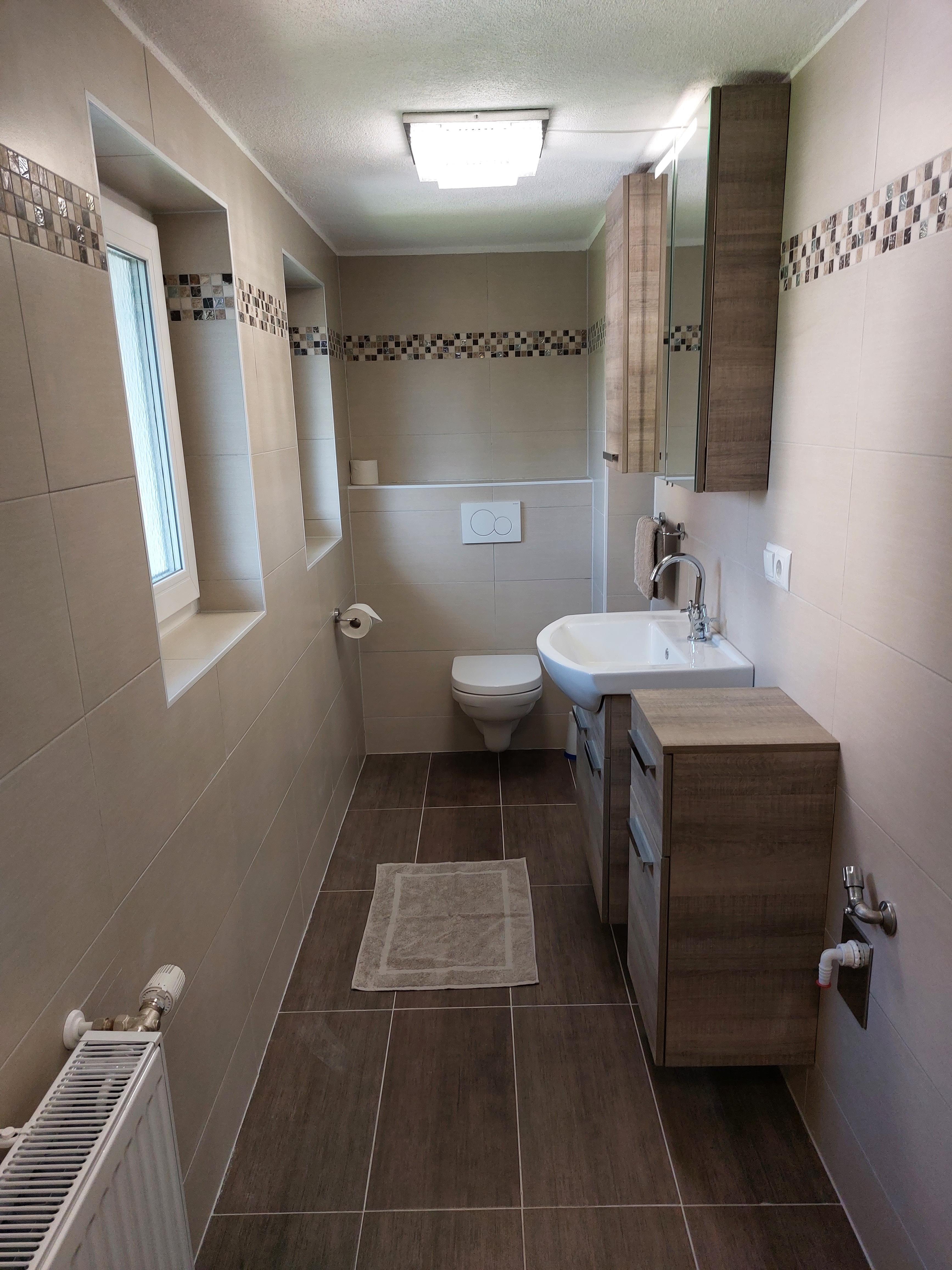1 Badezimmer mit großer Dusche, Fenster, und einem WC