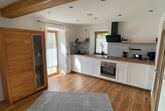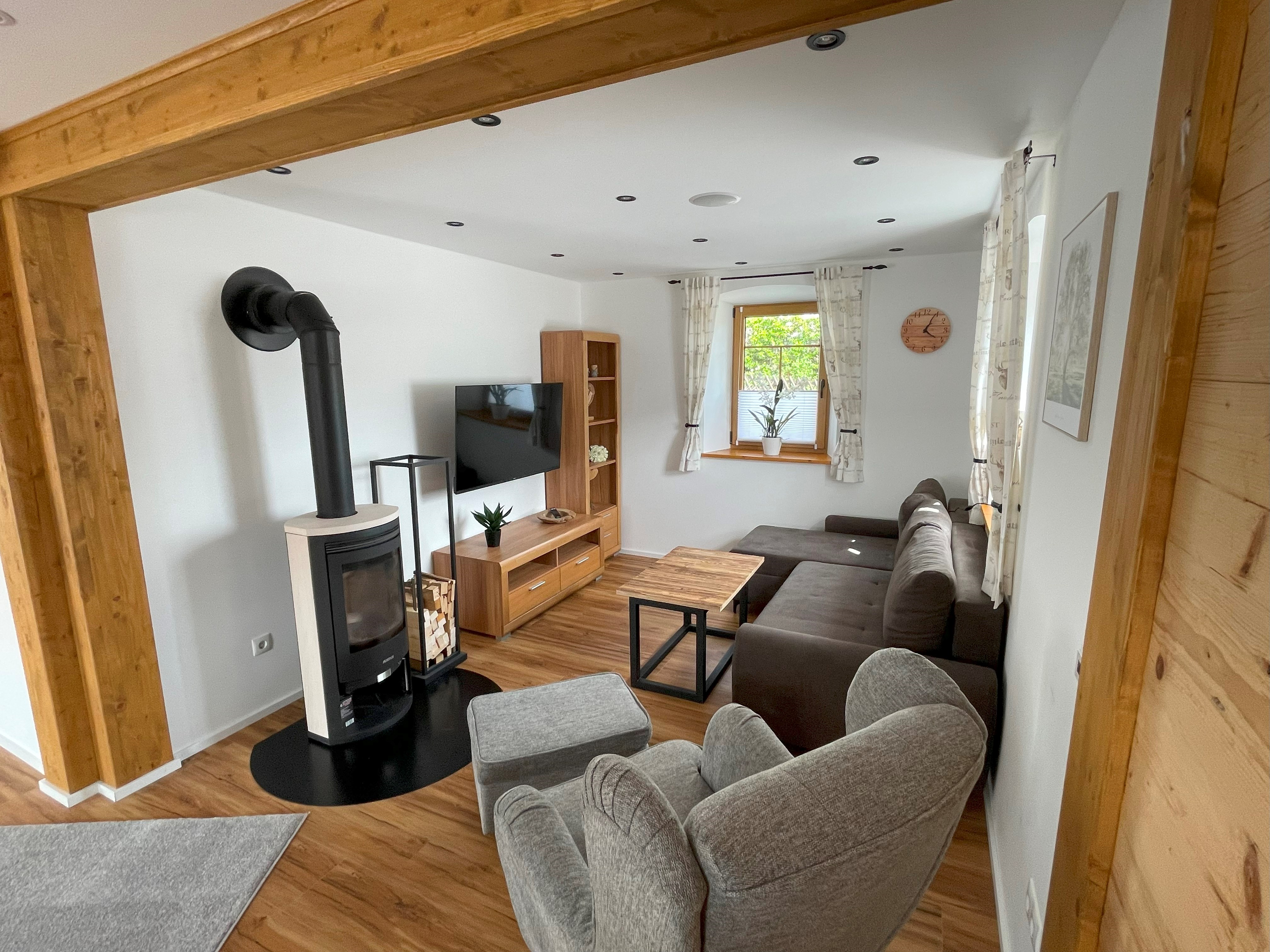 Im EG befindet sich der Hausflur mit Garderobe sowie ein kleiner Abstellraum mit integrierter Waschmaschine. Der offen gestaltete Wohn-, Ess-, und Küchenbereich lädt zum gemeinsamen Frühstück und Abendessen ein, ein kleiner Schwedenofen sorgt im Winter für mollige Wärme, der Wohn-, Essbereich verfügt noch zusätzlich über eine Fußbodenheizung.