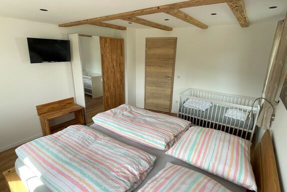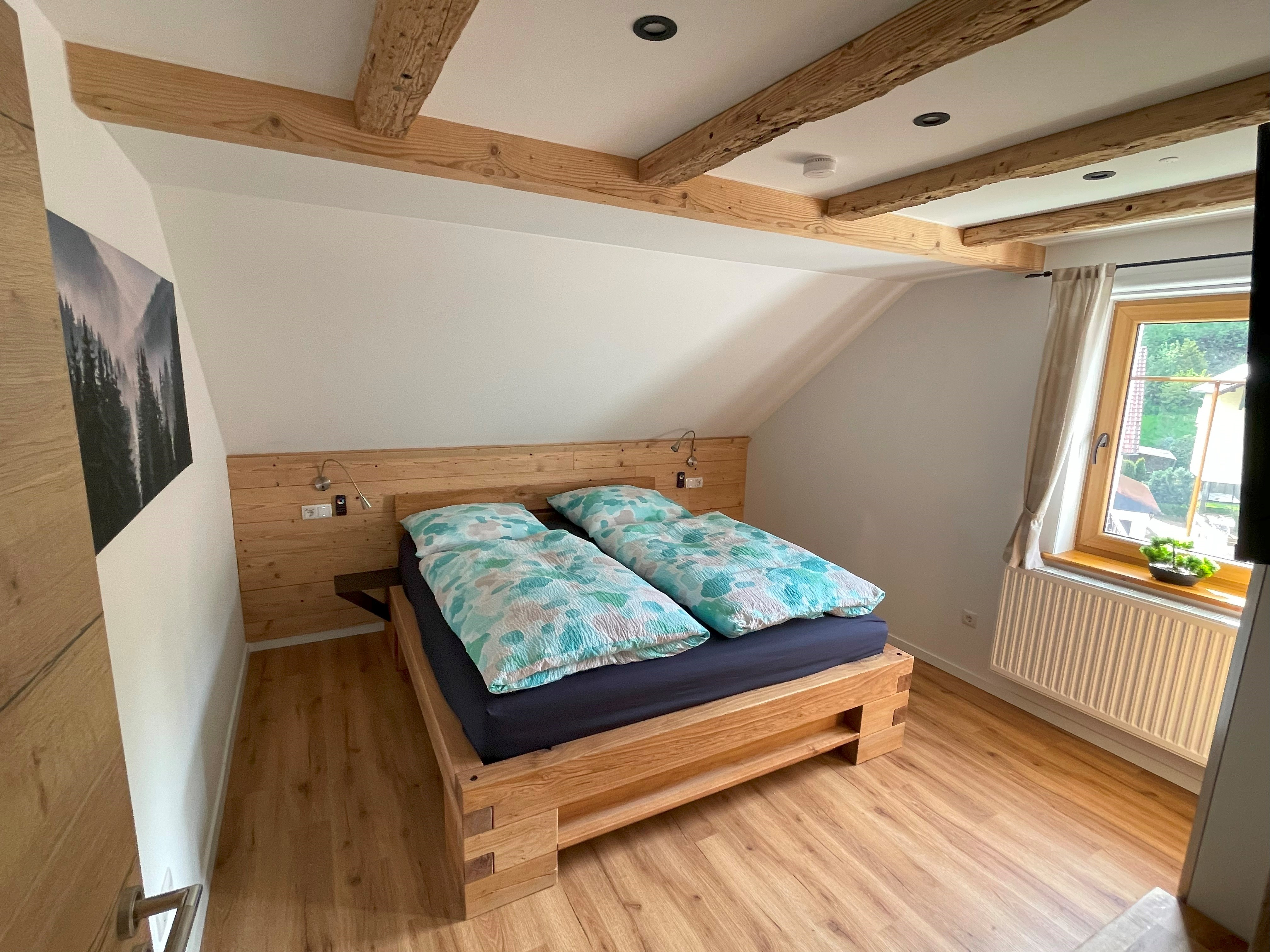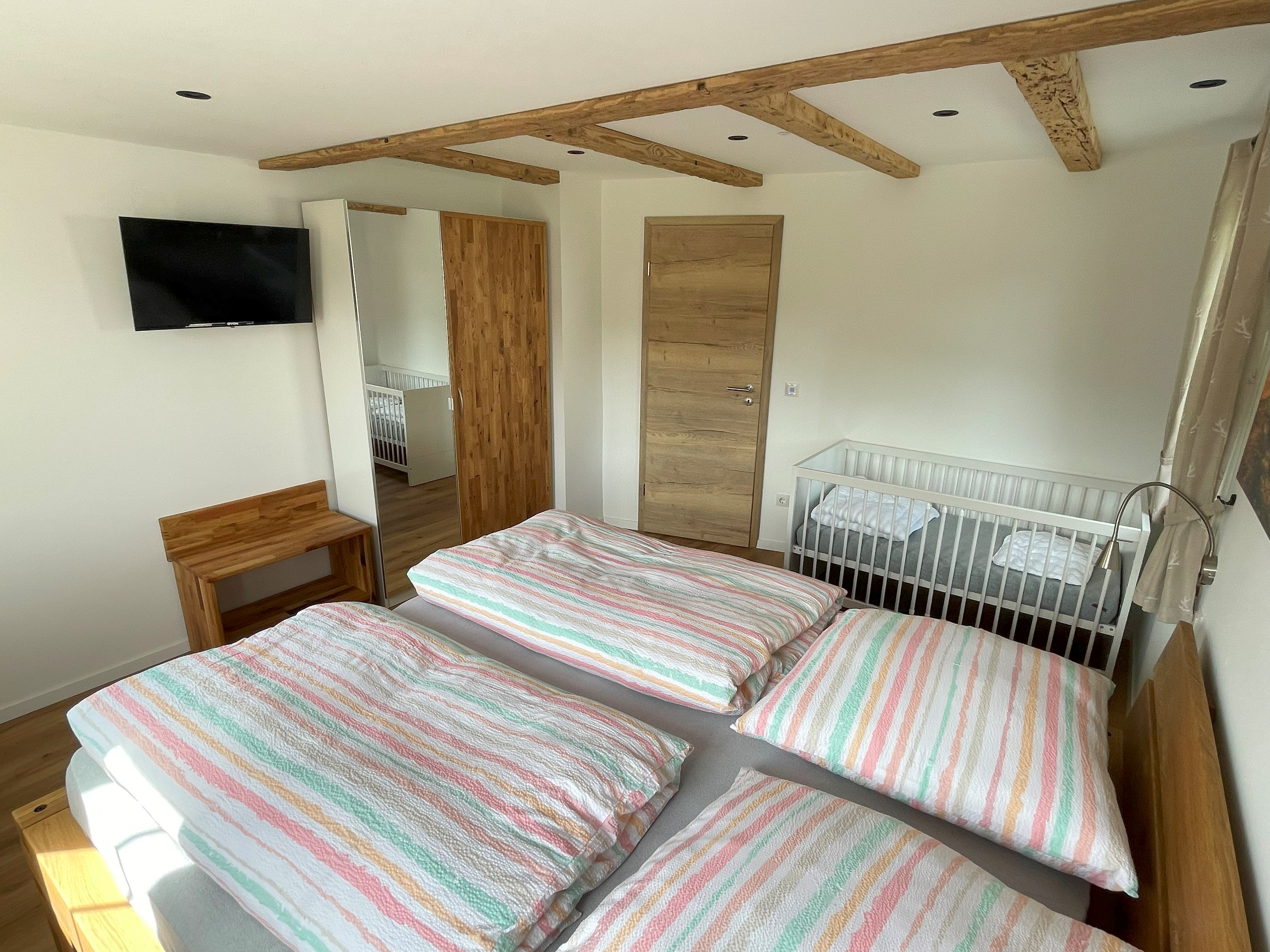 Schlafzimmer 1 ist mit einem Doppelbett aus Eiche Massivholz ausgestattet, sowie einen Kinderbeistellbett.