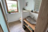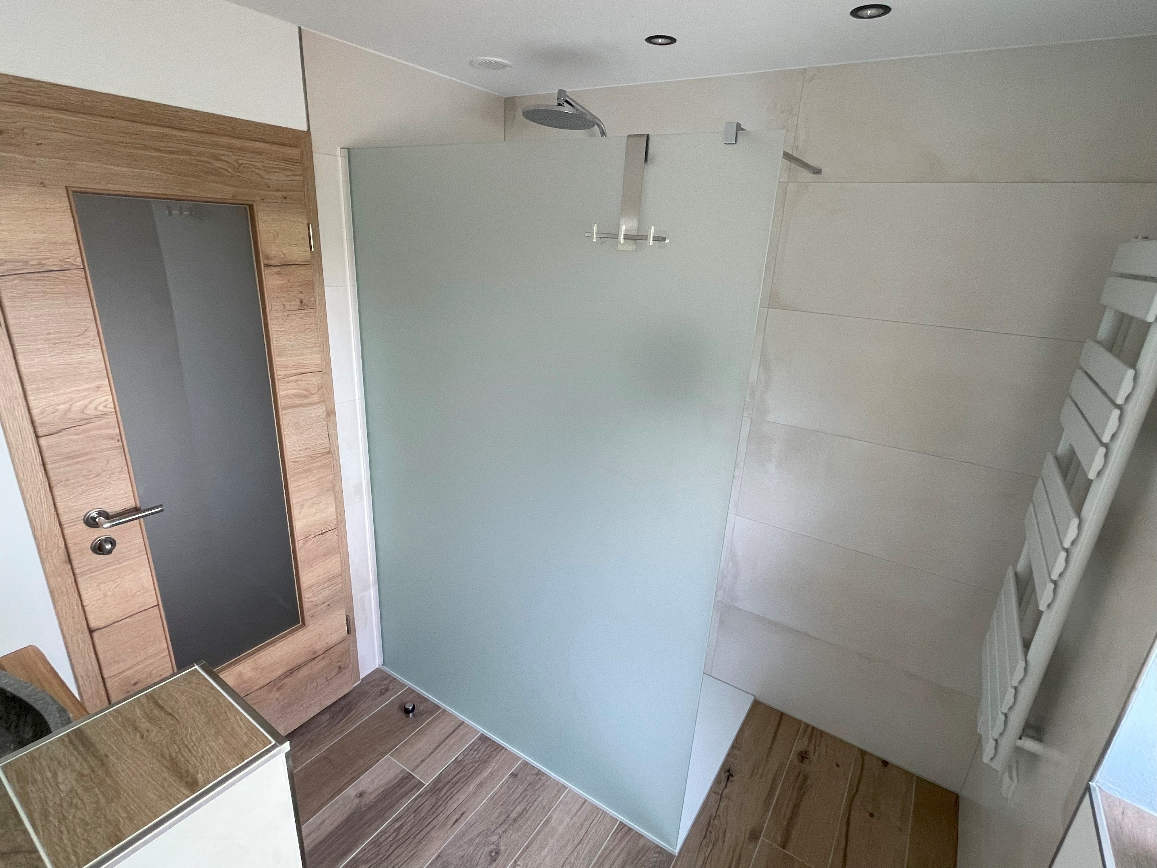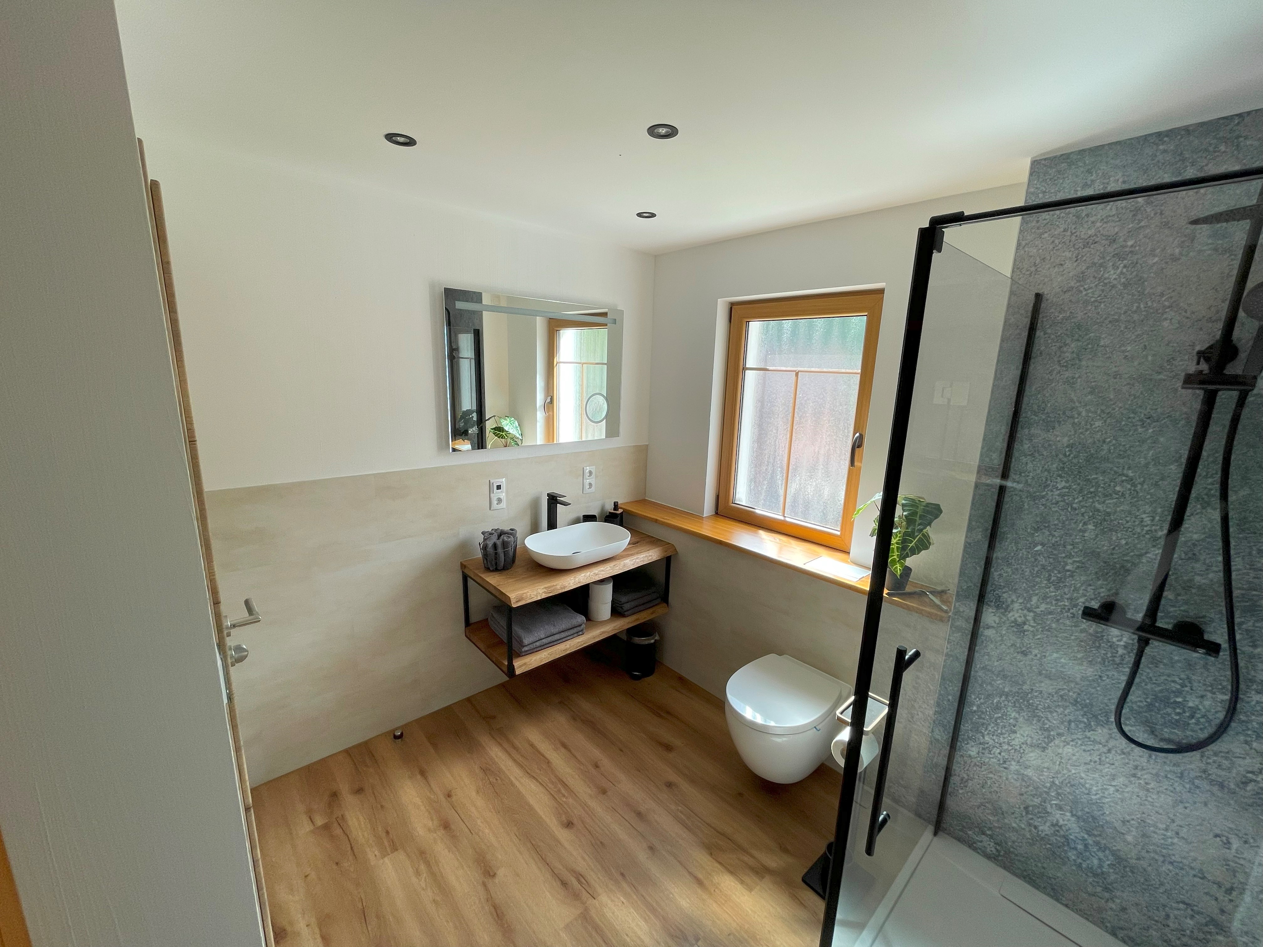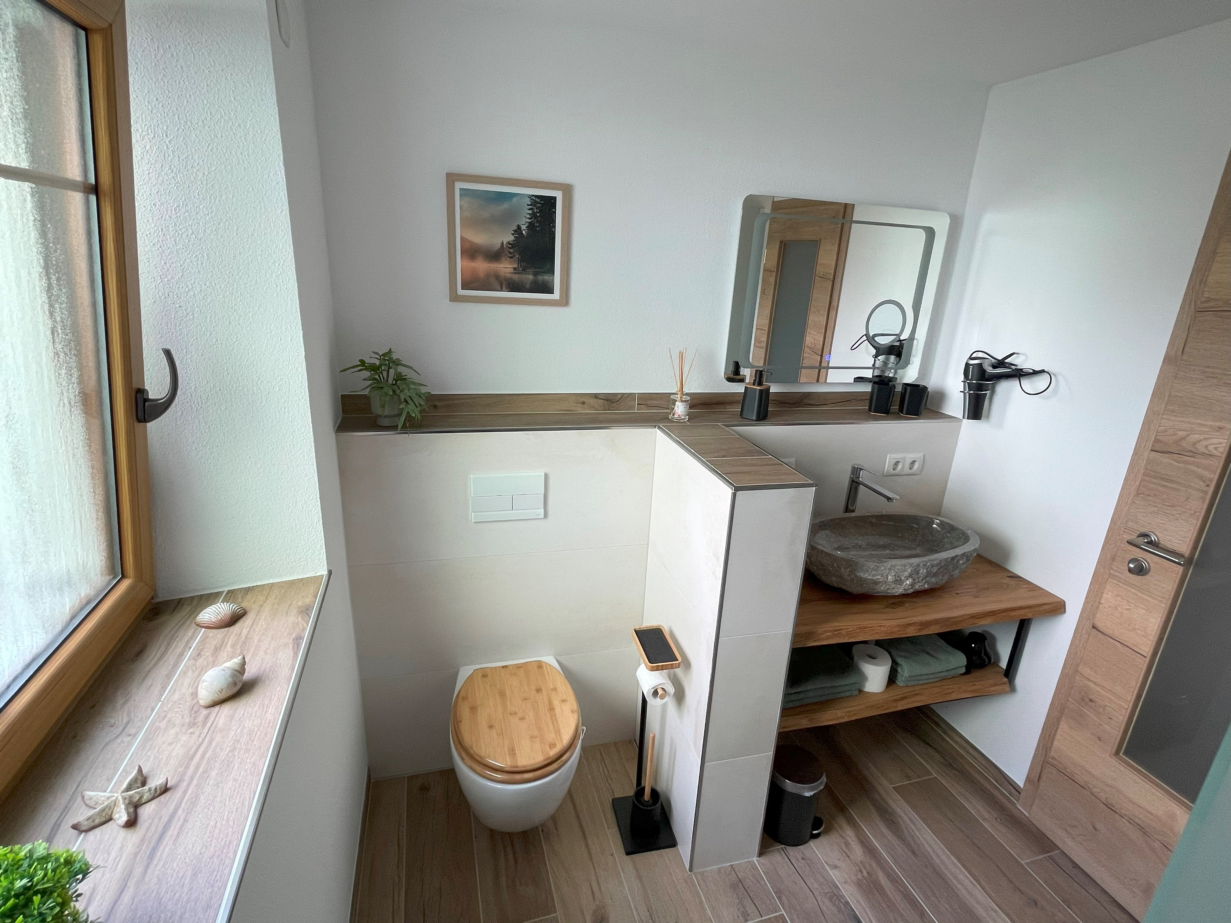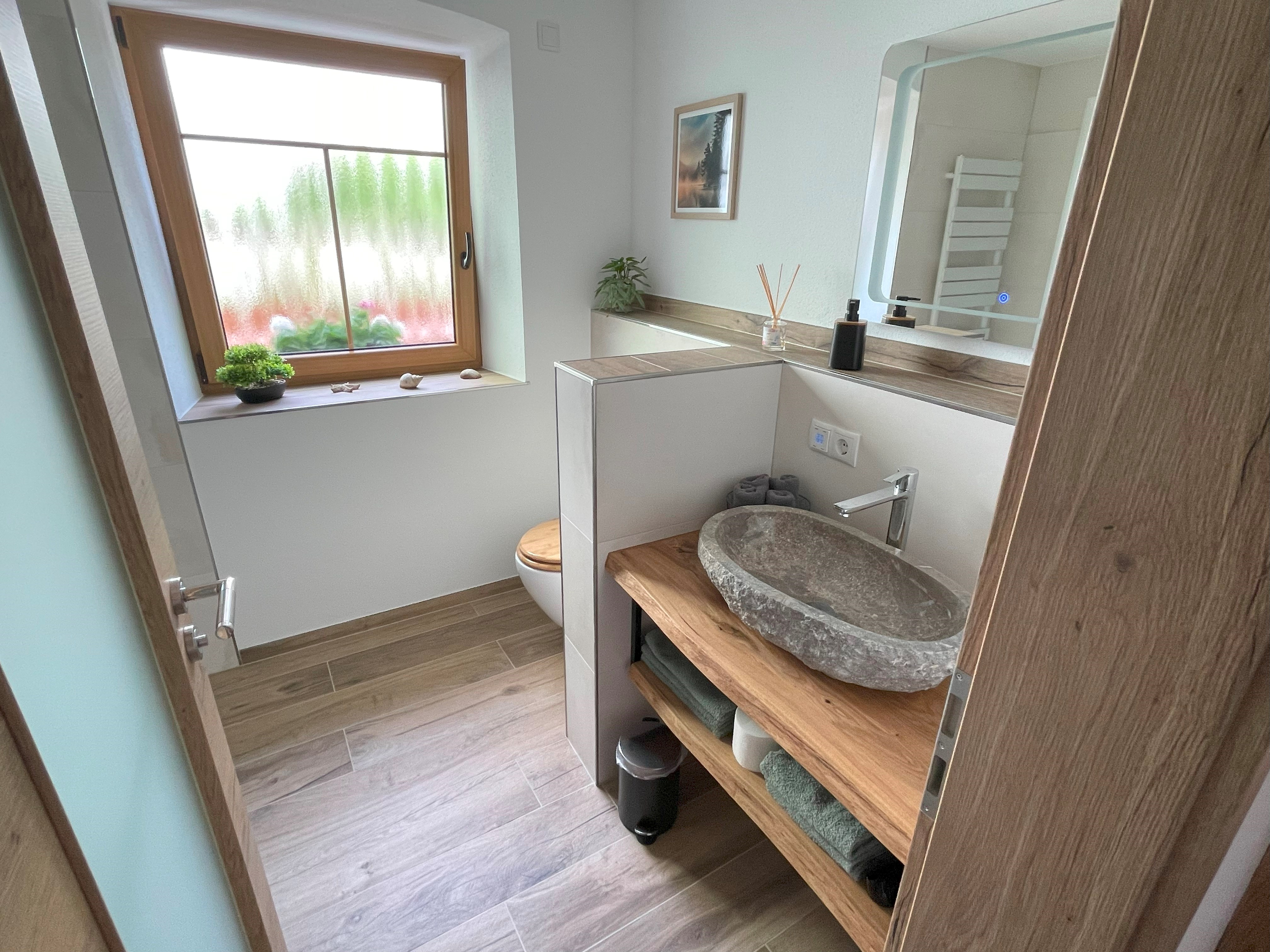 Weiterhin befindet sich im Erdgeschoss ein Bad mit einer bodenebenen Walk-In Dusche, sowie ein WC, und ein Steinwaschbecken, Föhn ist vorhanden.