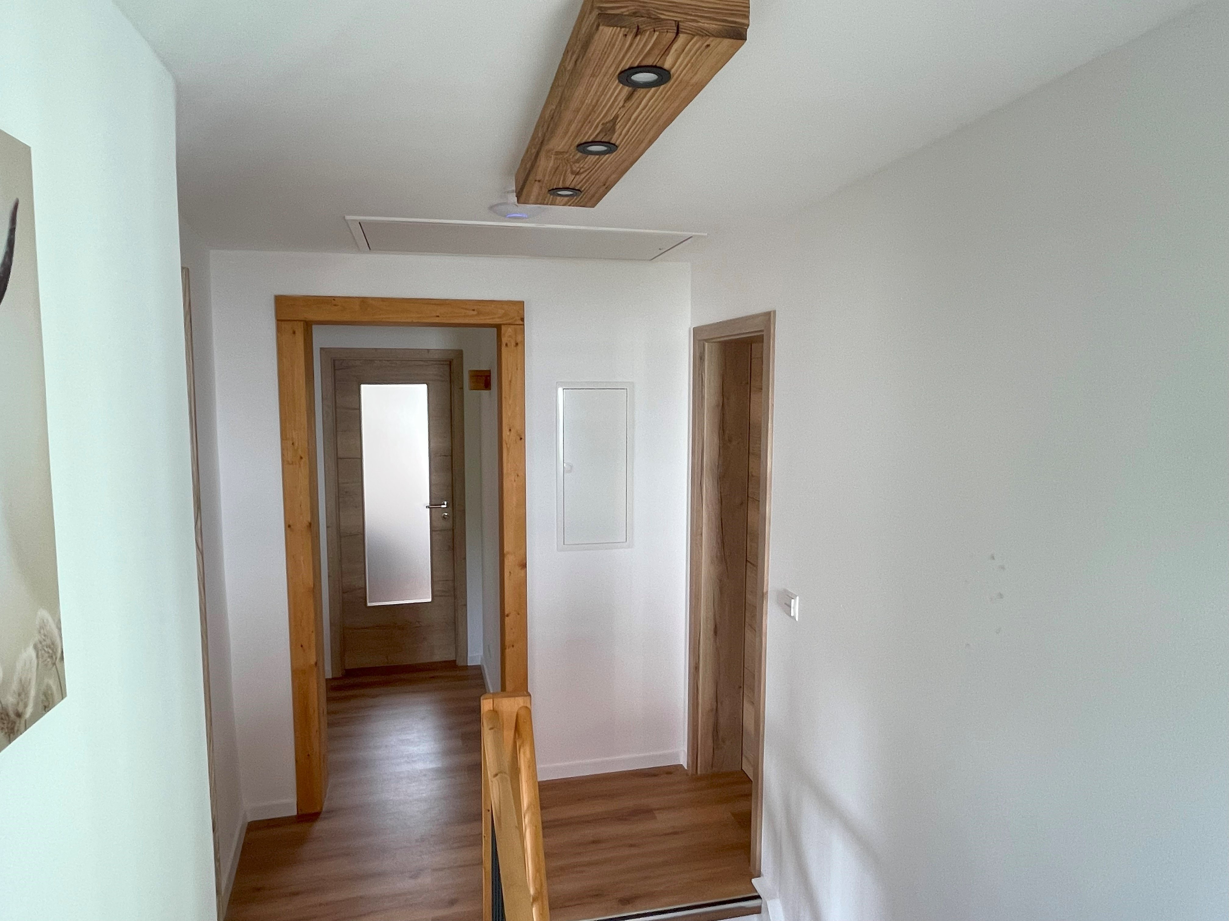 Weiterhin befindet sich im Obergeschoss ein Bad mit bodenebener Dusche, WC, sowie ein Waschbecken, inkl. Föhn.
