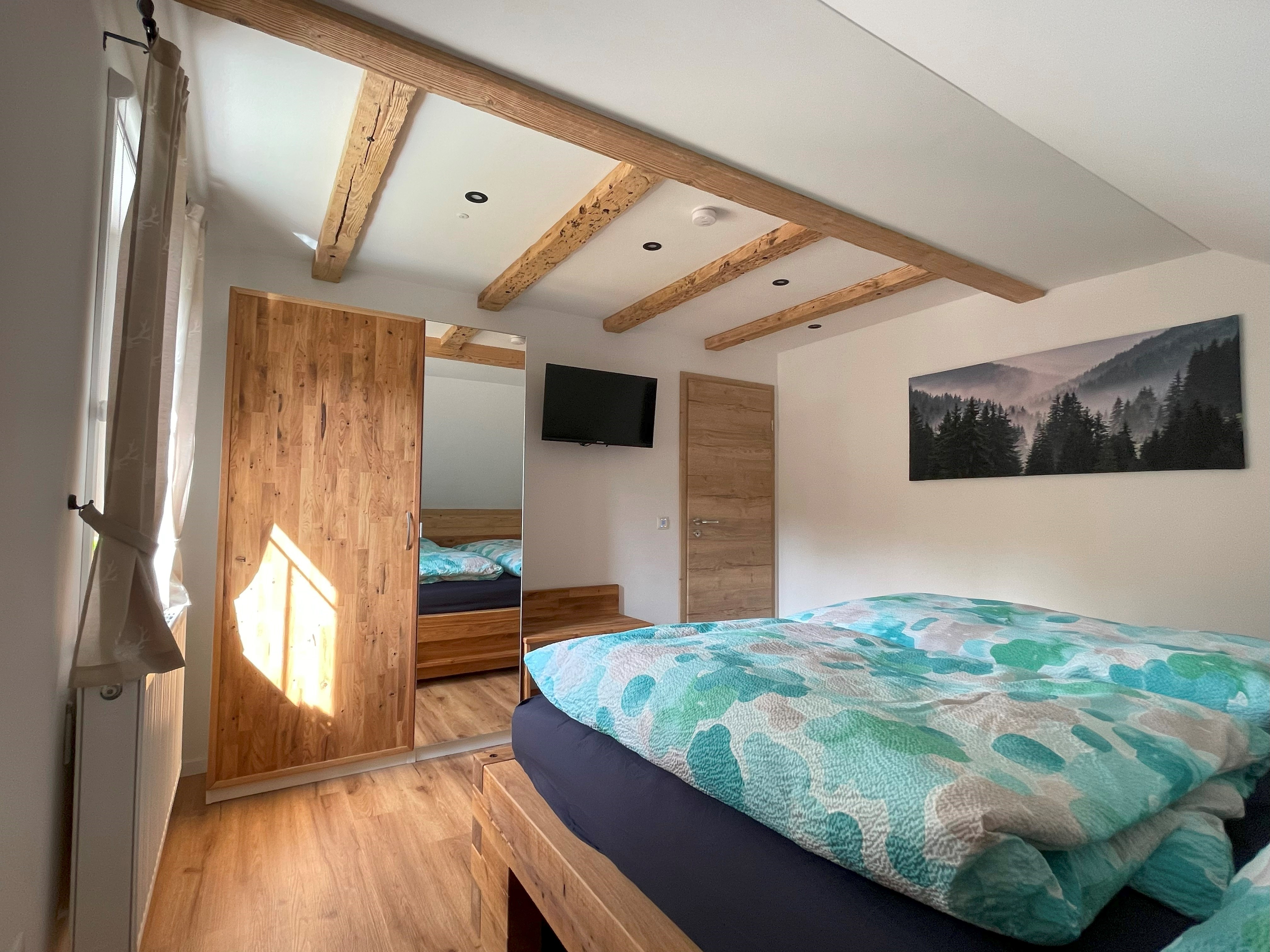 Schlafzimmer 2 ist mit ebenfalls mit einem Doppelbett aus Eiche Massivholz ausgestattet.