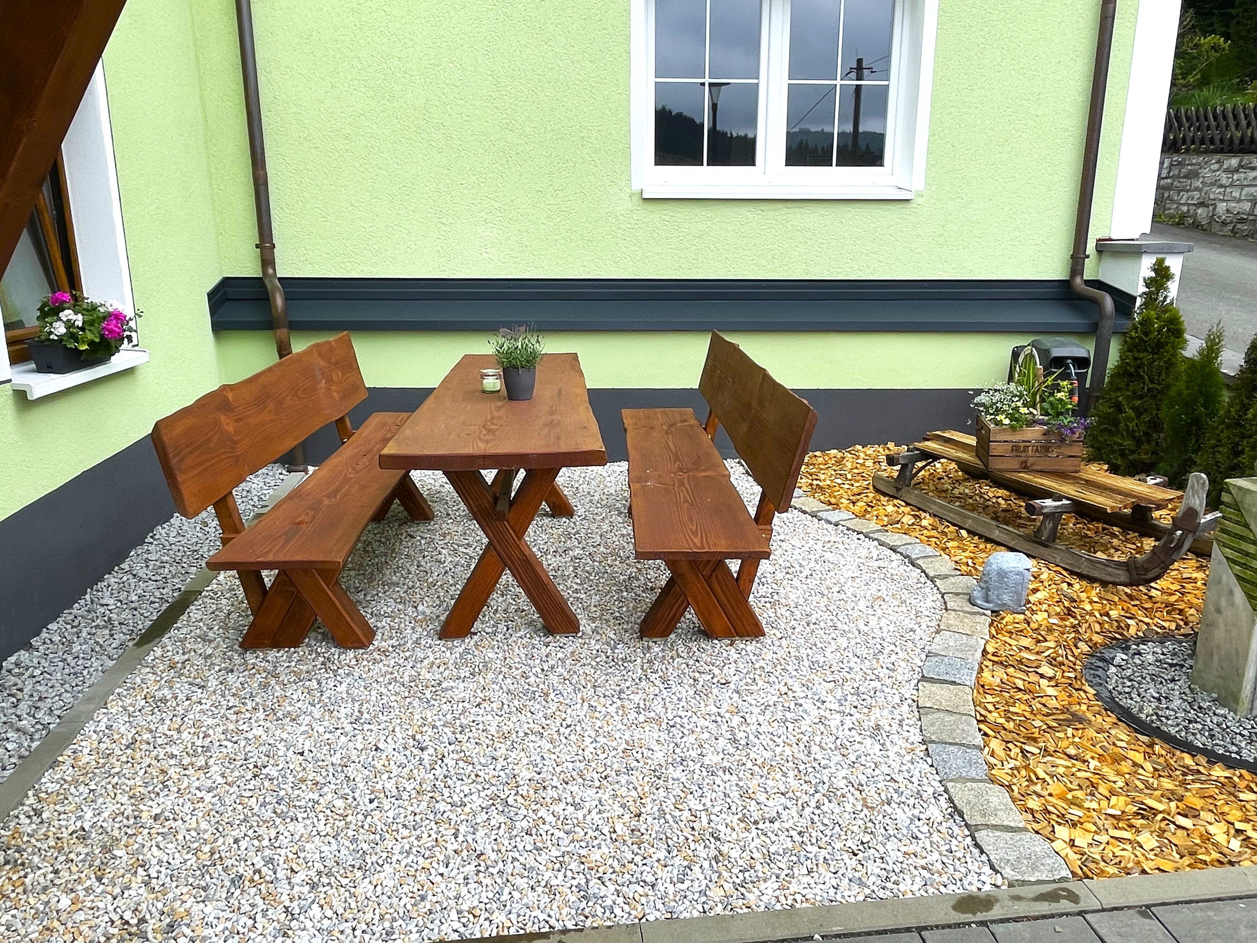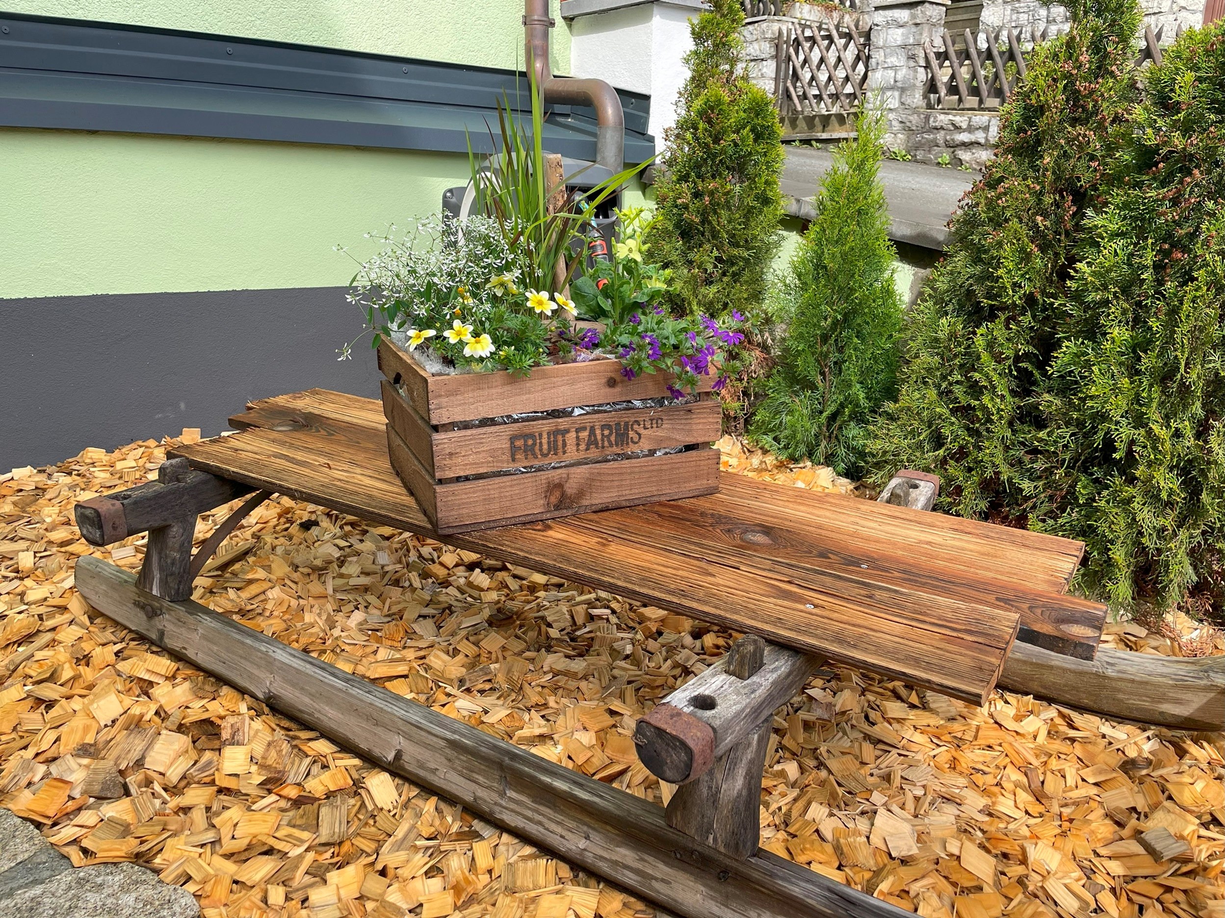 Vor dem Haus befindet sich auch noch eine urige Sitzmöglichkeit um die Morgensonne genießen zu können.
