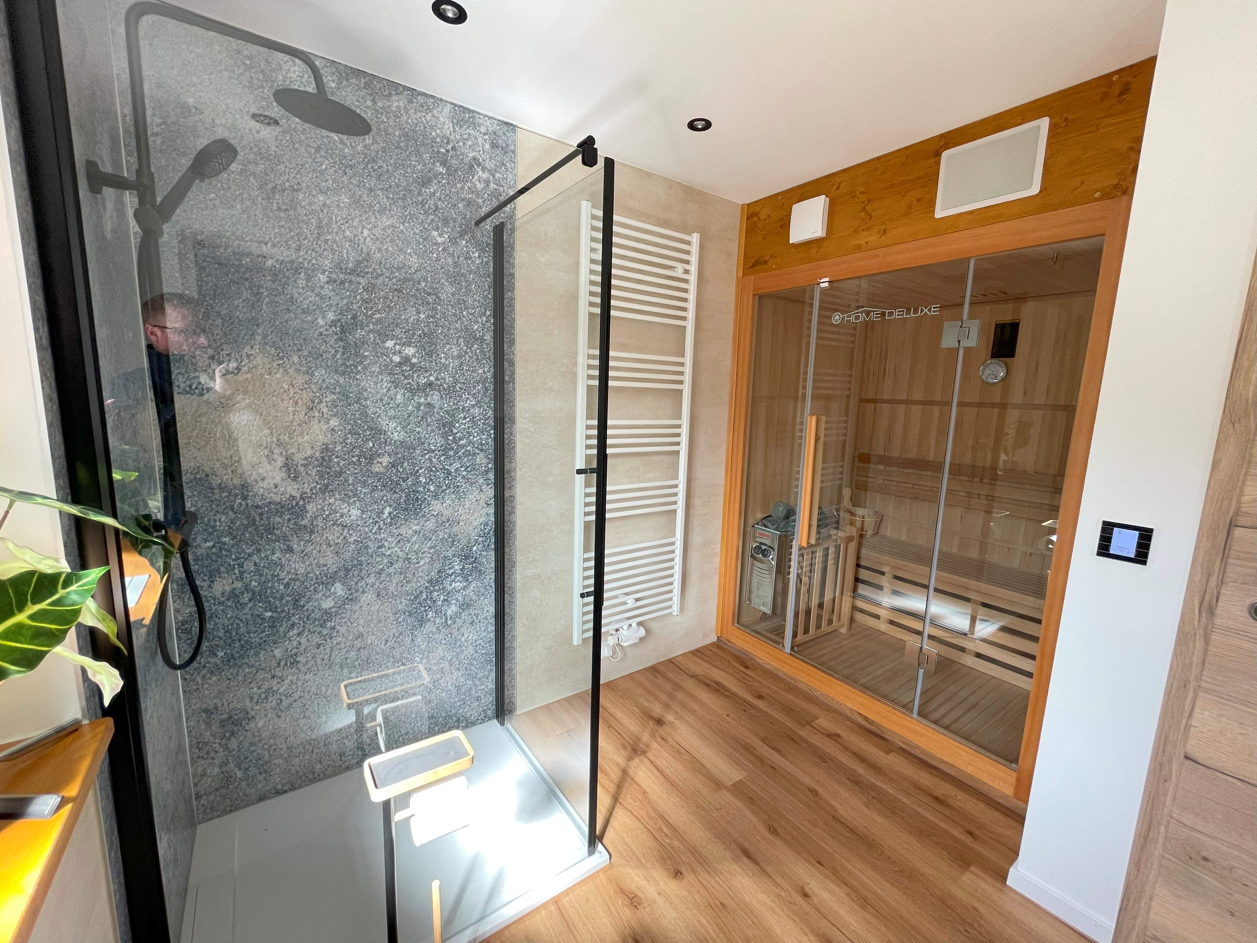 Die im Bad vollintegrierte 2-3 Personen Sauna, kann mittels Smart Home Technik von der Ferne aus bedient und aufgeheizt werden.
