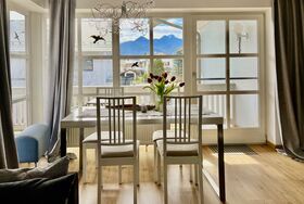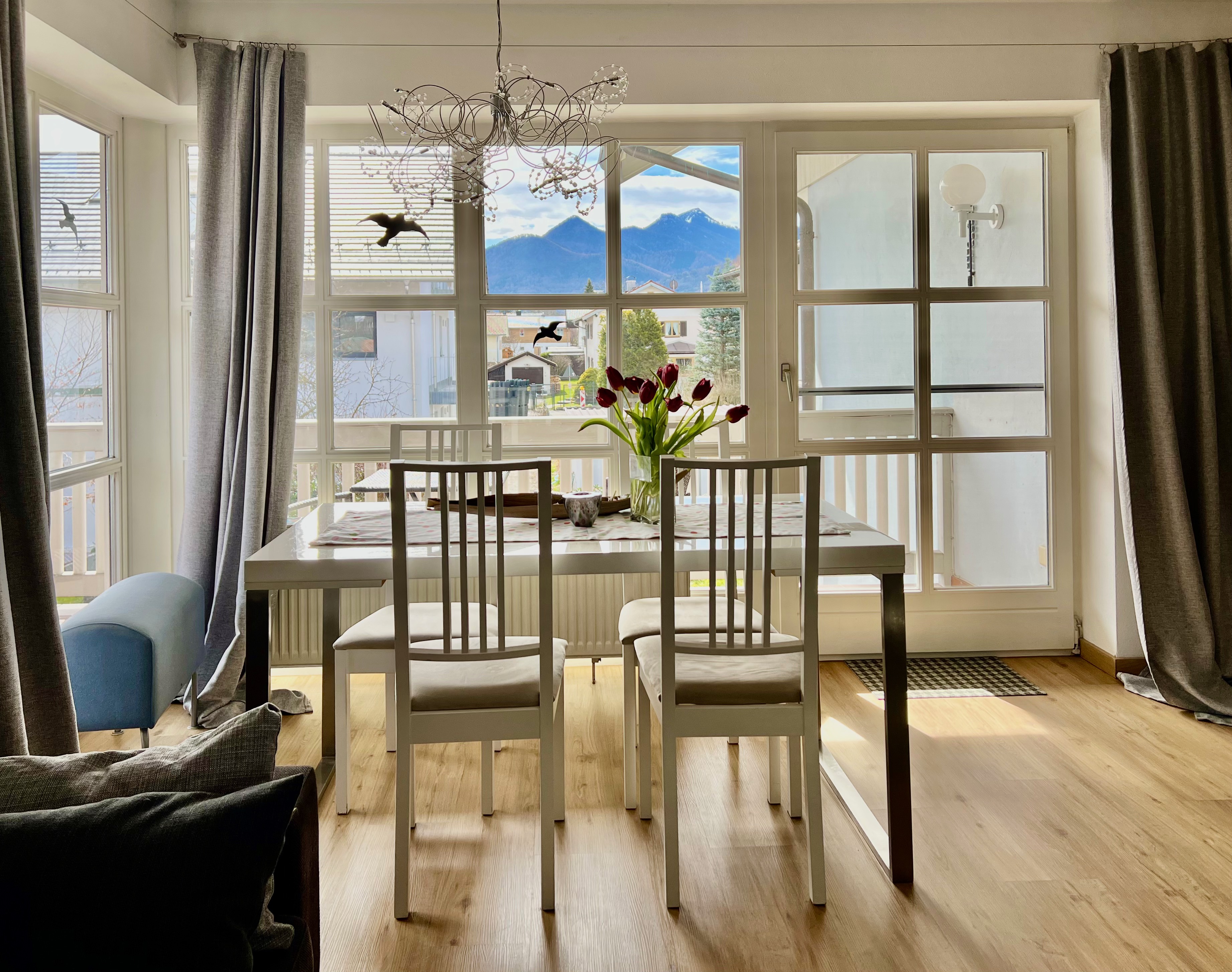 Sehr helle und ruhige 3-Zimmer-Ferienwohnung (87 qm) mit Charme - mit großem Balkon und traumhaften Bergblicken - in Fußnähe zum Chiemsee und sehr nah in die Berge.
