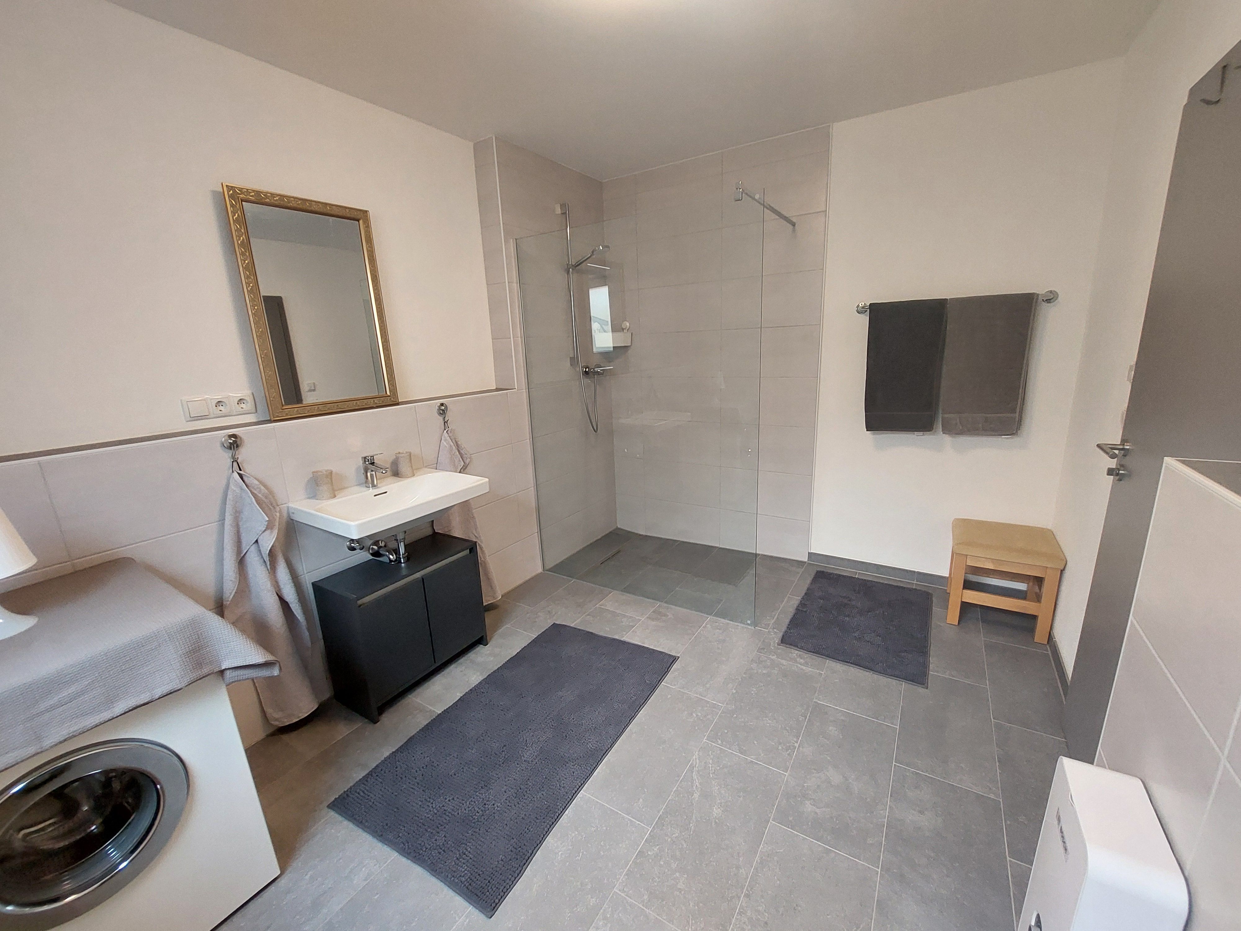 Das Bad ist ausgestattet mit einer begehbaren Dusche, Waschmaschine und Fön.