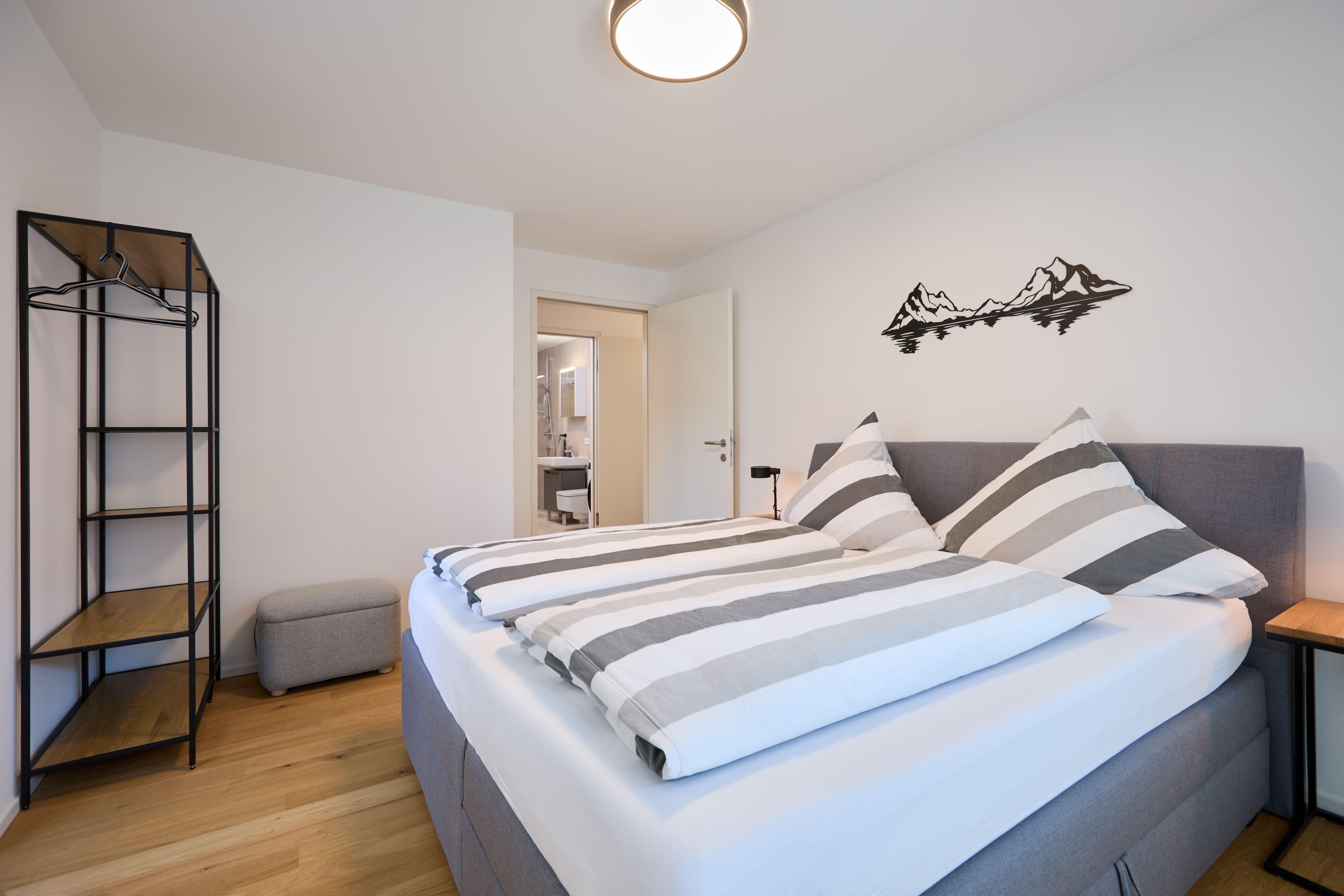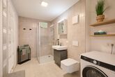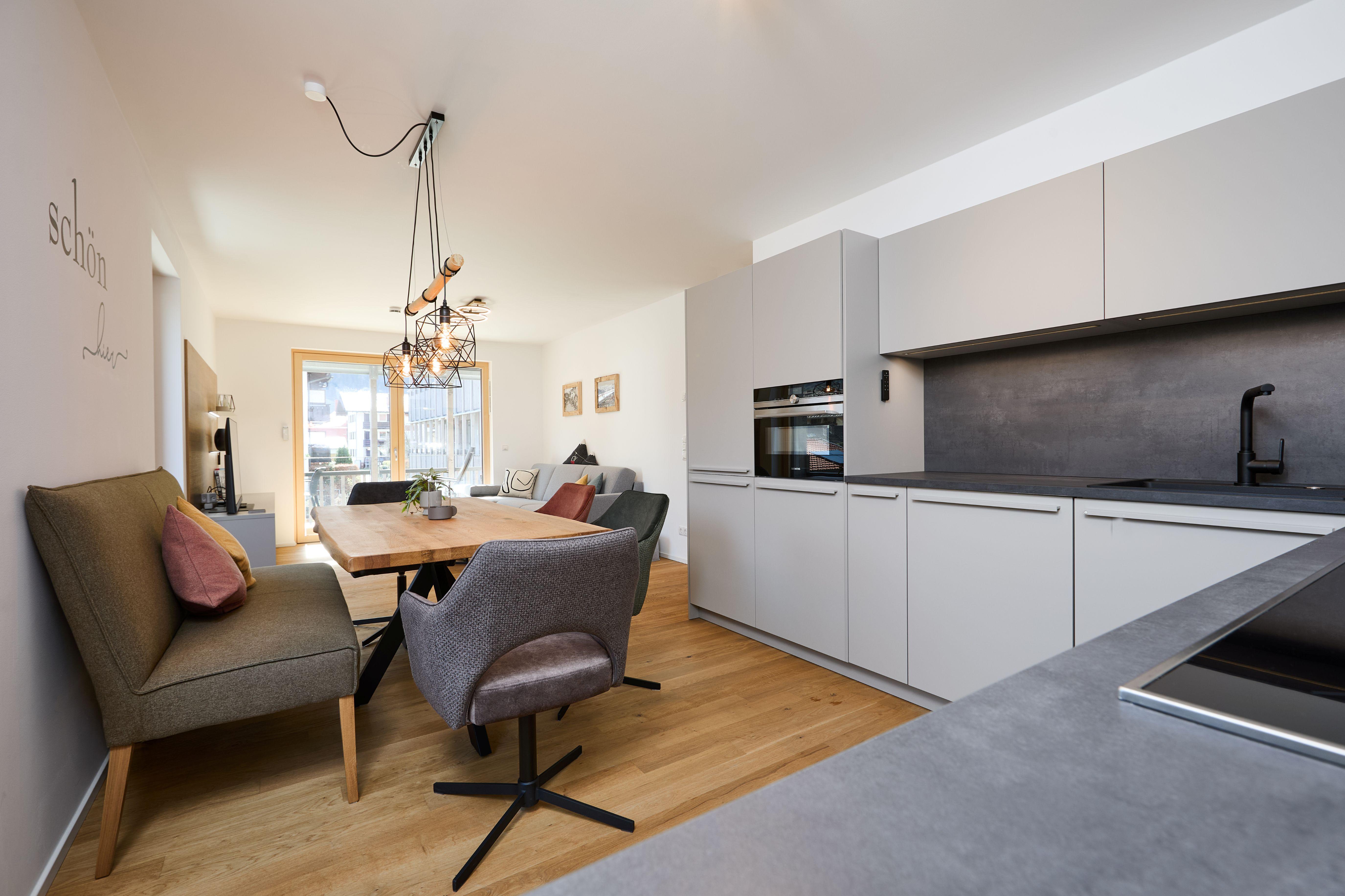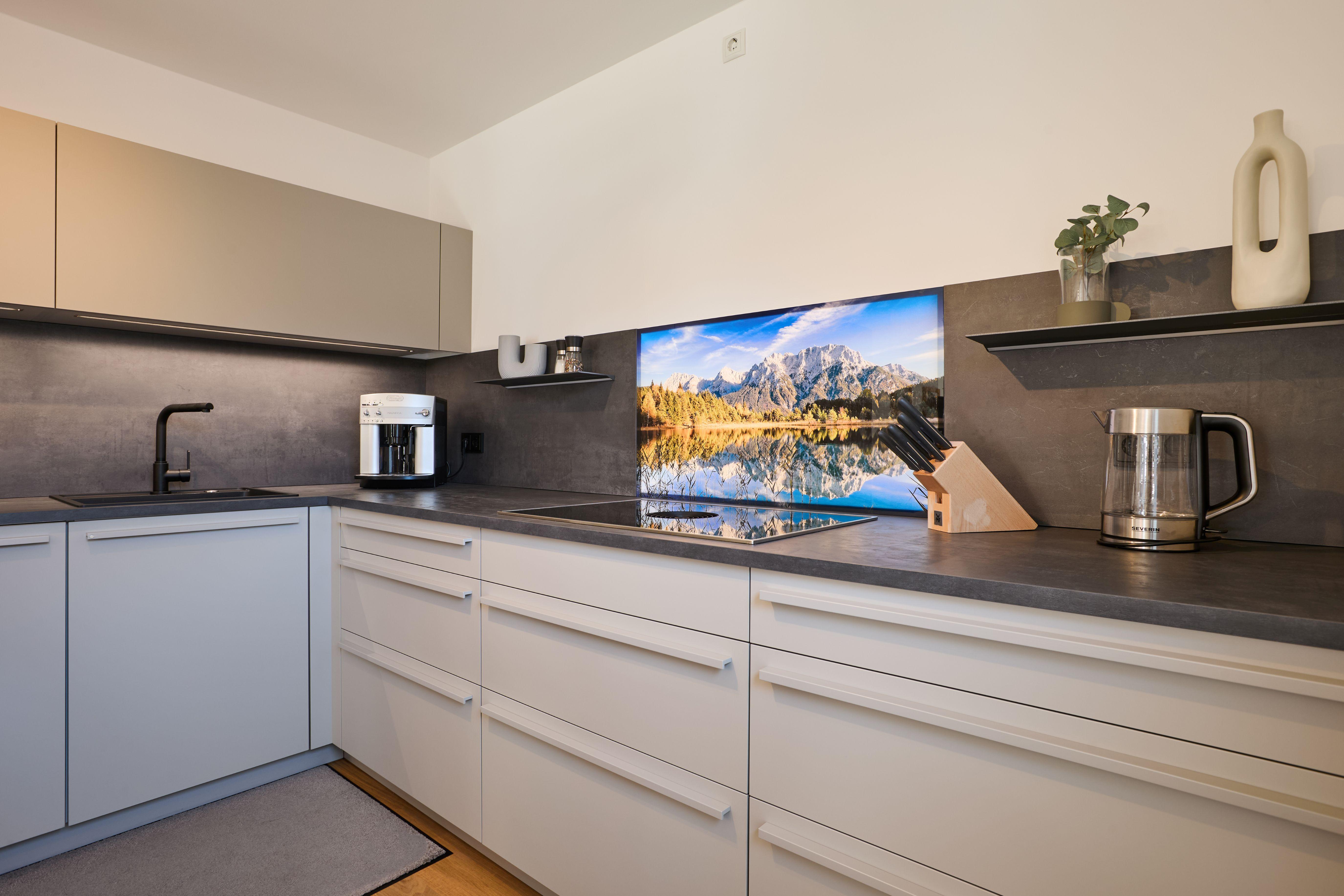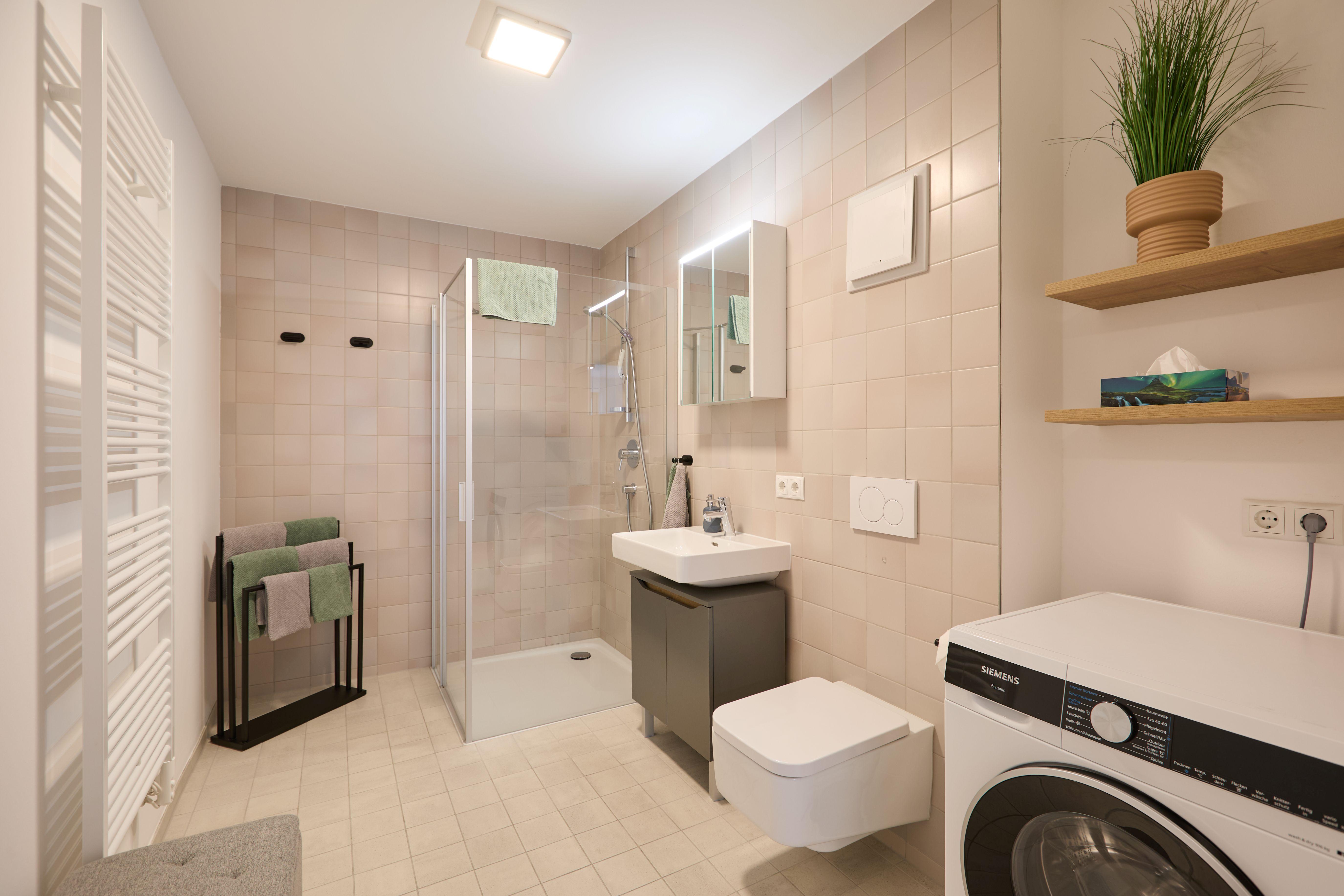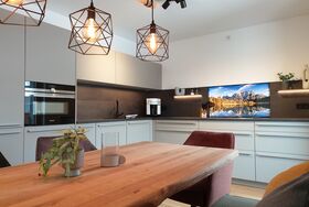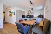 Komfortable, moderne Wohnung in der ersten Etage, im ökologischen Neubau mit Tiefgarage und Aufzug. Zwei separate Schlafzimmer mit Boxspringbetten, elektrischen Jalousien und Smart-TV in einem Zimmer. Freundlicher Wohnraum mit Couch/Schlafcouch, Smart-TV, großem Esstisch, Sitzbank und Stühlen. Hochwertige, komplett ausgestattete Wohnküche mit Induktionskochfeld und Bora Kochfeldabluft-System. Zugang zum möblierten Süd-Ostbalkon von allen Zimmern. Badezimmer mit WC, Waschbecken, bodengleicher Dusche und Wasch/Trockner.
