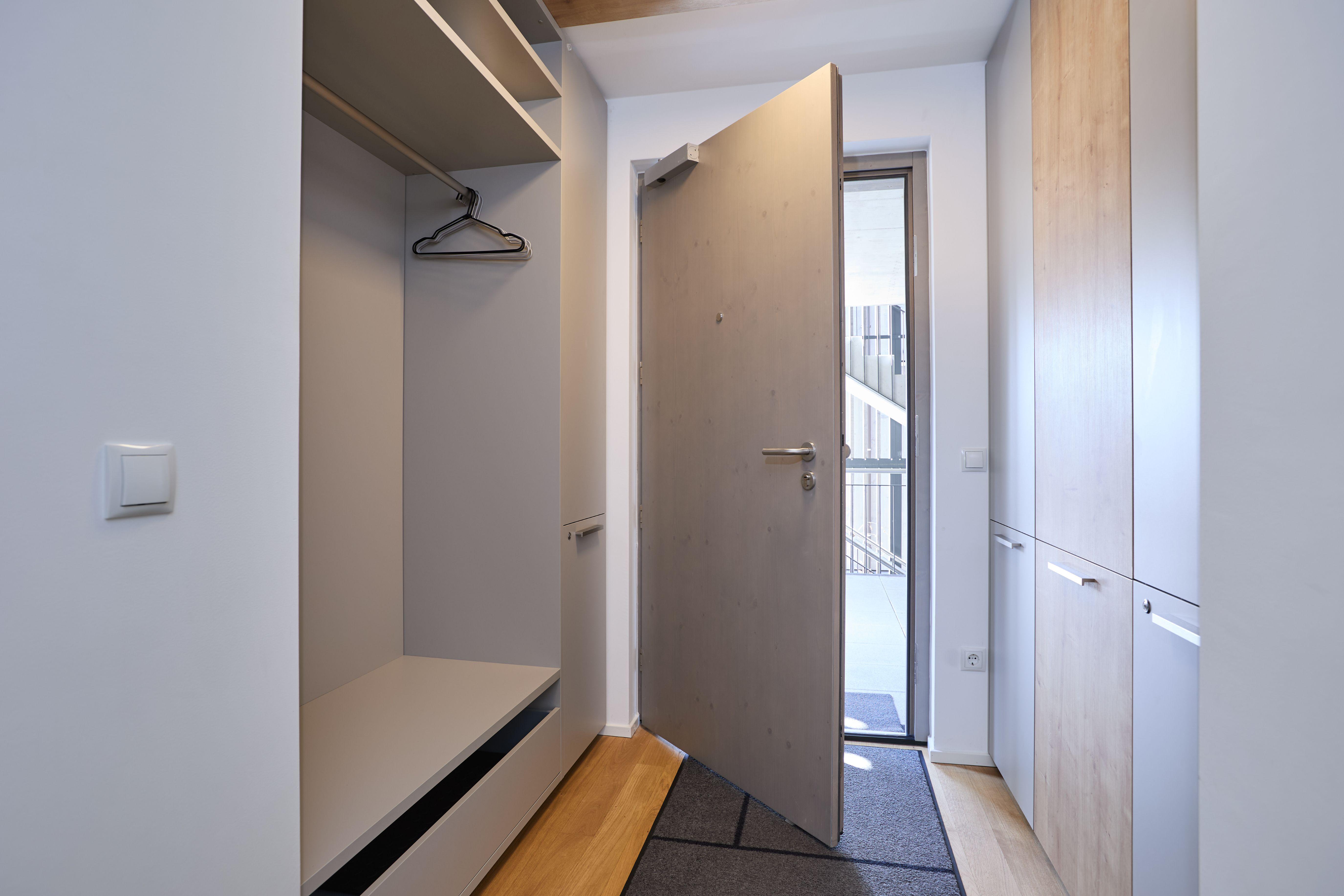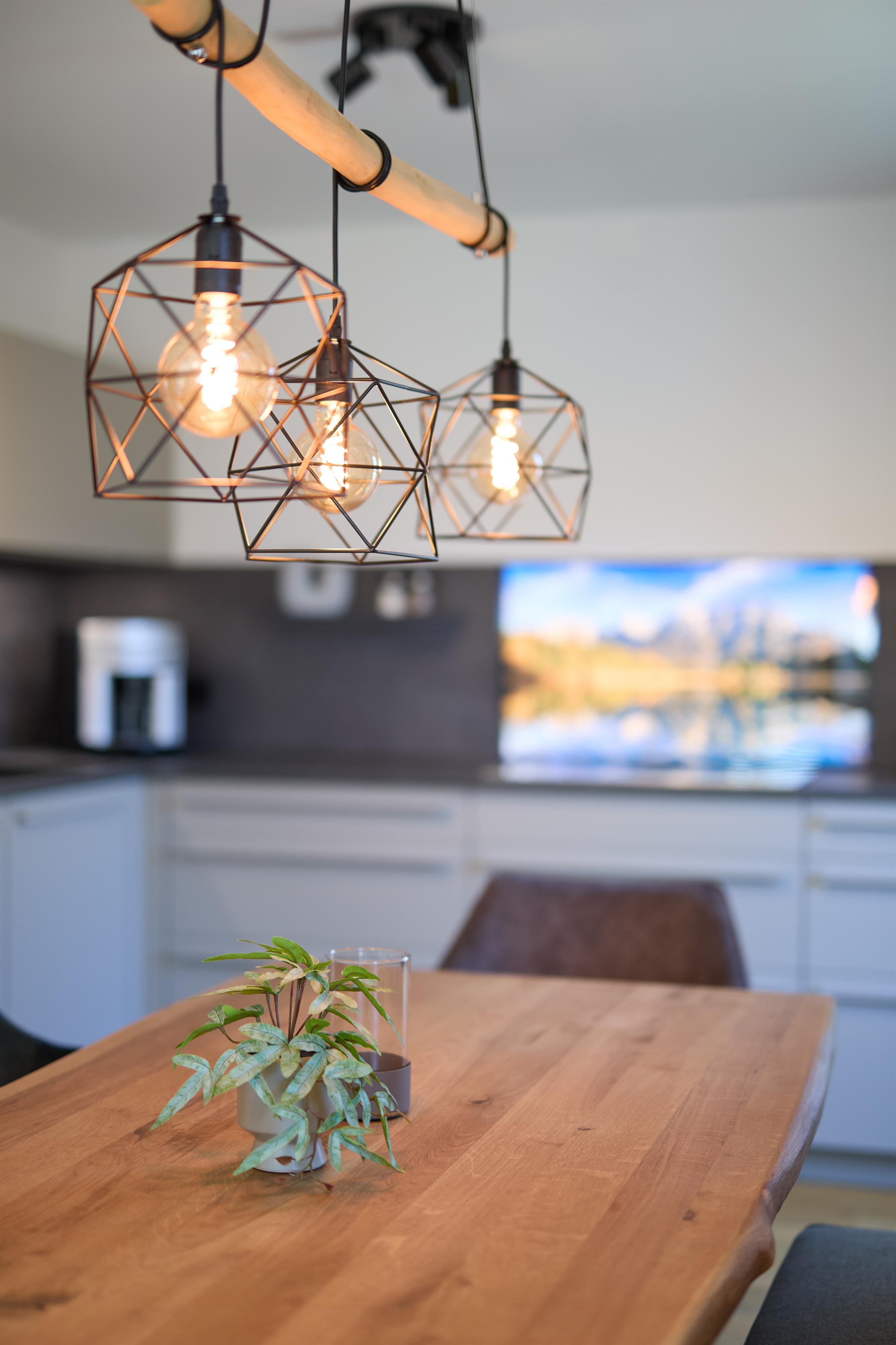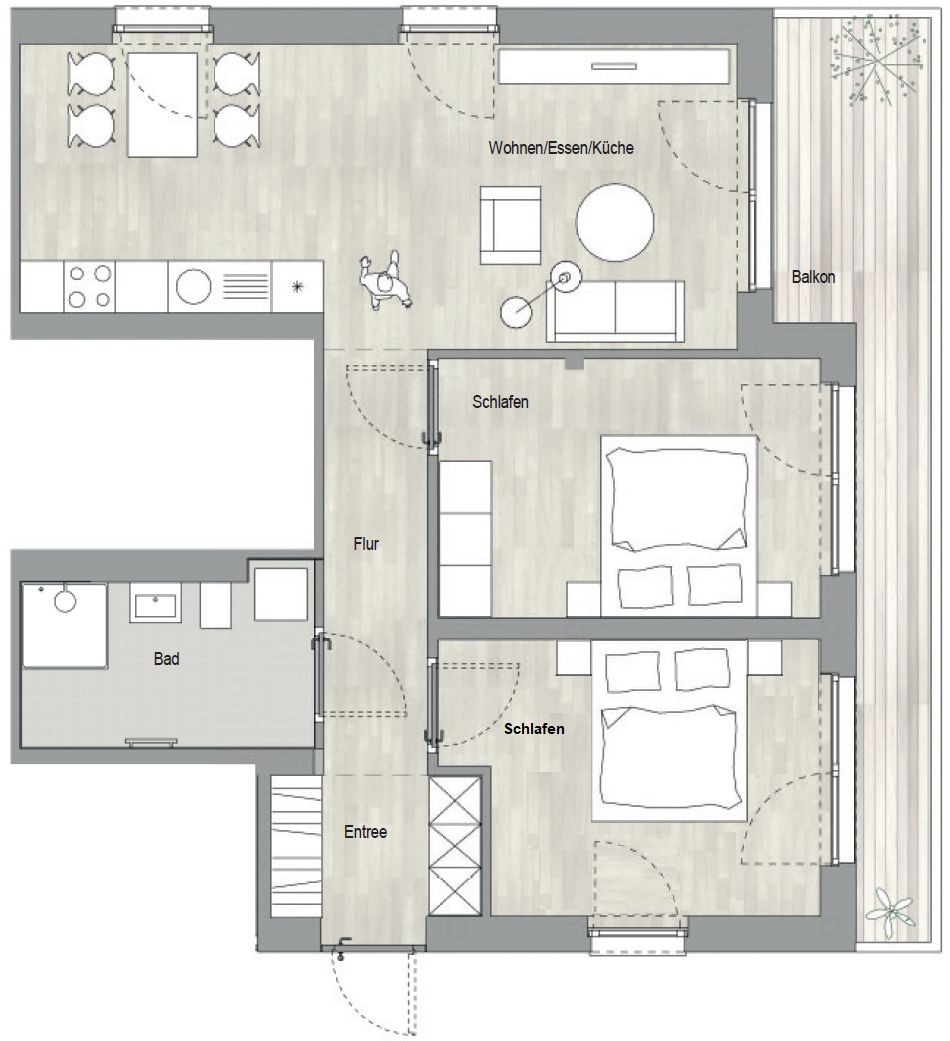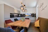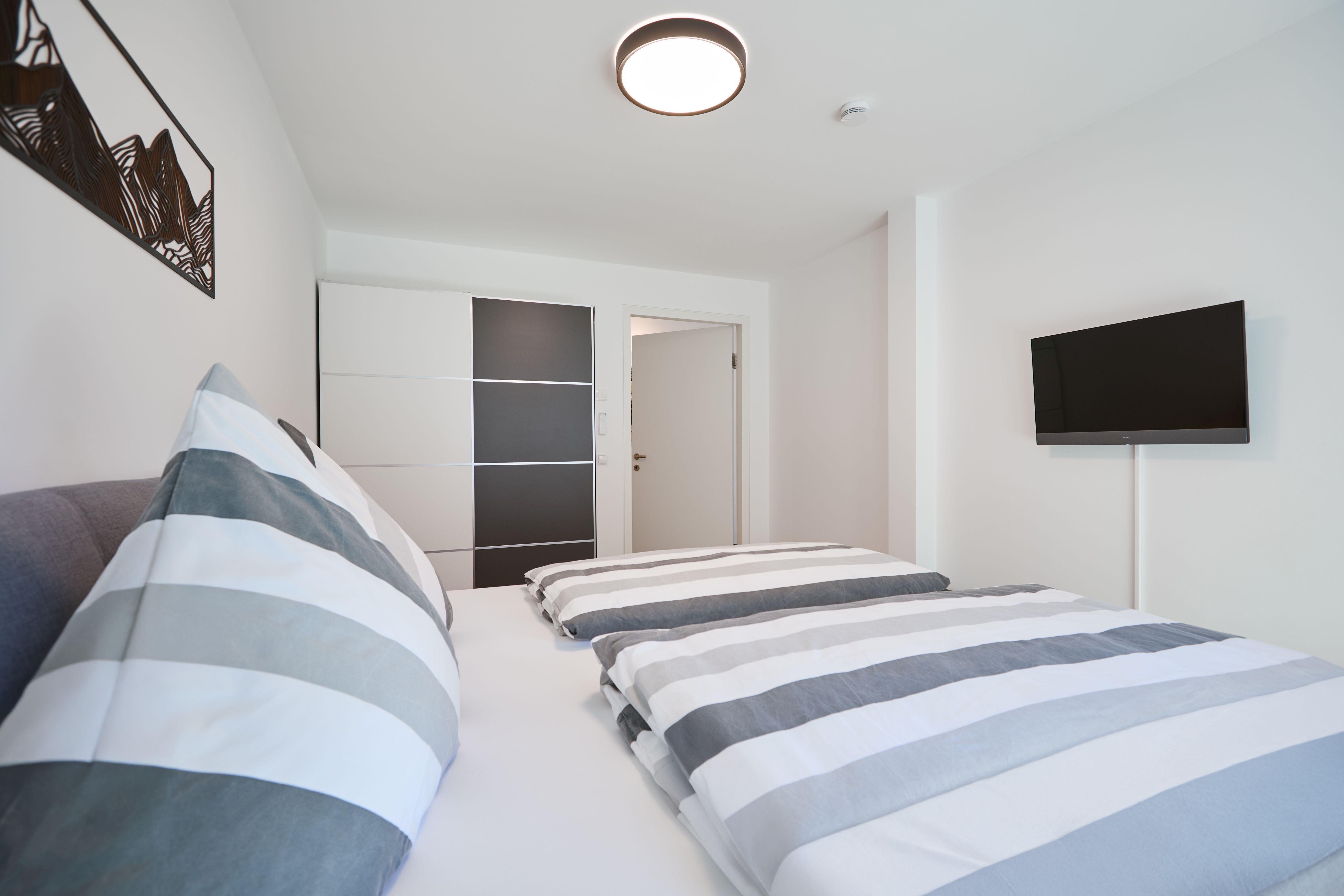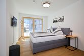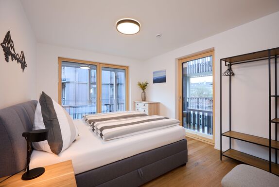 Komfortable, moderne Wohnung in der ersten Etage, im ökologischen Neubau mit Tiefgarage und Aufzug. Zwei separate Schlafzimmer mit Boxspringbetten, elektrischen Jalousien und Smart-TV in einem Zimmer. Freundlicher Wohnraum mit Couch/Schlafcouch, Smart-TV, großem Esstisch, Sitzbank und Stühlen. Hochwertige, komplett ausgestattete Wohnküche mit Induktionskochfeld und Bora Kochfeldabluft-System. Zugang zum möblierten Süd-Ostbalkon von allen Zimmern. Badezimmer mit WC, Waschbecken, bodengleicher Dusche und Wasch/Trockner.