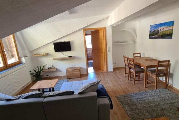Unsere gemütliche Fewo Isarblick mit ca. 50 qm bietet Platz für bis zu 4 Personen und befindet sich im Dachgeschoß (1.Stock) mit eigenem Eingang. Die Fewo verfügt über eine voll ausgestattete Küche mit großem Eß- & Wohnbereich mit Sofa, ein kleines, feines Bad mit Badewanne und WC und einem Schlafzimmer mit Zugang zum Balkon (mit Ausblick auf die Isar). Weiters: abschließbarer Fahrradraum