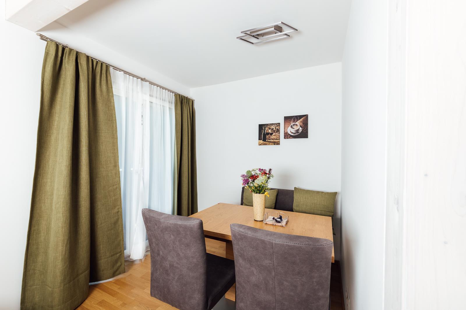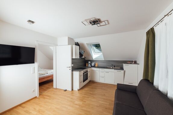 Modern eingerichtetes Appartement für 2 bis 4 Personen, Wohnzimmer mit Schlafcouch, Schlafzimmer, Badezimmer und Küchenzeile