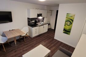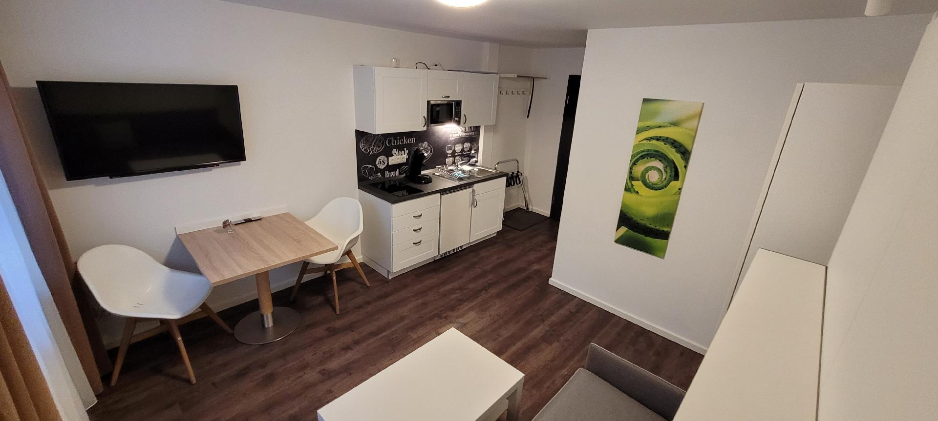 Unser Tiny-Studio hat einen Wohn-/Schlafzimmer, der mit einem Klappbett 160x200 ausgestattet ist das tags Platz macht für ein bequemes Sofa. Die eigene Küchenzeile mit Esstisch für zwei macht euch unabhängig. Das Duschbad ist direkt vom Wohn-/Schlafzimmer zu erreichen.