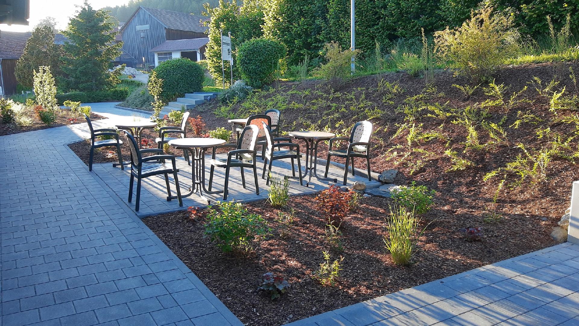 Die öffentliche Aussichts-Terrasse mit ihrem grandiosem Blick in die Berge grenzt direkt an die Buch- und Spielbar an, und misst weitere 60 qm. Entspannen könnt ihr Euch jederzeit in unseren Lounge Möbeln, grillen und chillen dürft ihr im Garten und im Außenbereich vor dem Haus.