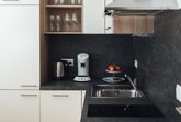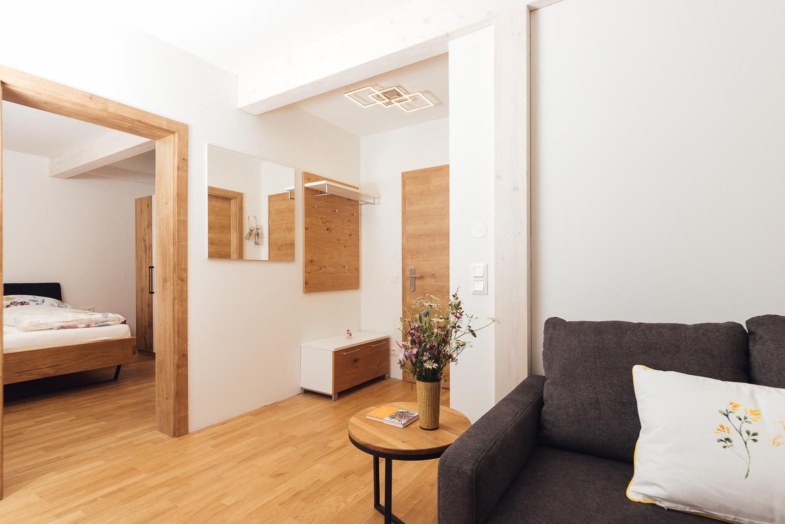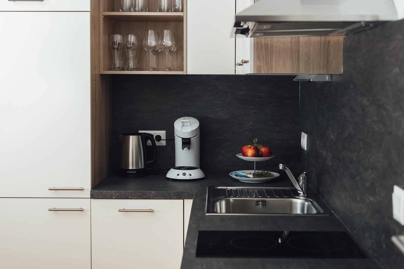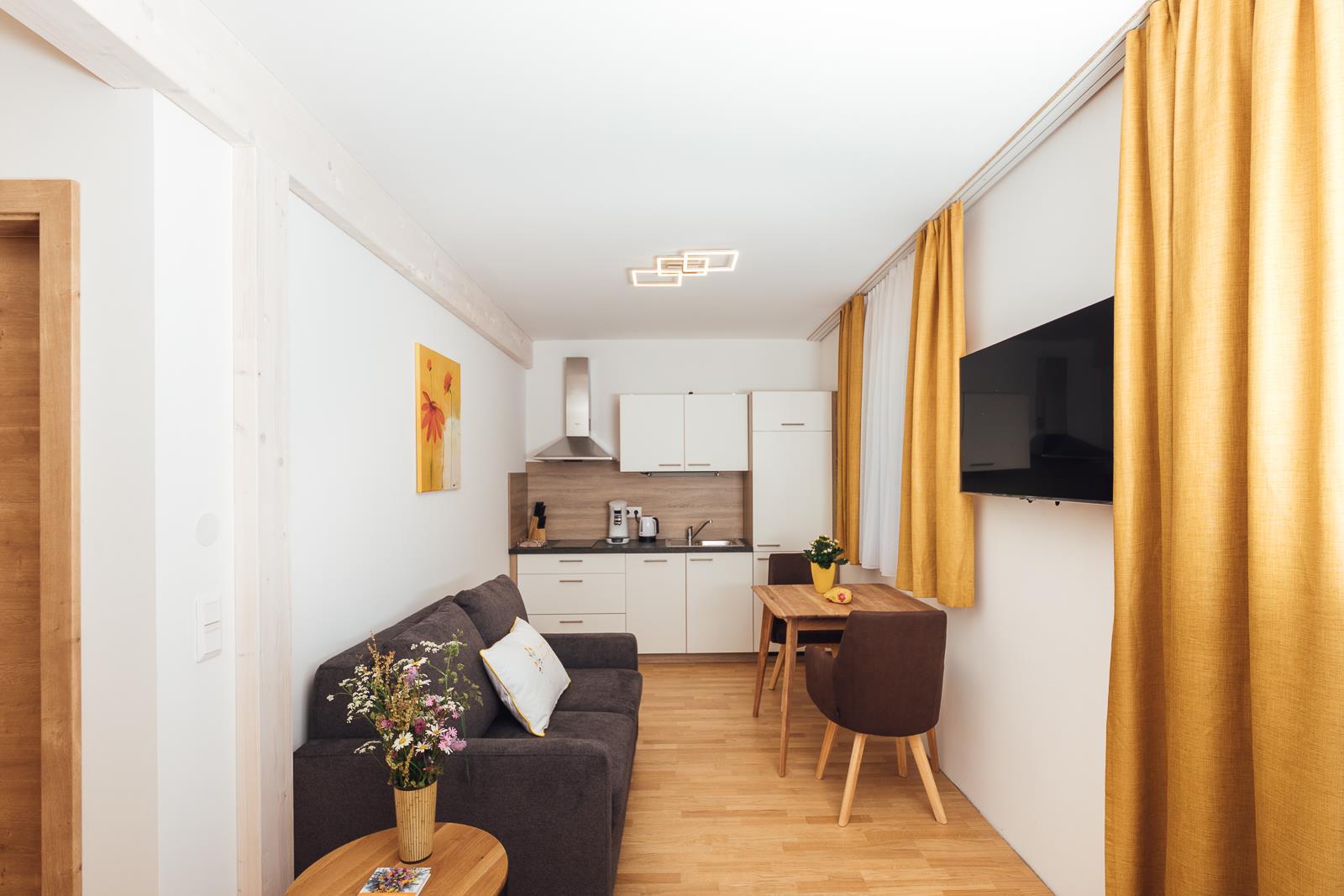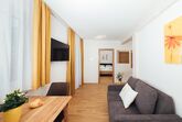 Modern eingerichtetes Appartement für 2 bis 4 Personen, Wohnzimmer mit Schlafcouch, Schlafzimmer, Badezimmer und Küchenzeile