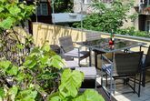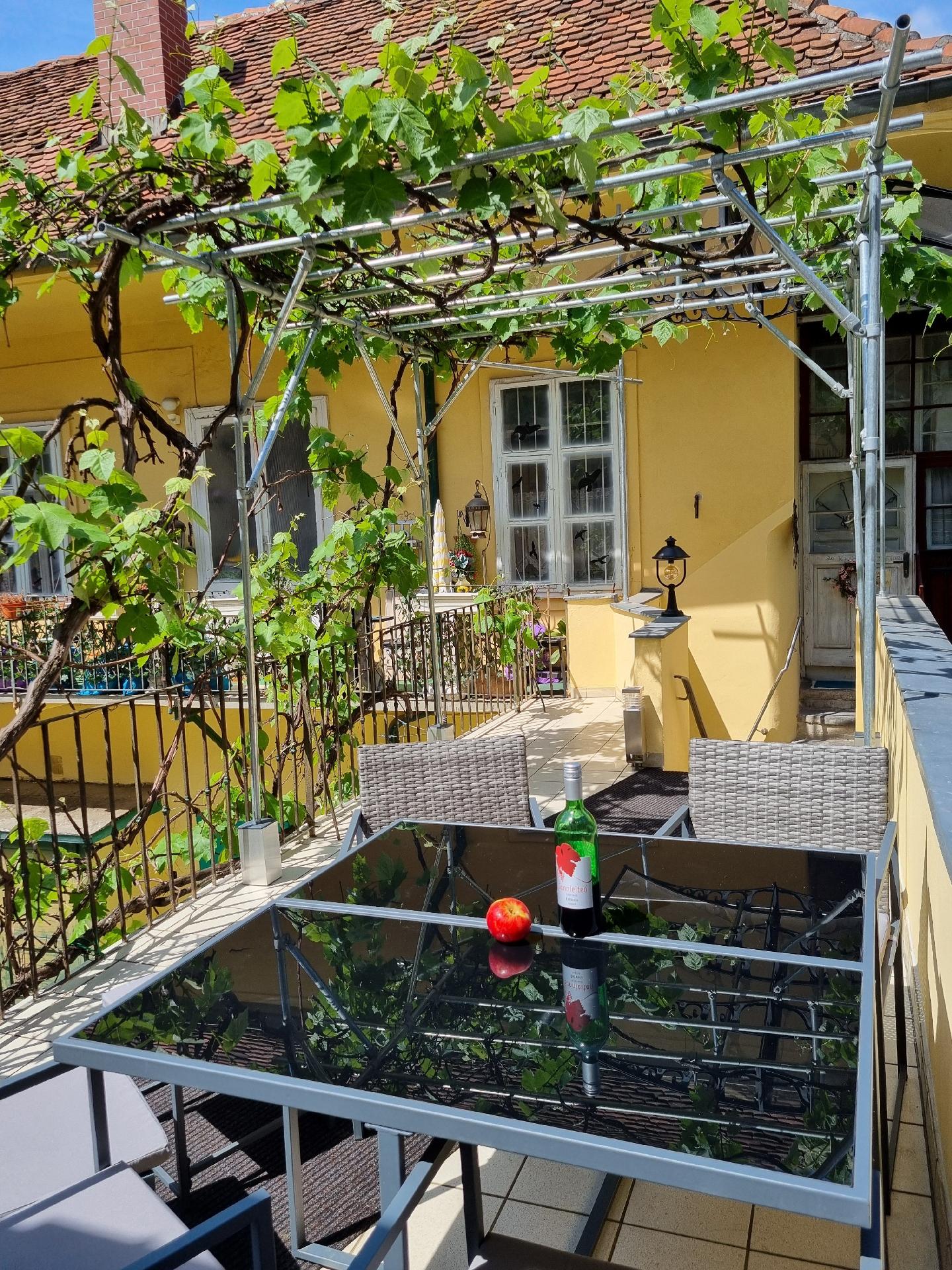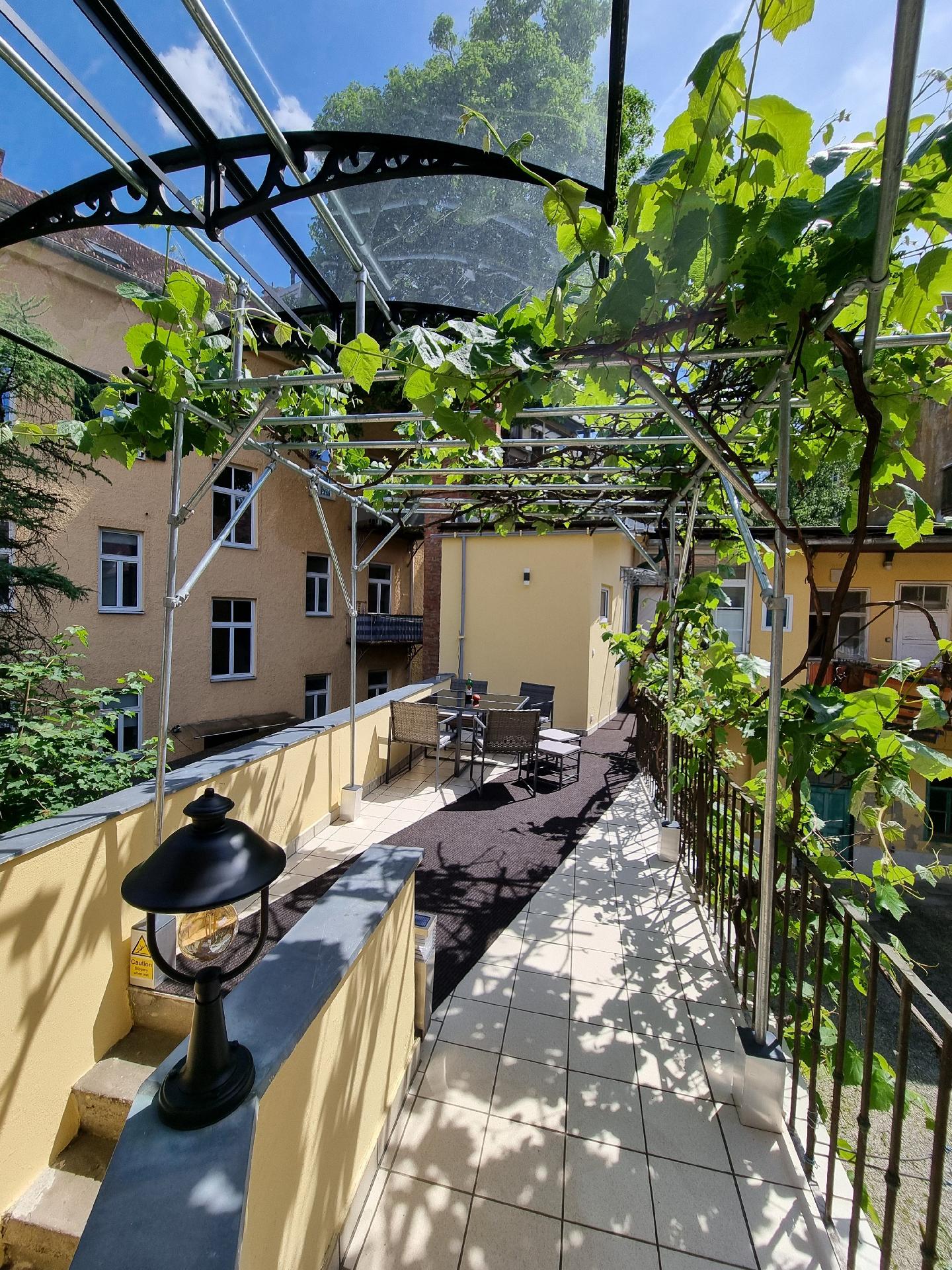 Private Terrasse mit Laube und Gartenmöbeln, umgeben von drei ruhigen Innenhöfen.