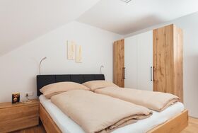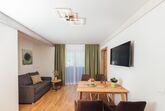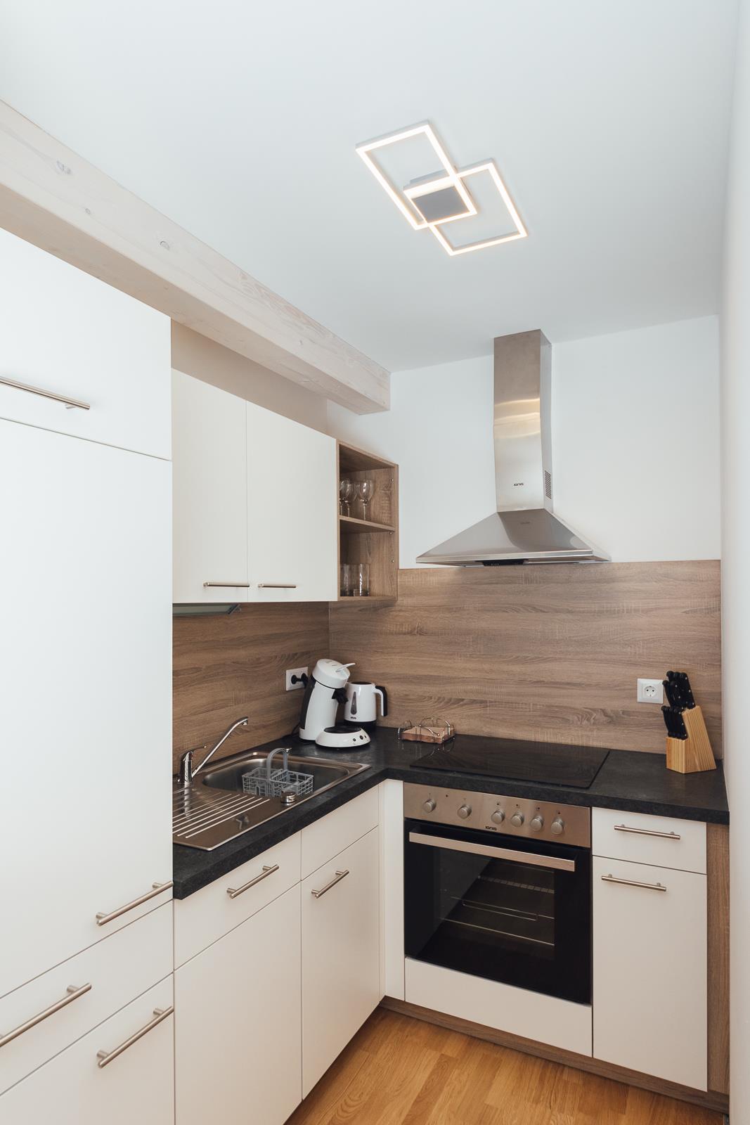 Modern eingerichtetes Appartement für 4 bis 6 Personen, Wohnzimmer mit Schlafcouch, 2 Schlafzimmer, Badezimmer und Küchenblock
