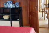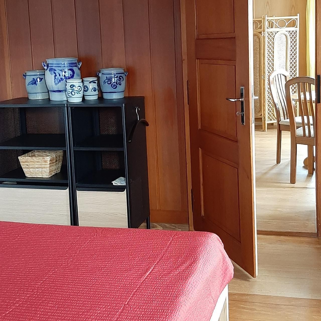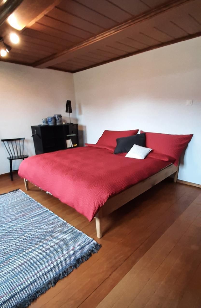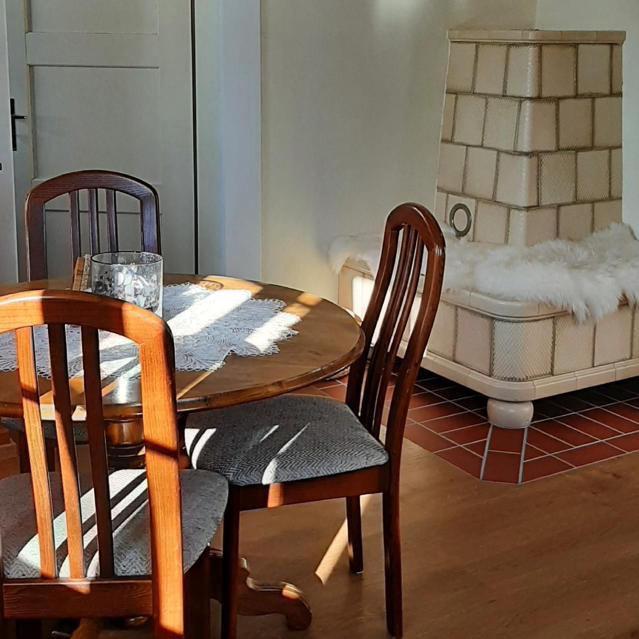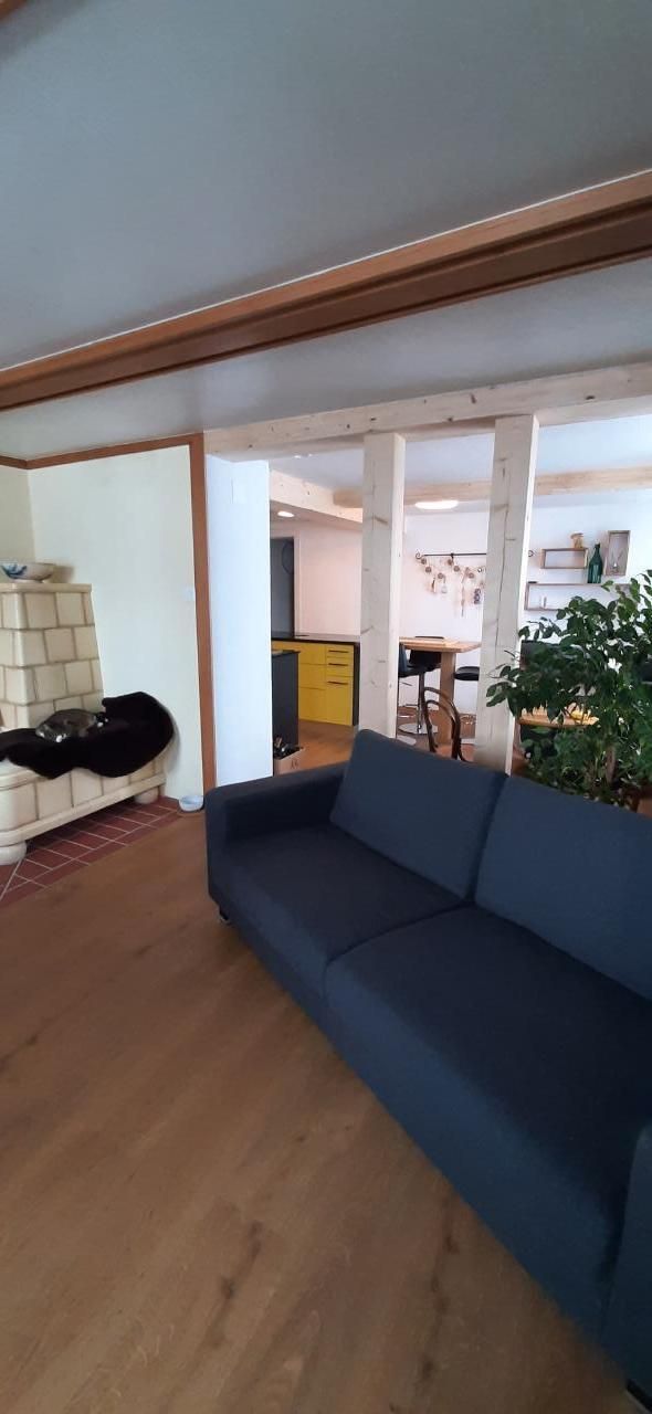 Die Innenausstattung unserer Ferienwohnung im Erdgeschoss umfasst ein sonniges, helles Wohnzimmer, das zum Verweilen einlädt, und verfügt über einen runden Esstisch für vier Personen. Die Küche ist praktisch eingerichtet mit einem integrierten Dunstabzug im Herd und einem Kühlfach im Kühlschrank. Das Schlafzimmer präsentiert sich mit einer schönen, mit Liebe und Sorgfalt restaurierten alten Zimmerdecke und einem Riemenboden, der den historischen Charme der Wohnung unterstreicht.