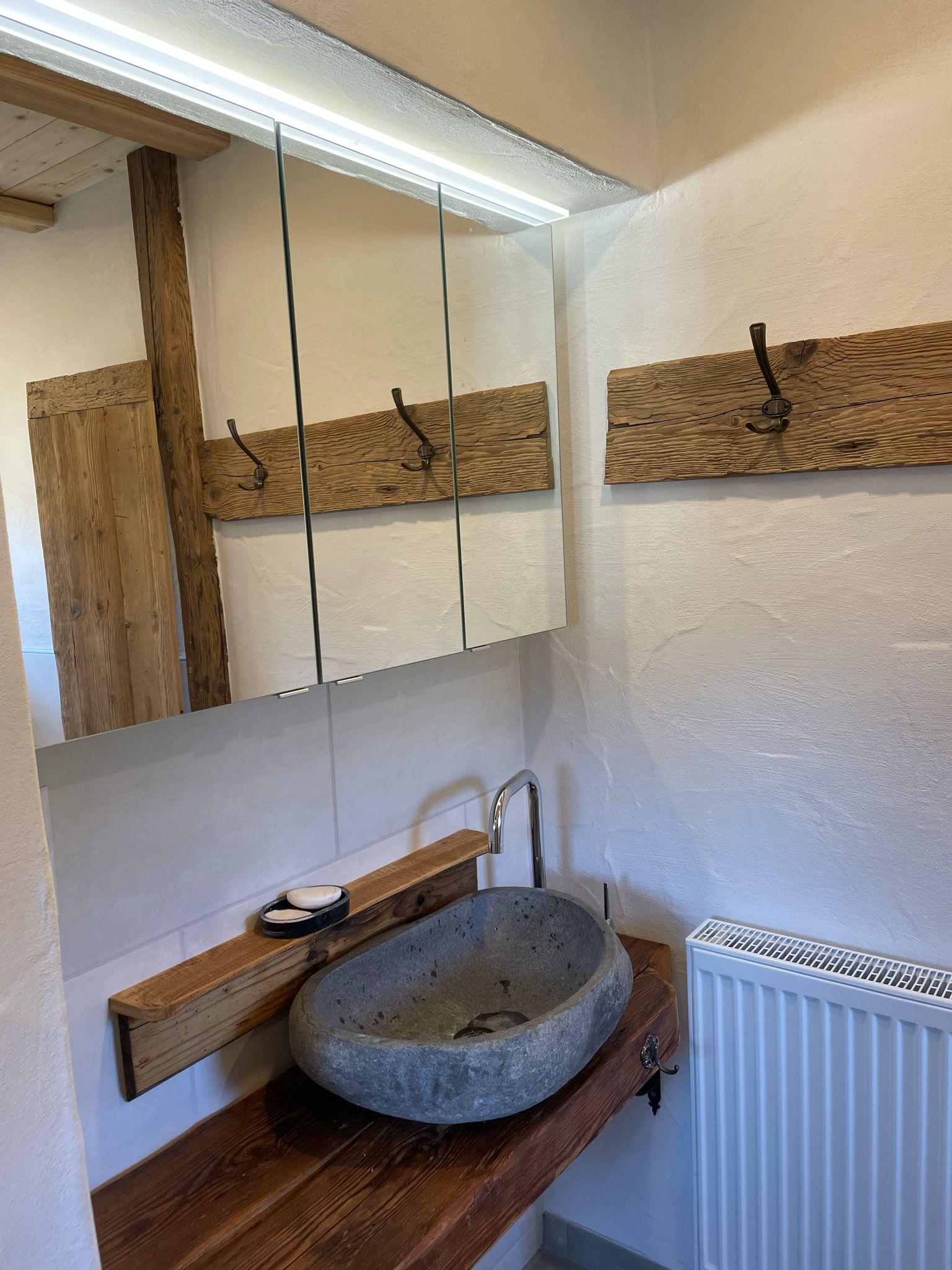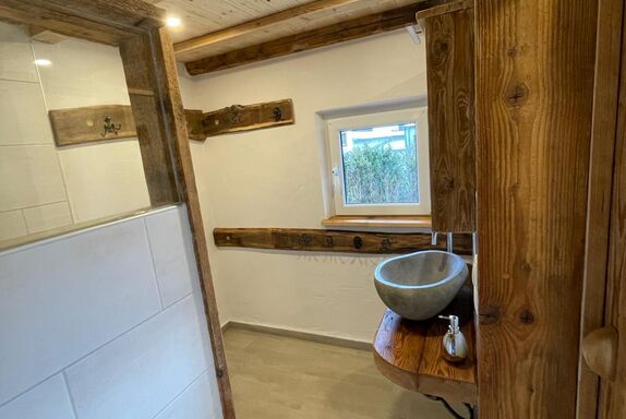 Die neuen rustikal eingerichteten Nassräume mit Waschbeken, barrierefreien Duschen und WC befinden sich im EG und OG. Handtücher bitte selber mitbringen.