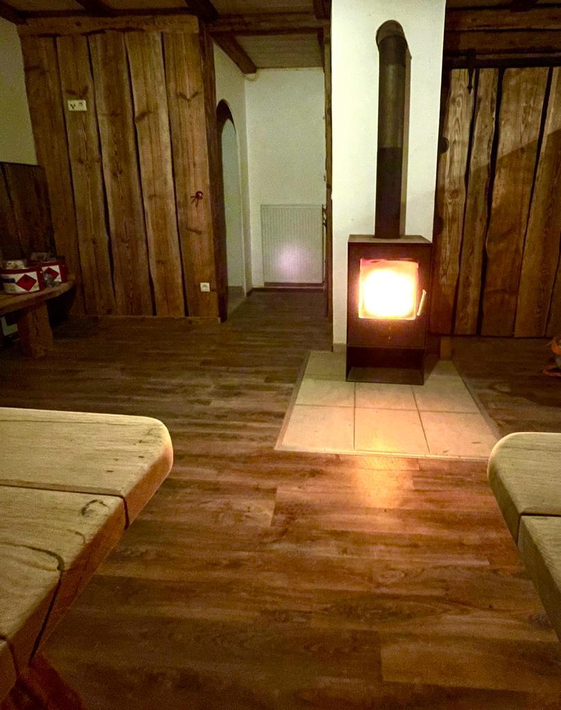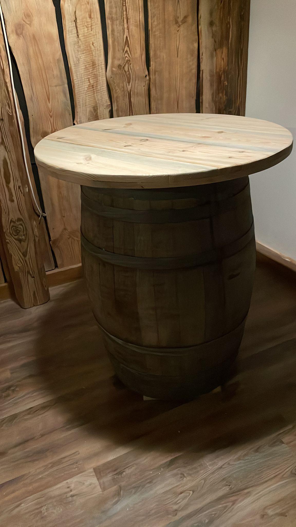 Rustikale Vollholzmöbel, uralte Holzbalken und ein Holzofen im Stil einer alten Berghütte bieten im großen Gastraum eine besondere Atmosphäre. Der Stehtisch, ein altes 225 l Eiche-Weinfass, lädt zum kurzen Verweilen mit einem guten Tropfen ein.
