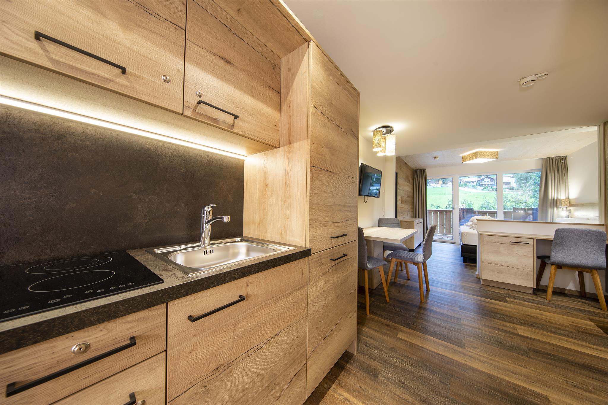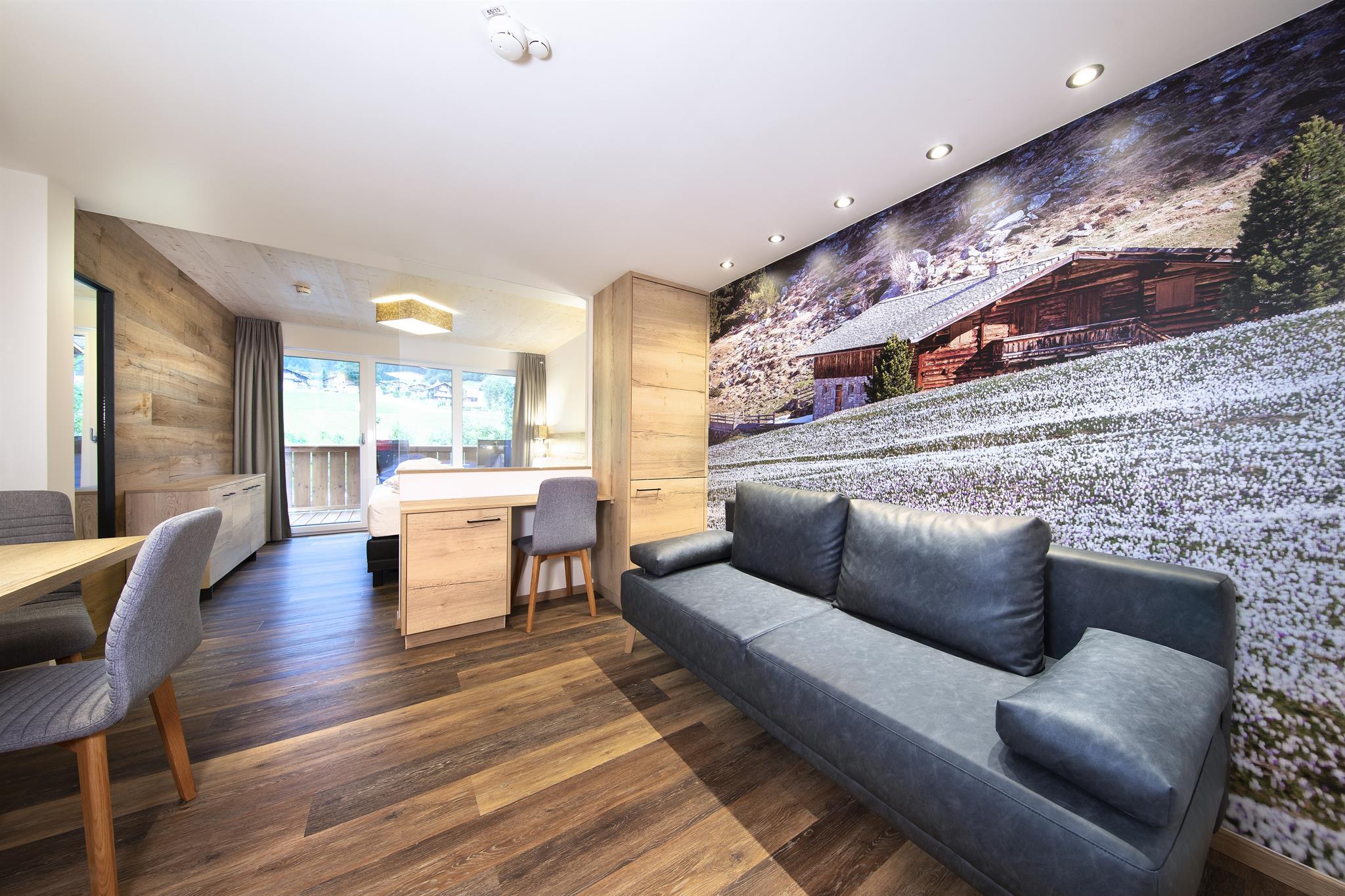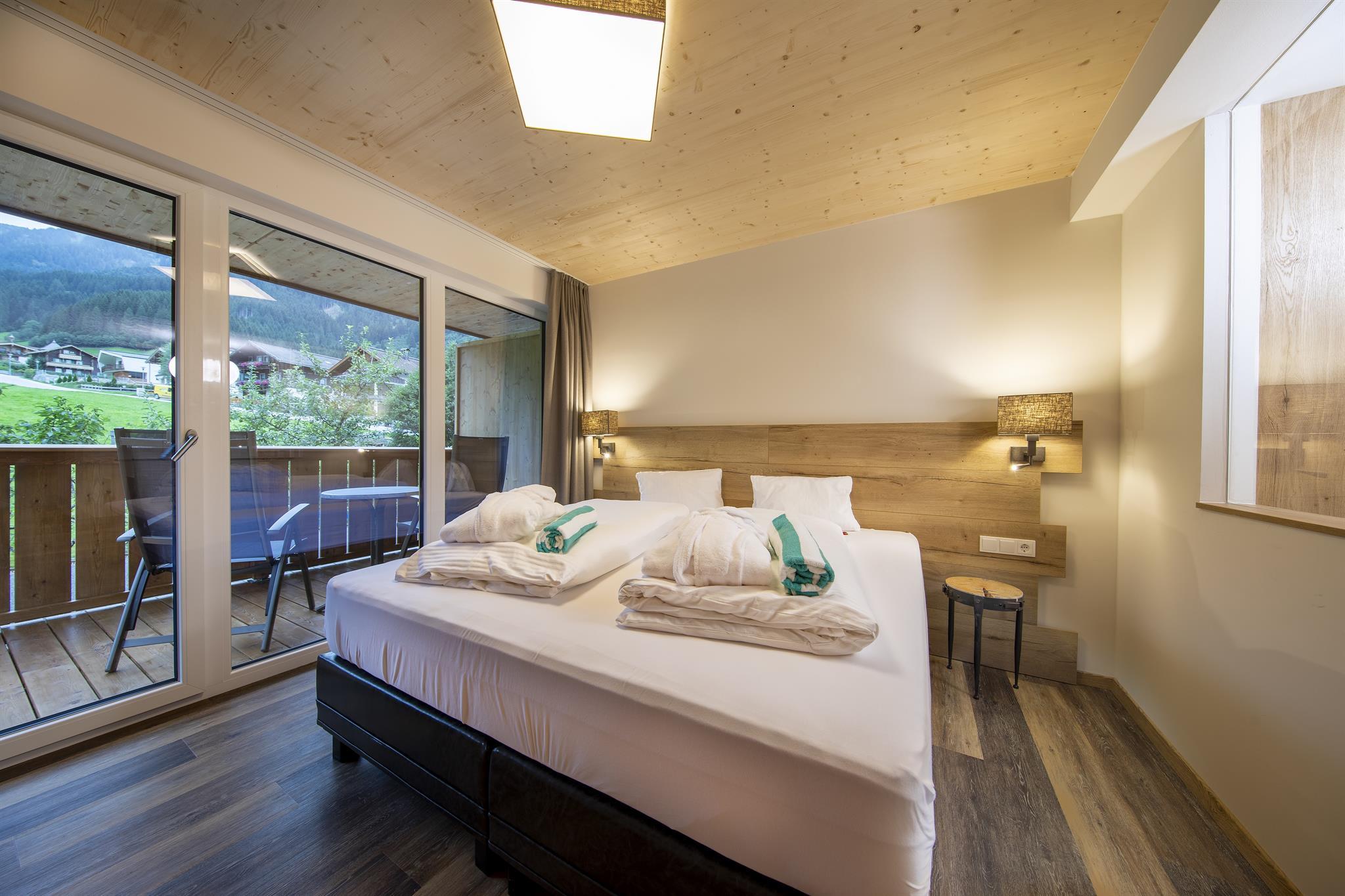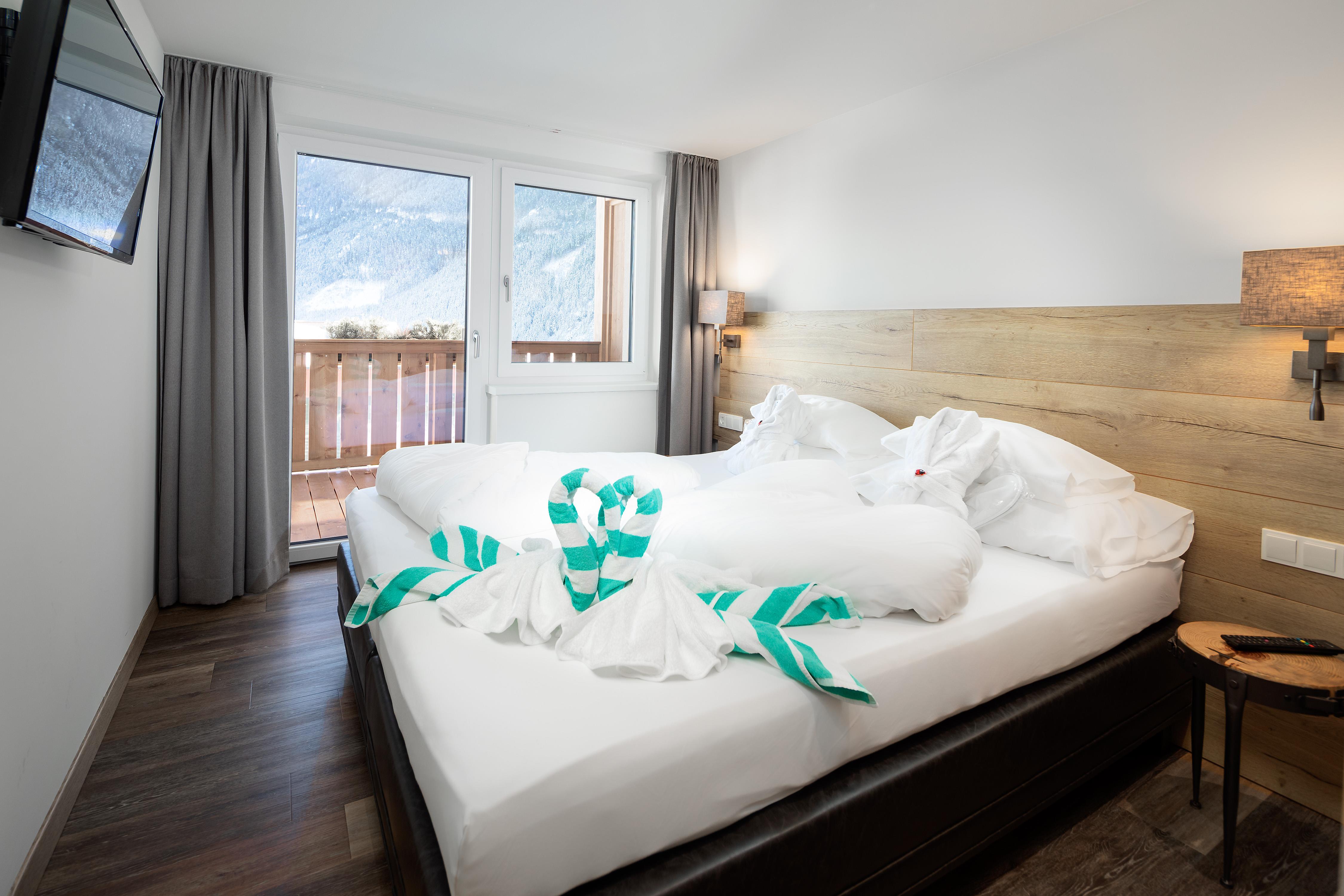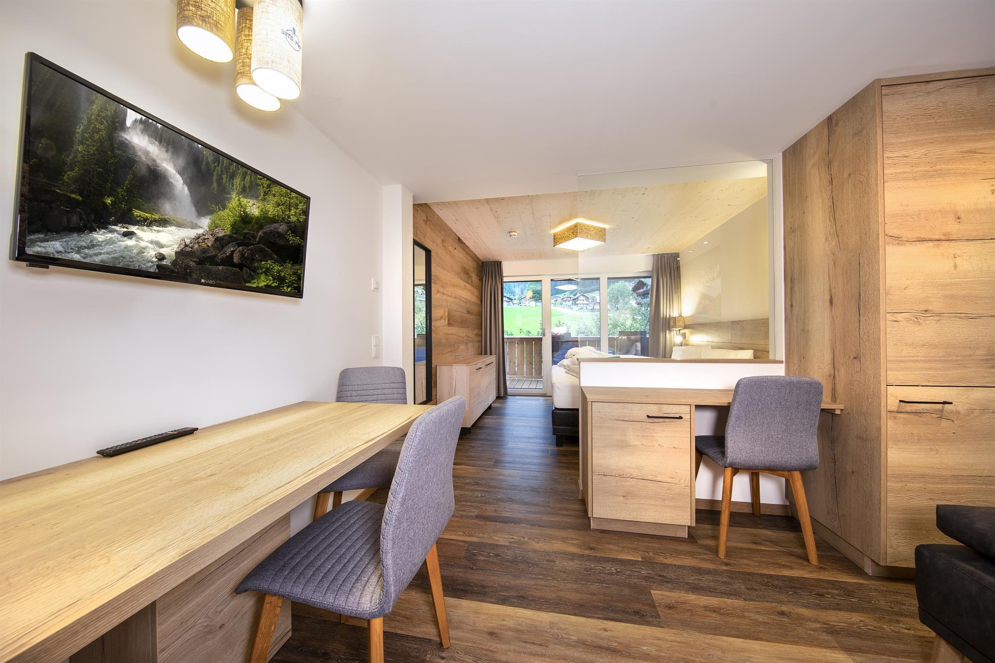 Die im Frühjahr 2019 komplett neu renovierten Zimmer (1-4 Personen) im alpin-modernen Design wurden mit natürlichen Materialien ausgestattet. Von Ihrem Balkon oder der Terrasse aus genießen Sie den Panoramablick auf die Krimmler Wasserfälle. Die allergikergerechte Ausstattung sorgt für Wohnkomfort mit höchsten Ansprüchen. Das Zimmer wird optisch in Wohn- und Schlafraum getrennt