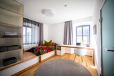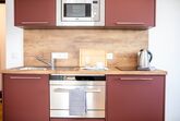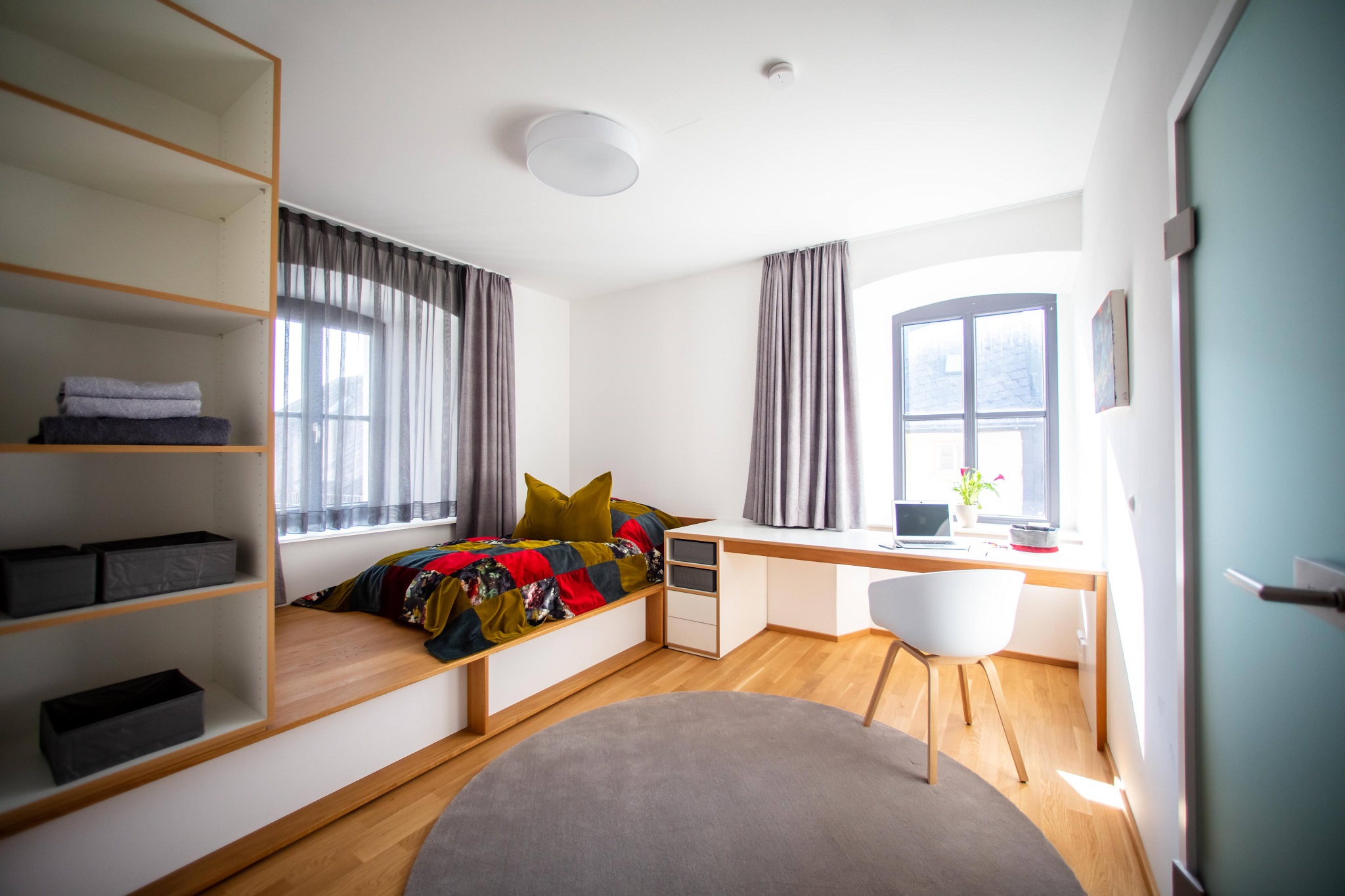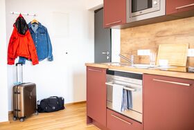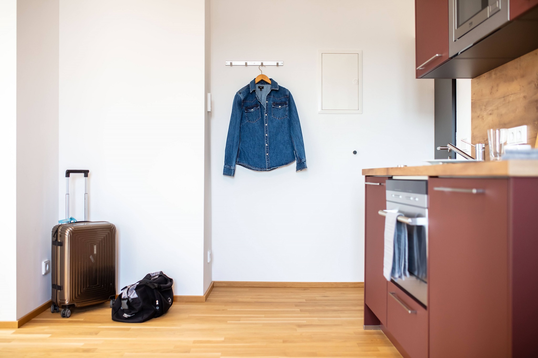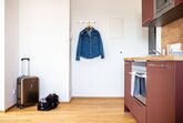 Bett (1,20 x 2 m), Schreibtisch, Sitzecke, Kleiderschrank, Küche mit Küchenutensilien, und Bad mit Dusche. Die Wohnung verfügt über Bettwäsche, Handtücher und jeglichen Kochutensilien.