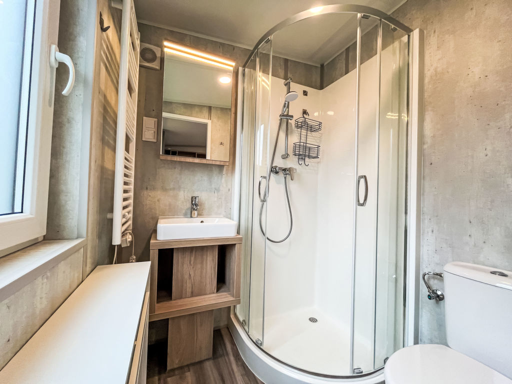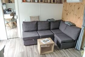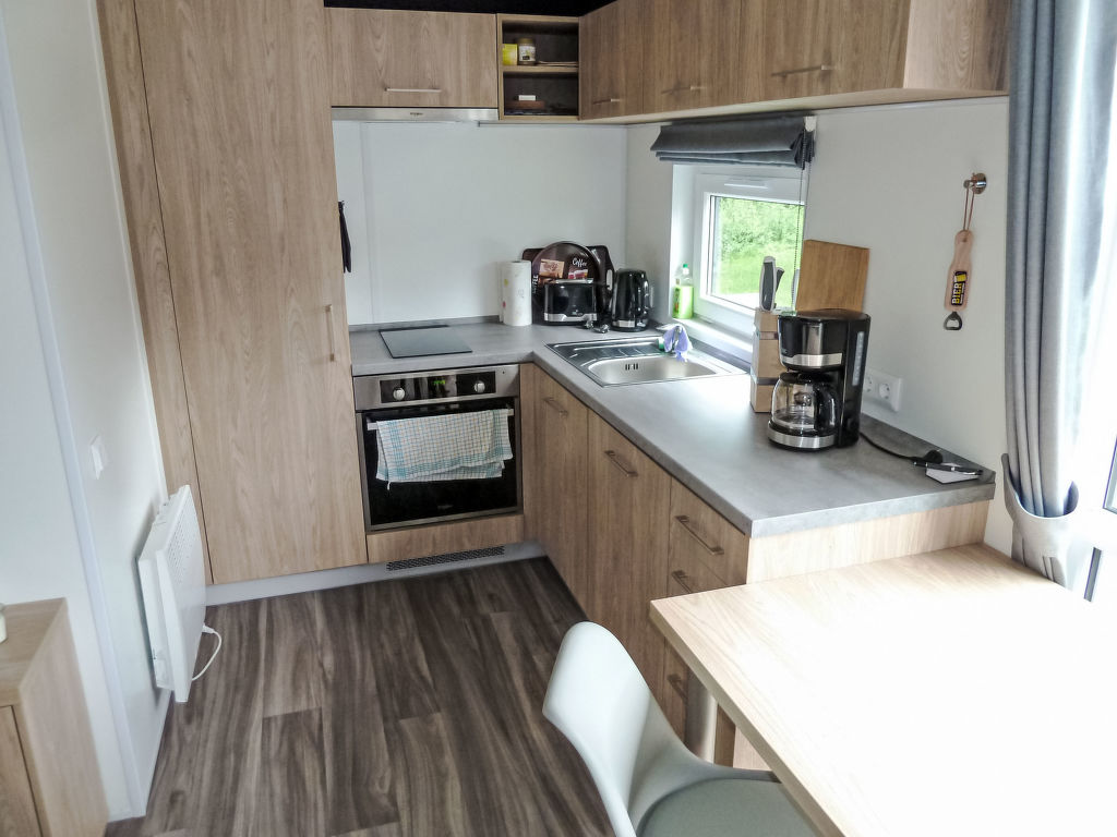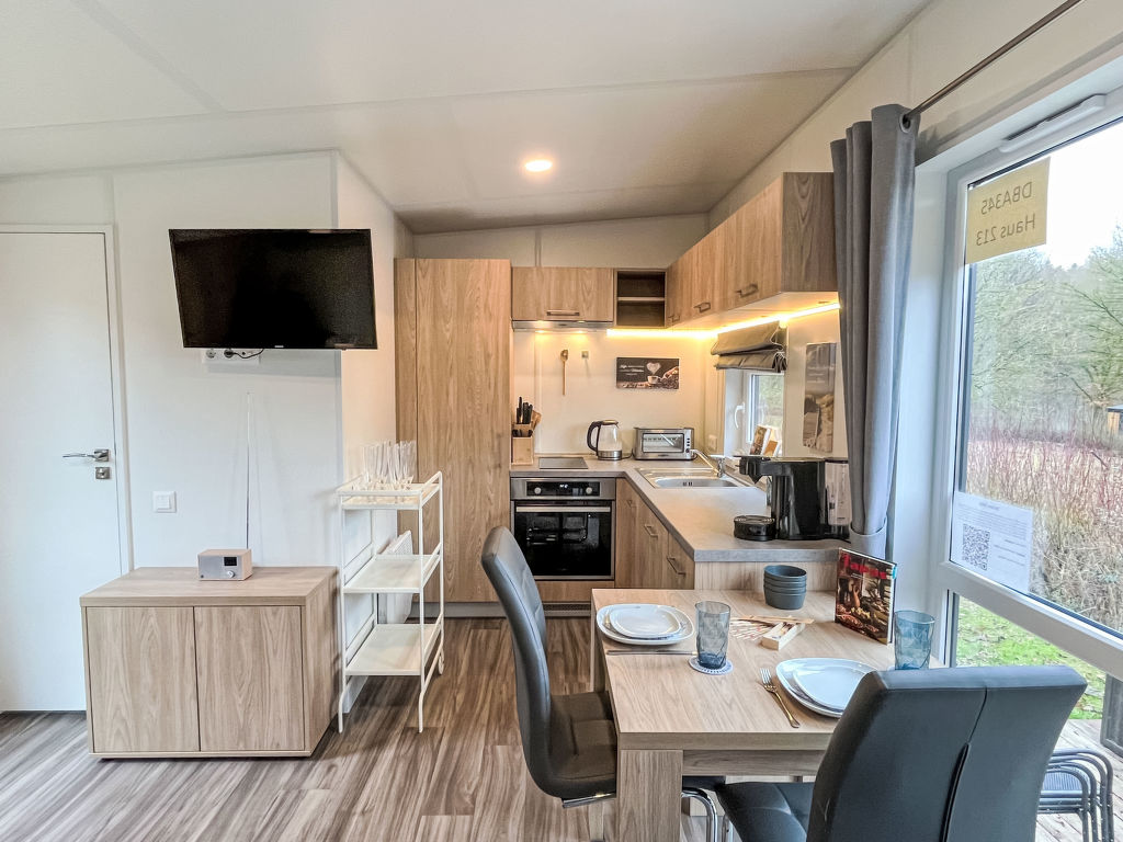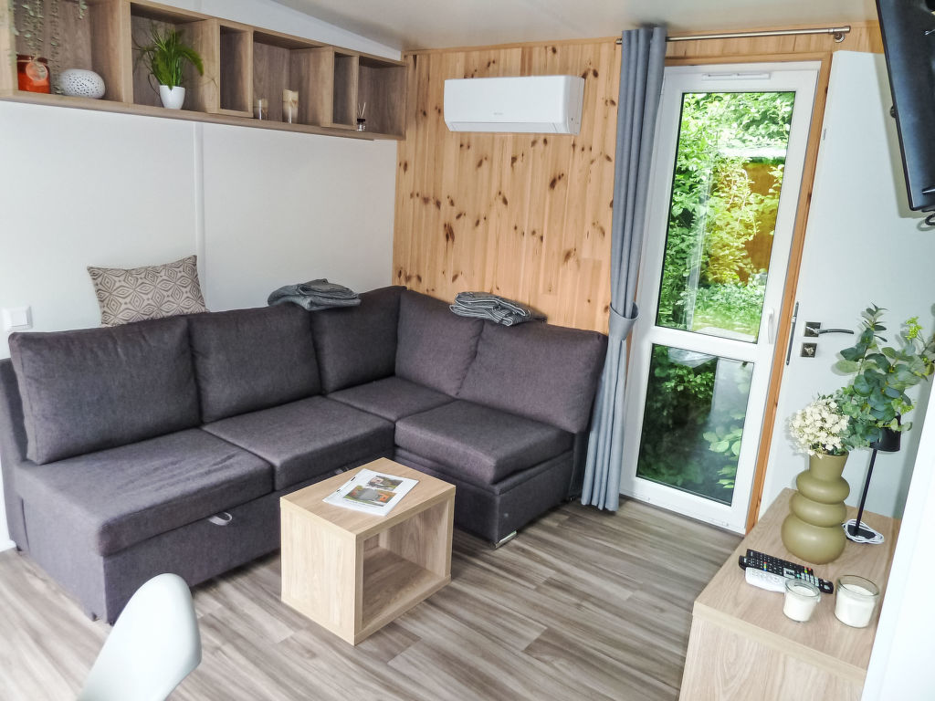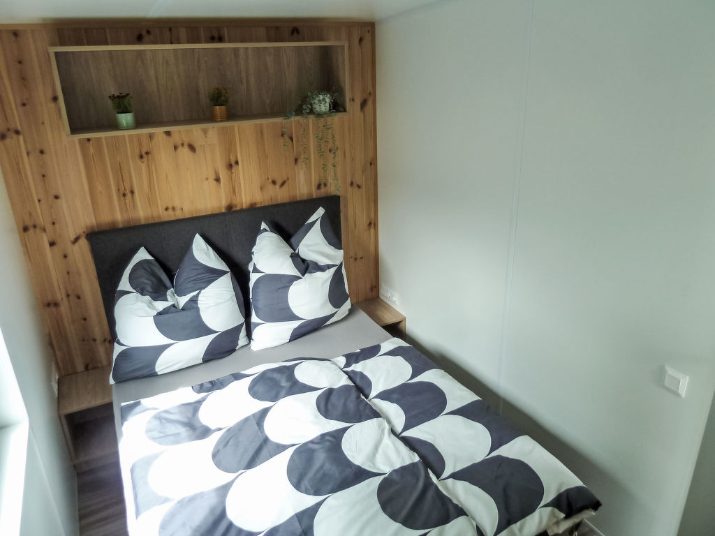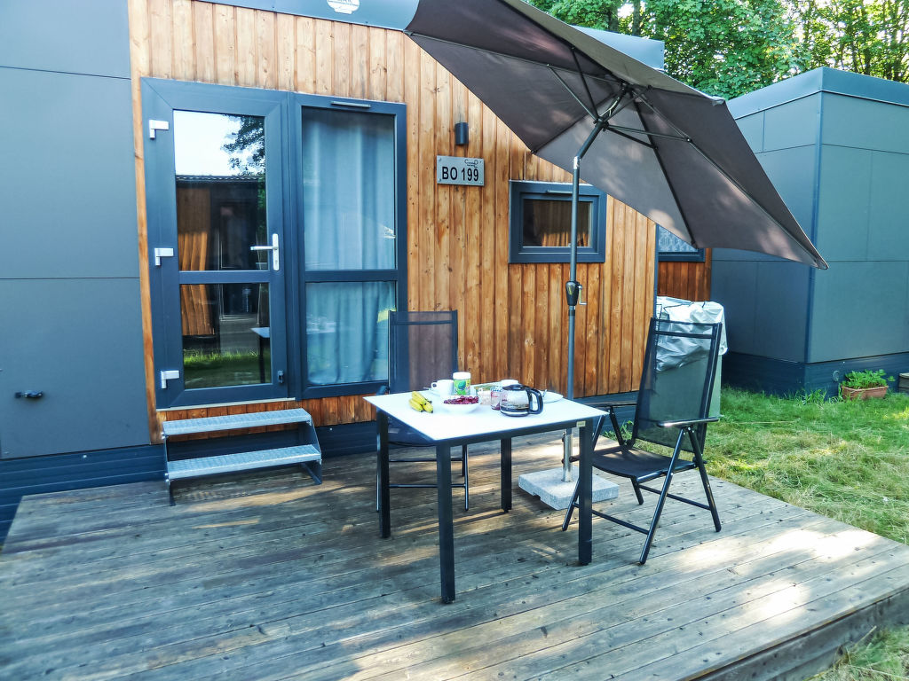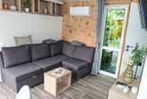 Tiny Haus Lene, 2-Zimmer-Mobilheim 25 m2. Objekt geeignet für 2 Erwachsene + 2 Kinder. Gemütlich eingerichtet: Wohn-/Schlafzimmer mit 1 Doppeldiwanbett und Sat-TV. Ausgang zur Terrasse. 1 Zimmer mit 1 franz. Bett (140 cm, Länge 200 cm). Offene Küche (Backofen, 2 Induktionskochplatten, Toaster, Wasserkocher, elektrische Kaffeemaschine). Dusche/WC. E-Heizung, Klimaanlage. Terrasse. Terrassenmöbel. Parkplatz Nr. 144 in 20 m. Bitte beachten: Nichtraucher-Haus. Maximal 1 Haustier/Hund erlaubt. ACHTUNG: Die WLAN-Verbindung kann je nach Kapazität eingeschränkt sein.