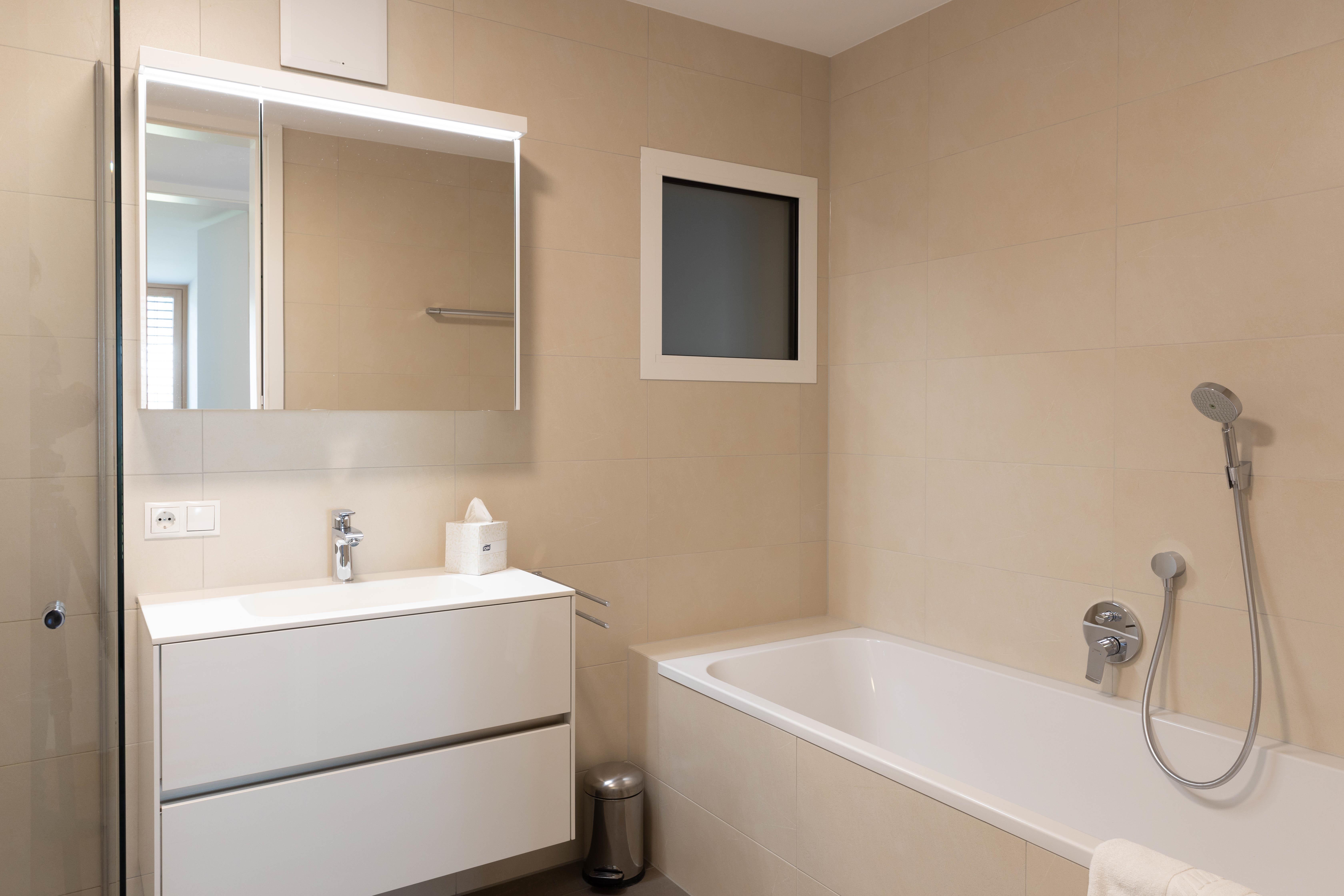 Wohnküche mit Geschirrspülmaschine, Kühlschrank, Kaffeemaschine, Gefriermöglichkeit, Elektroherd mit Backofen & Mikrowelle, Dunstabzug, etc., großzügiges Badezimmer mit Dusche, Badewanne, WC extra