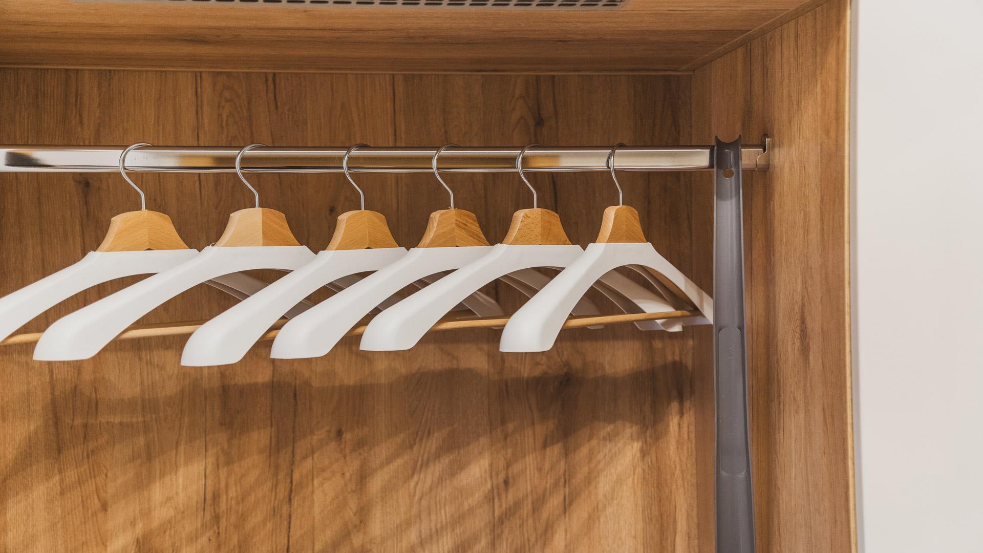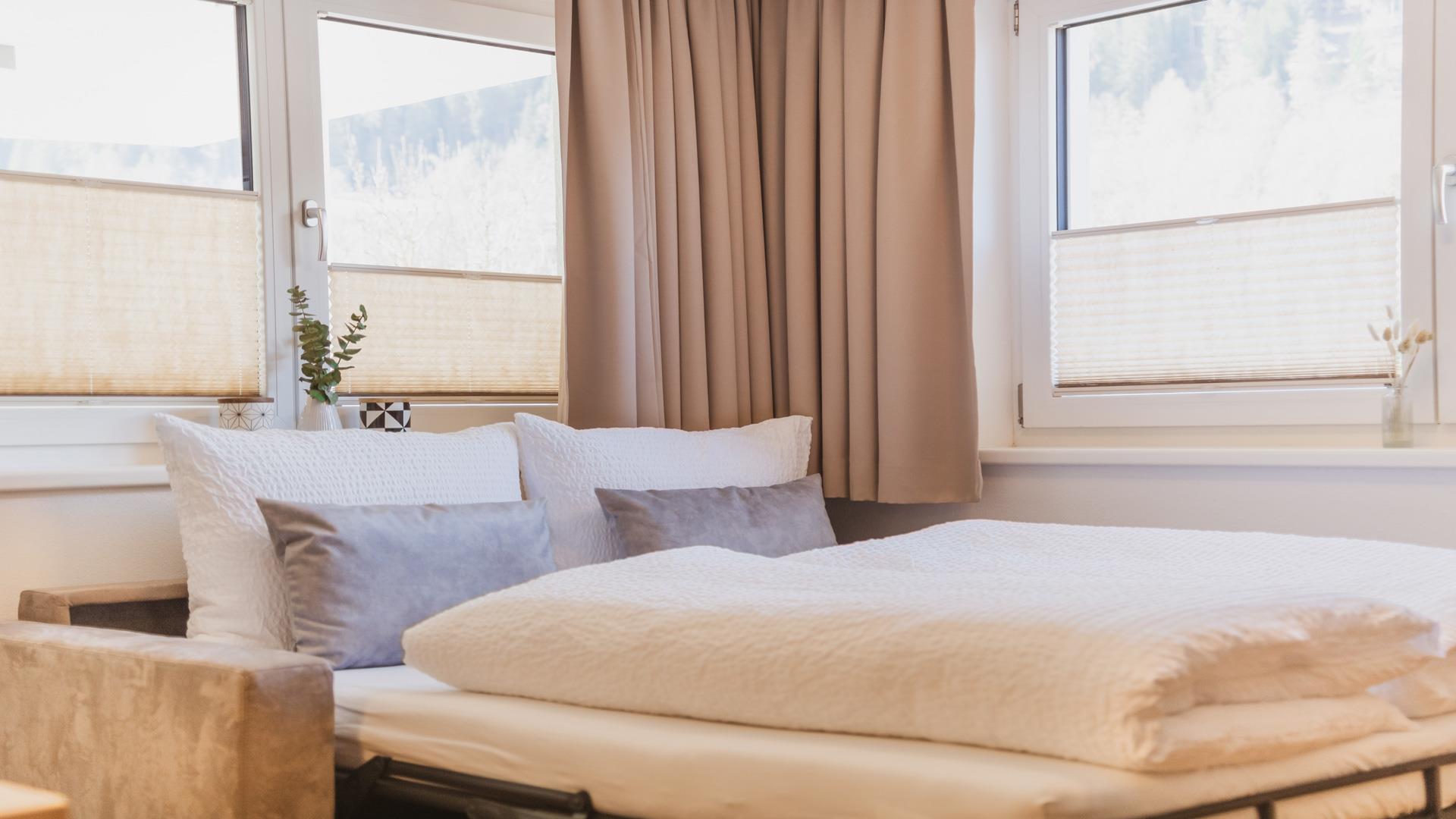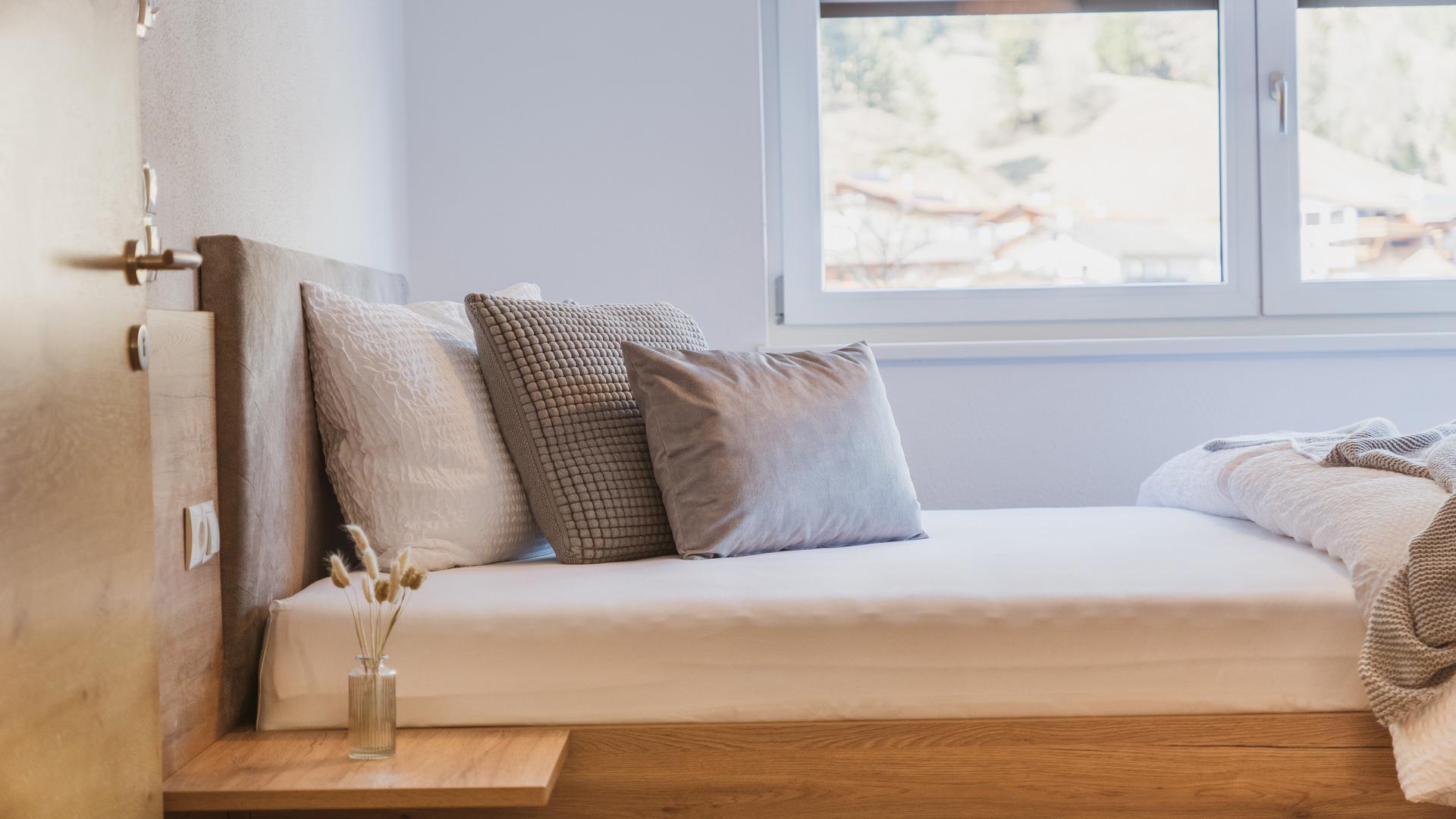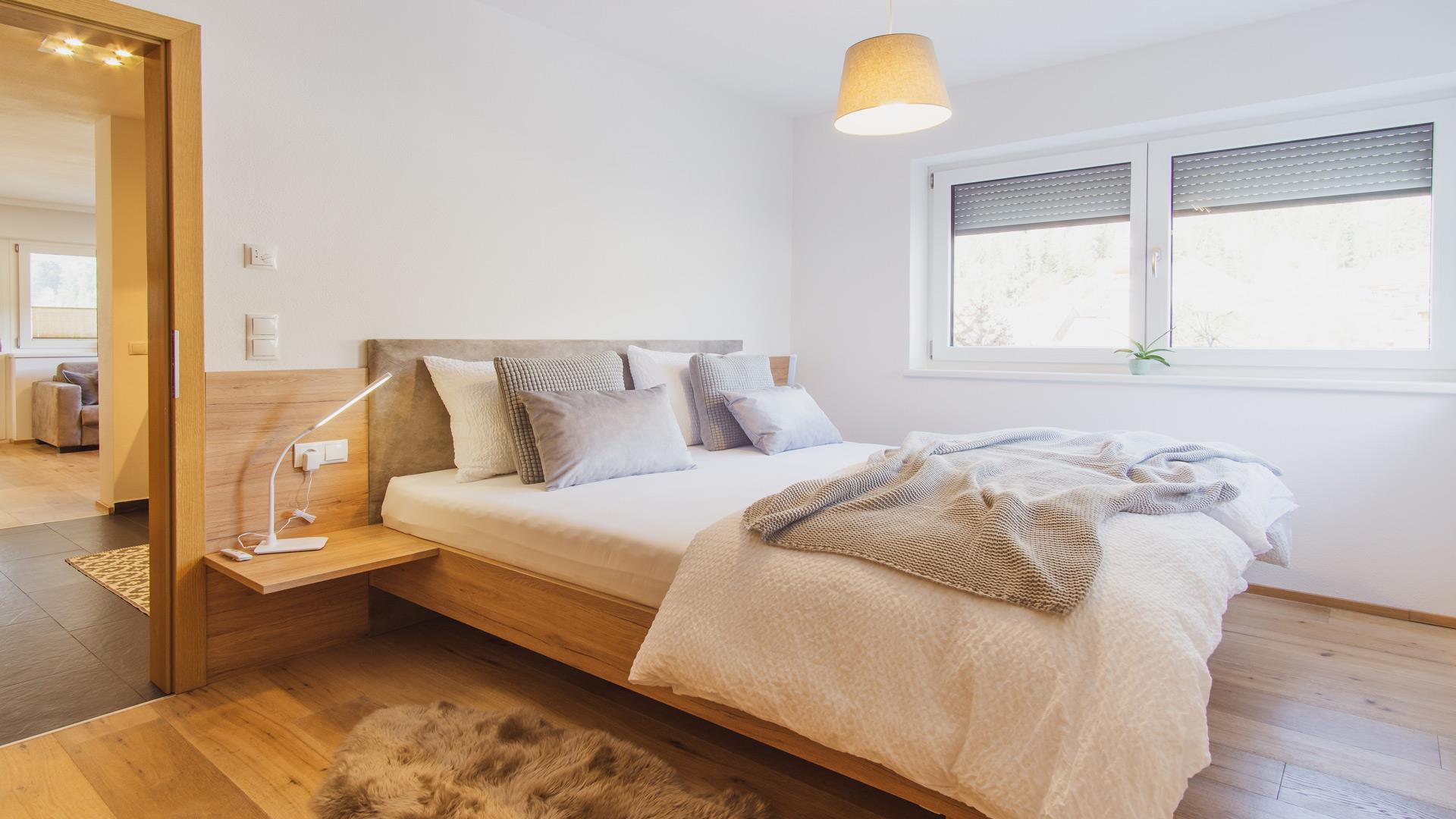 Das tischlergefertigte Schlafzimmer verfügt über frisch bezogene, allergikerfreundliche Bettwäsche und genügend Stauraum im Kleiderschrank.