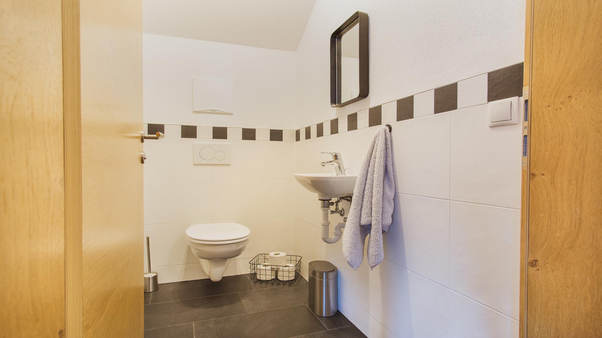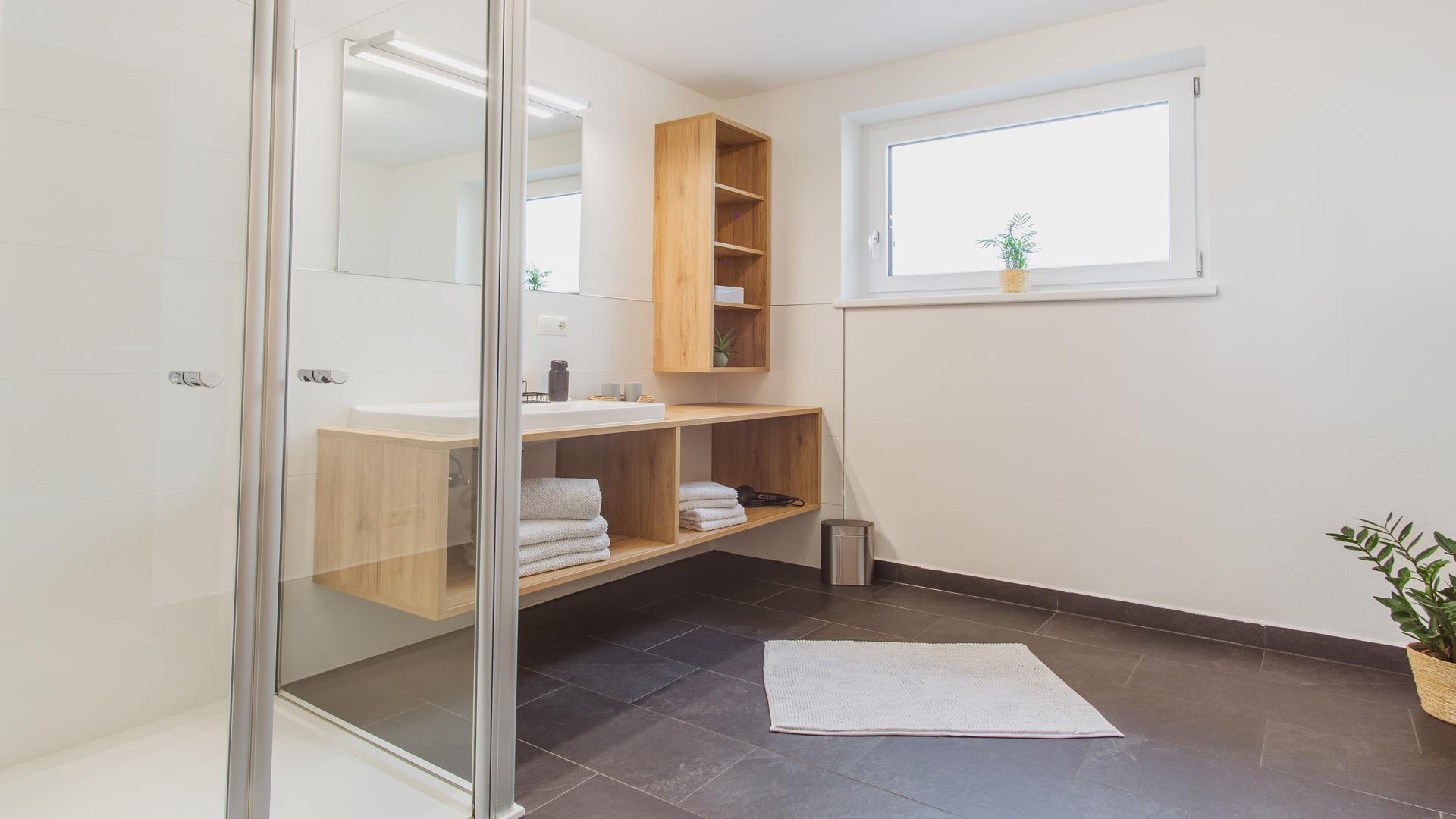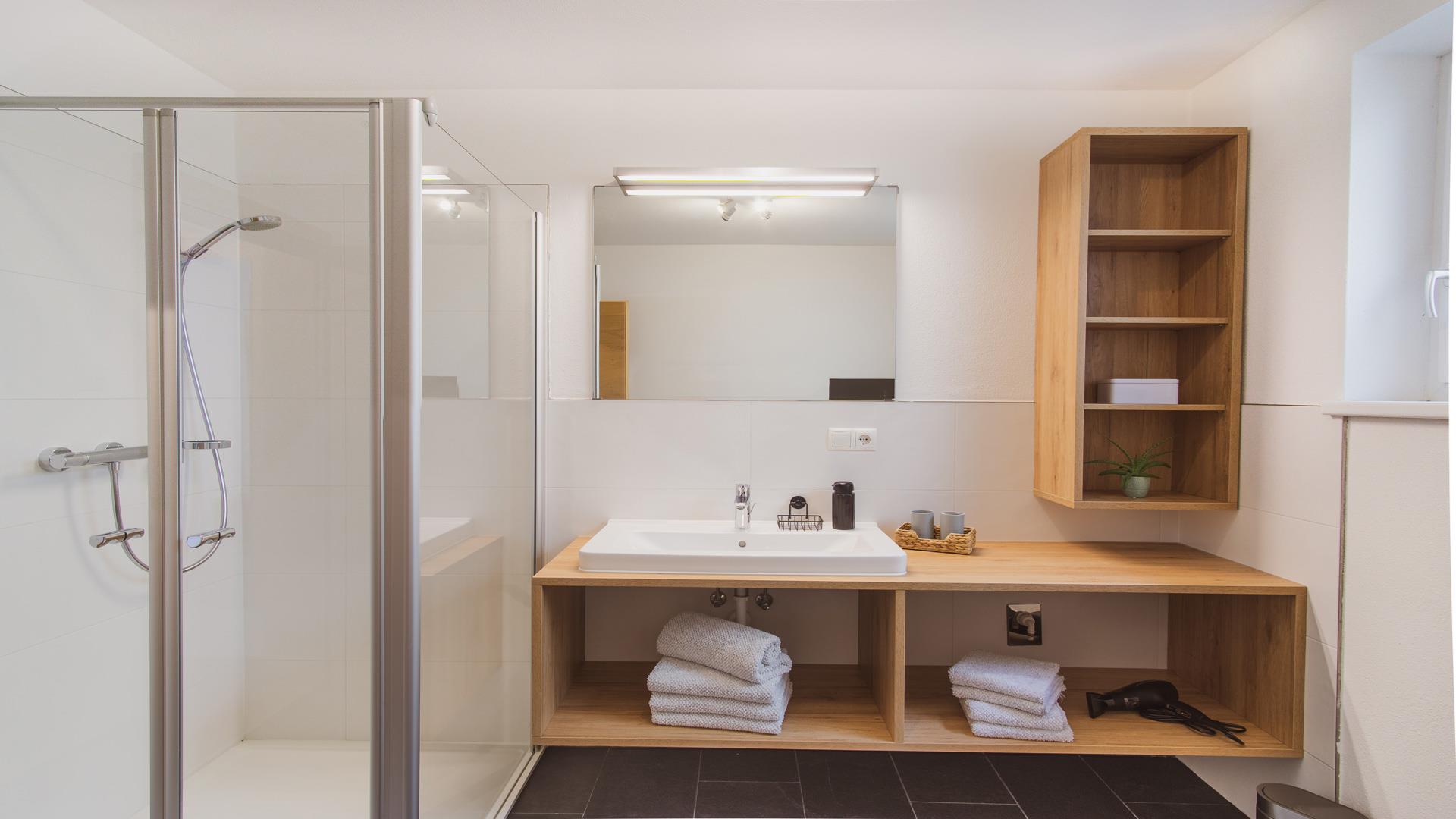 Im großzügige Badezimmer mit geräumiger Dusche und Waschbecken findet ihr Harrföhn, Handtücher, Handtuchtrockner vor. Das separat angelegte WC mit Waschbecken soll Euch weiteren Komfort bieten.