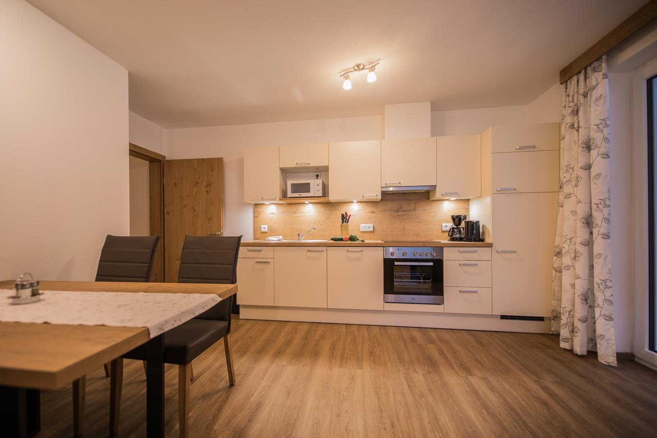 • 1 Wohnküche komplett ausgestattet mit gemütliche Polstersitzecke und großem Esstisch