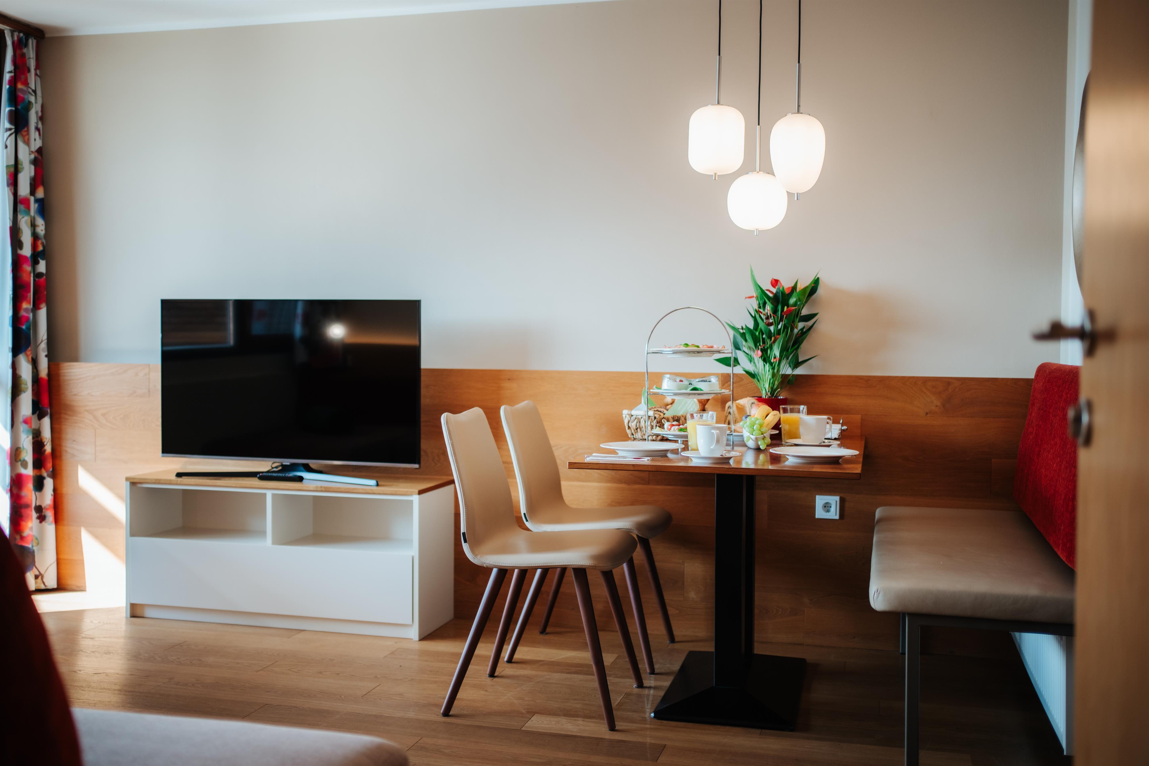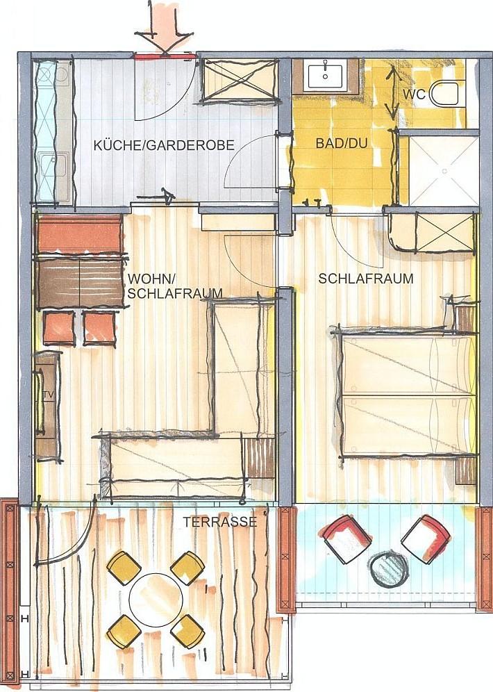 Dieses Apartment verfügt über ein Schlafzimmer mit raumhohen Panoramafenstern, ein Wohnzimmer mit Essbereich, Flat-Screen, Telefon, Stereo-Anlage und zwei qualitativ hochwertige Couch-Betten, einen Vorraum mit umfassend ausgestatteter Küche sowie ein Badezimmer mit Dusche und WC und einer großen südseitigen Terrasse.