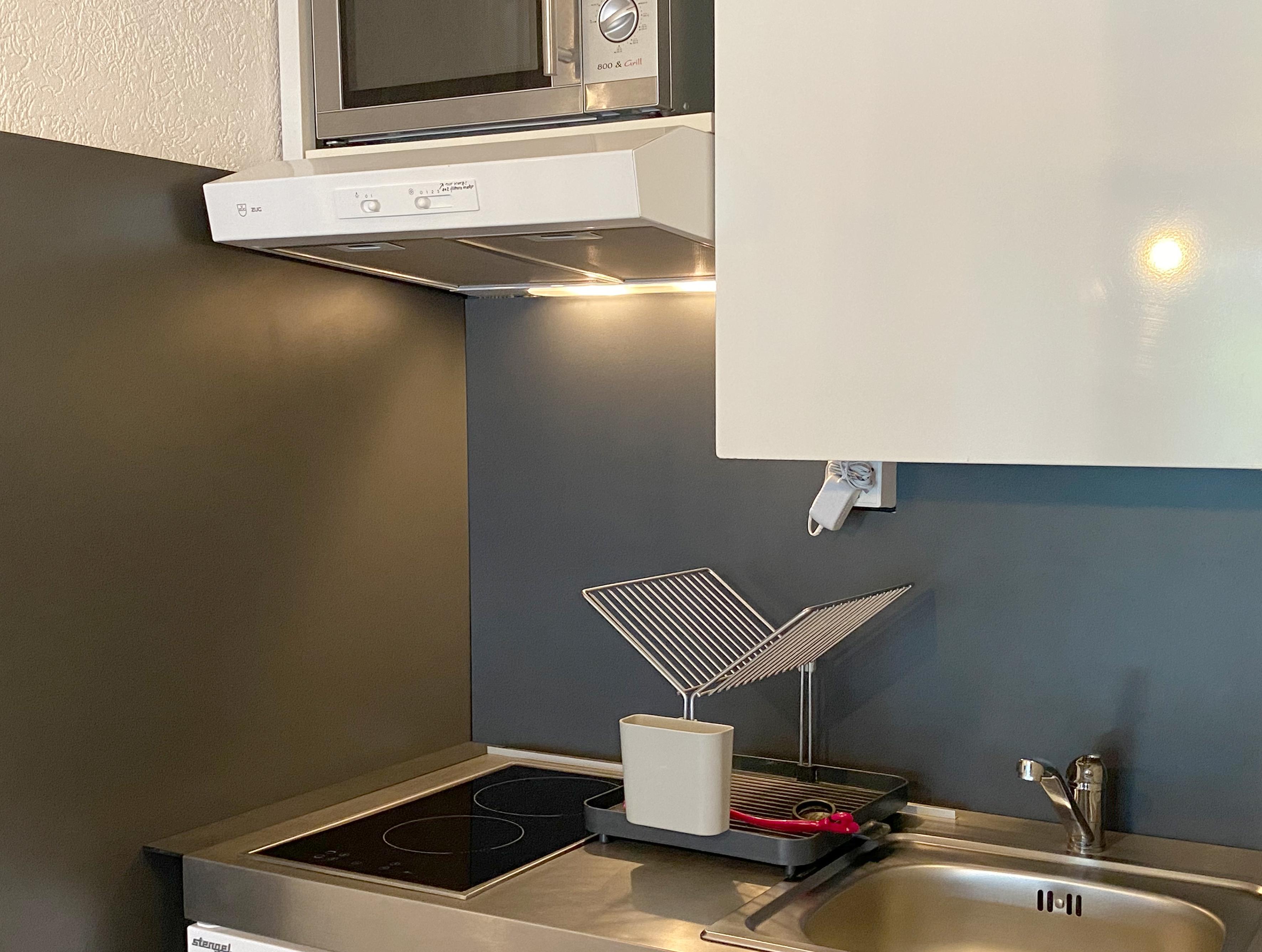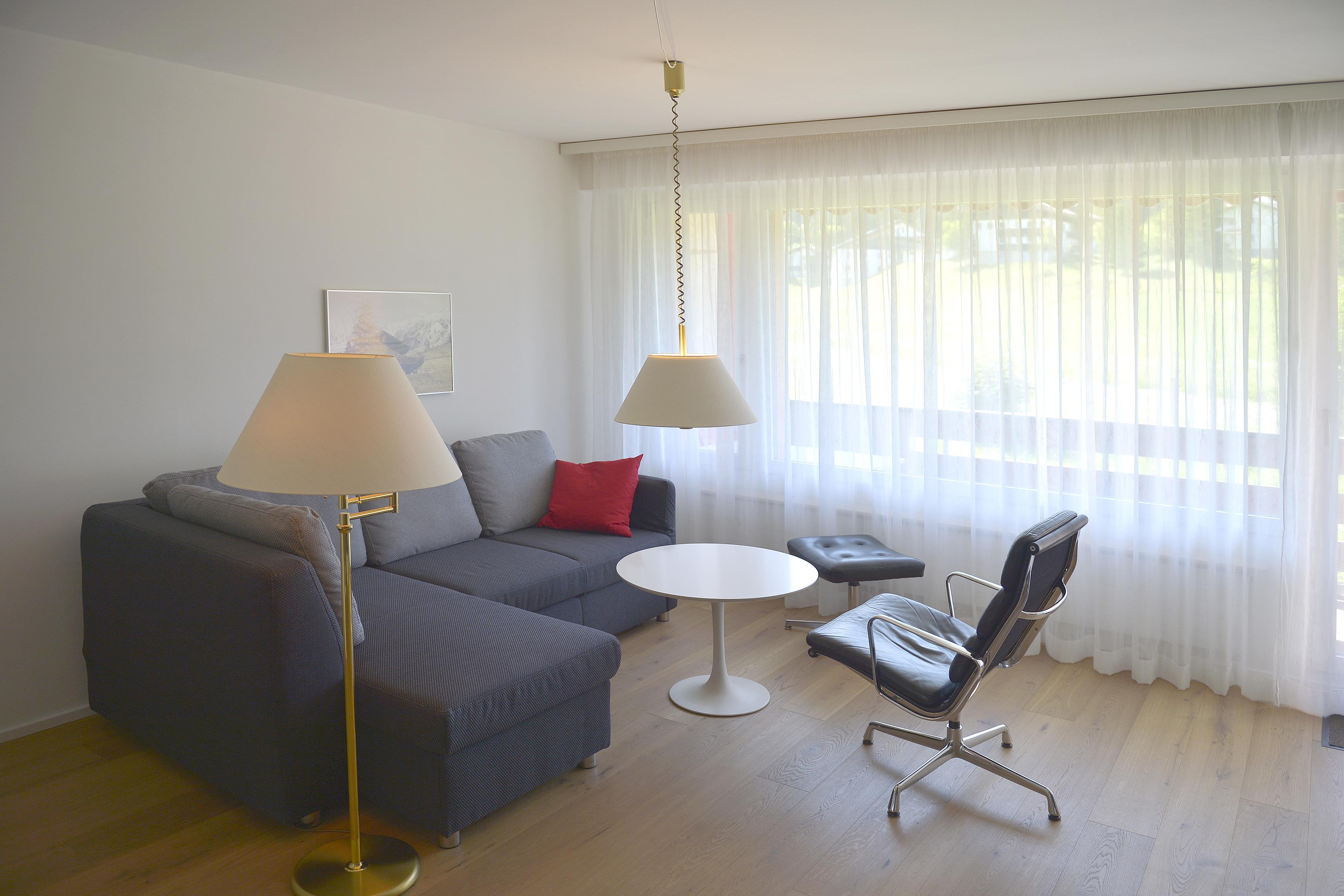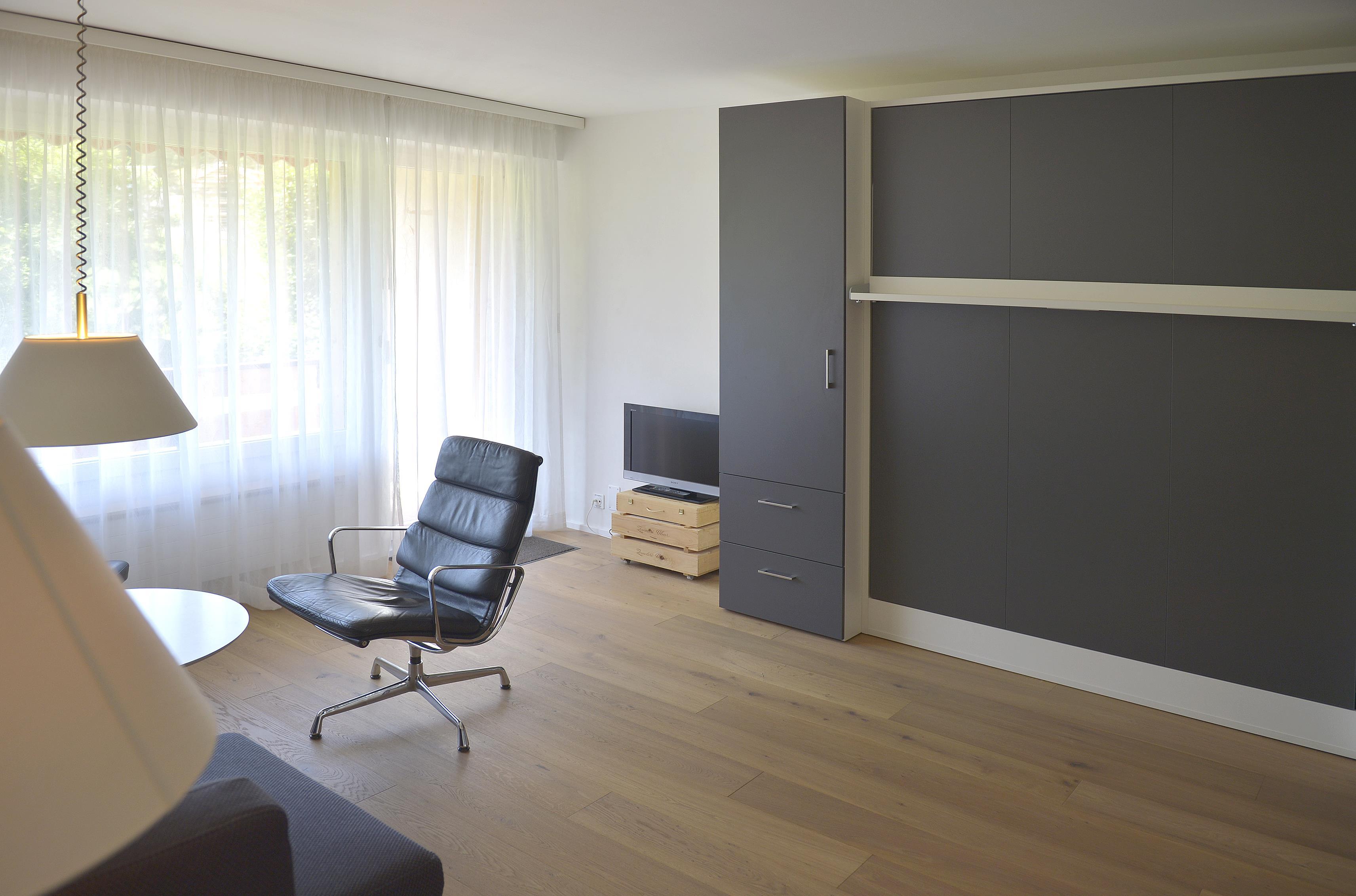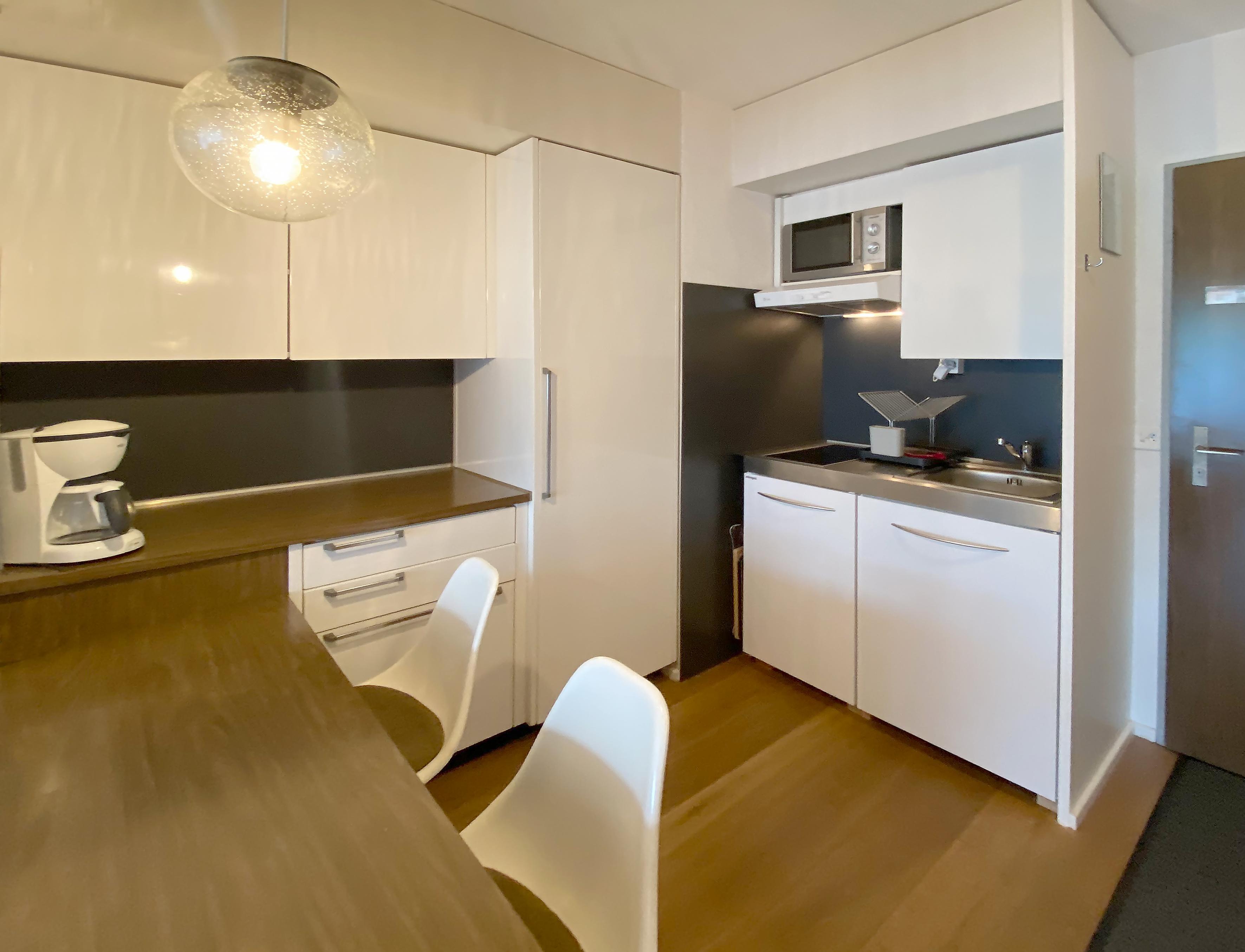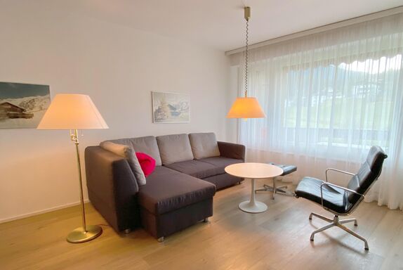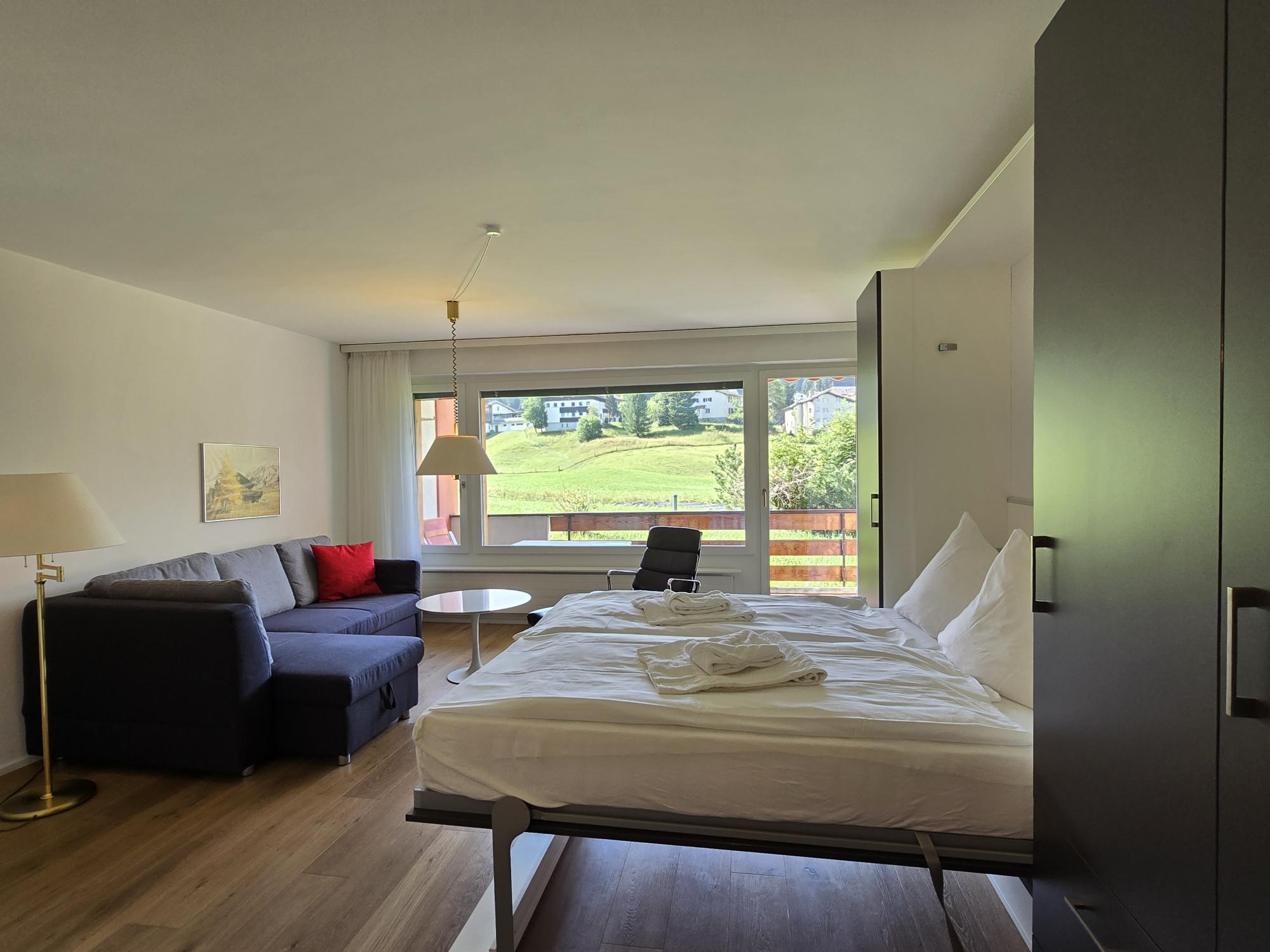Kleine 1 - Zimmerwohnung im Herzen von Parpan. Die Ferienwohnung ist klein aber fein, das Box-Springbett ist im Wohnbereich als Schrankbett zum Ausklappen. Ebenso hat die Wohnung einen sonnigen, gedeckten Süd-Balkon.