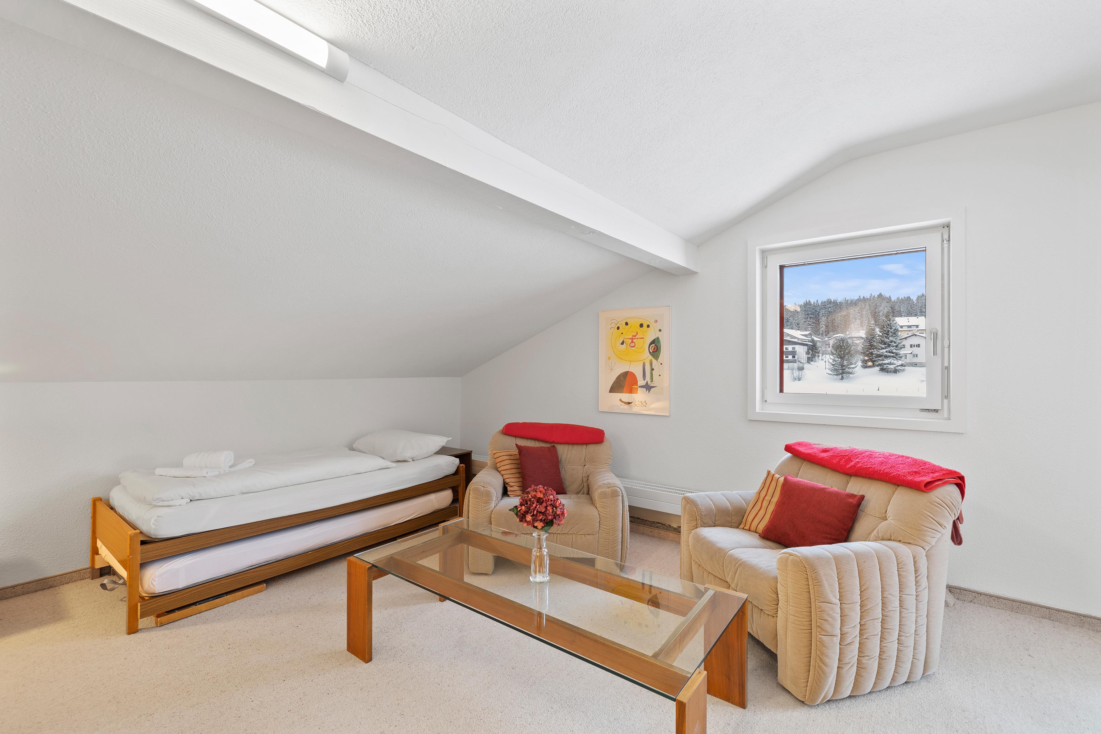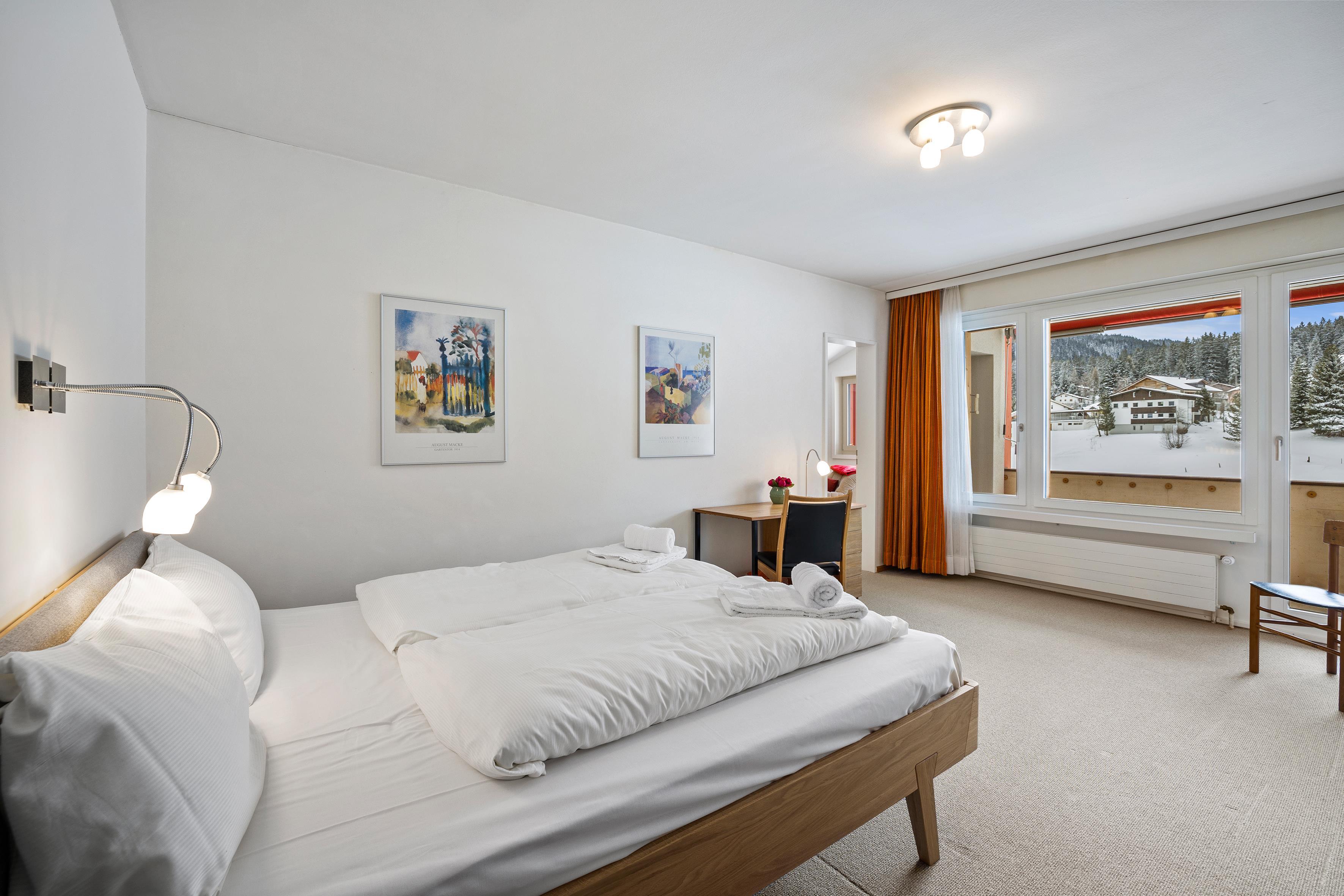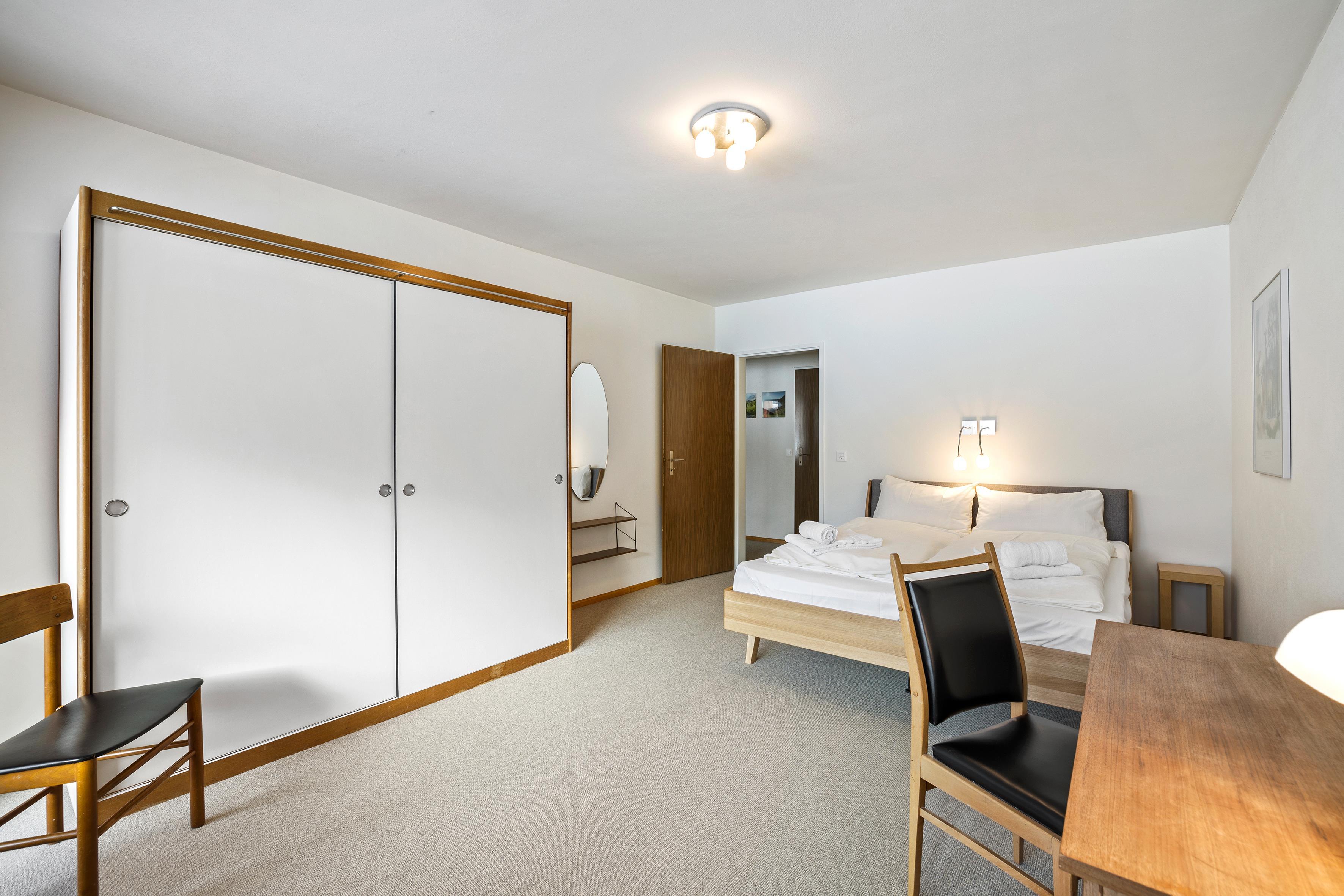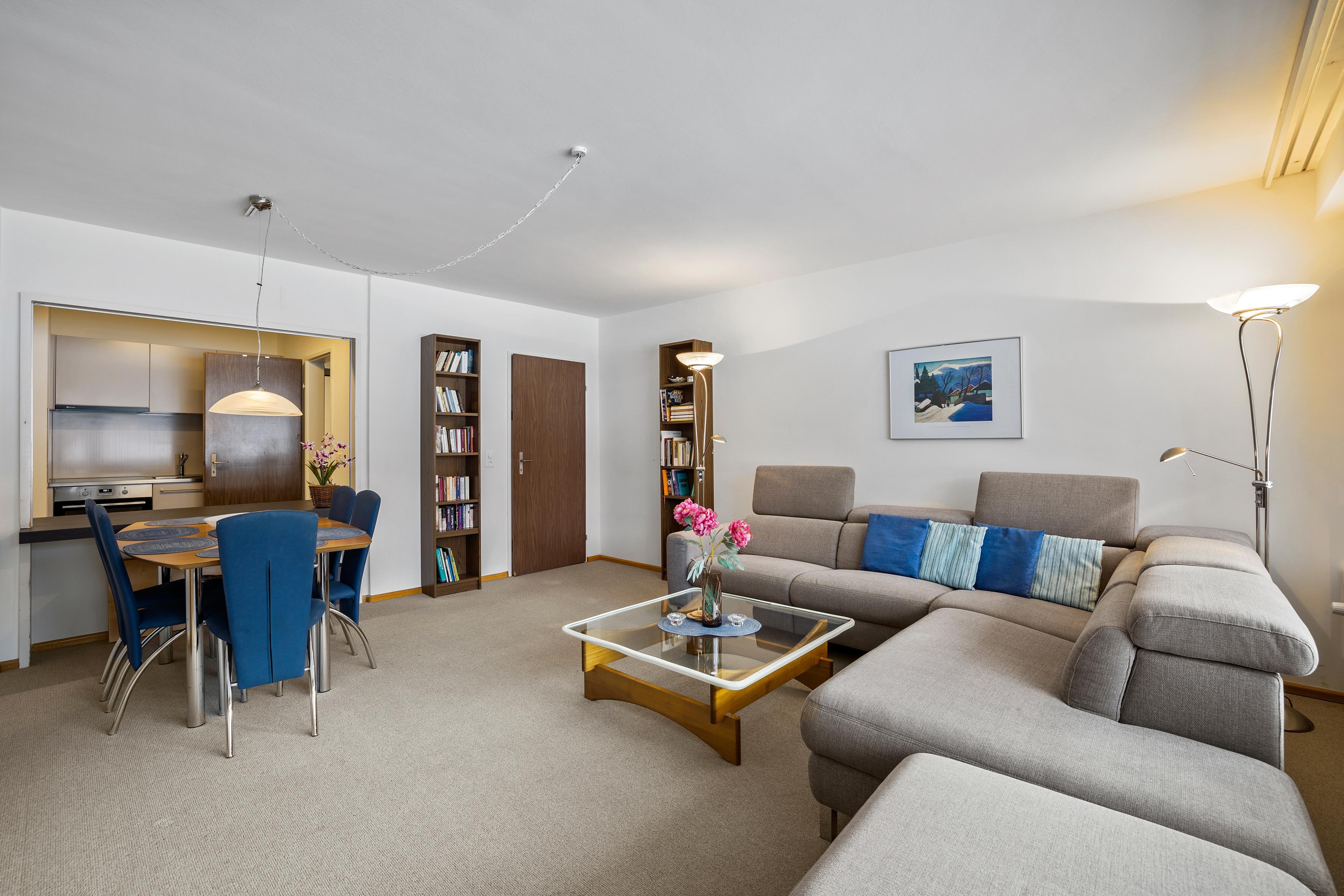 Um in das 4 Bettzimmer zu gelangen, muss man durch das Doppelzimmer gehen. Der Wohnbereich ist sehr grosszügig und ebenso verfügt die Wohnung über einen gedeckten Süd-Balkon.