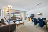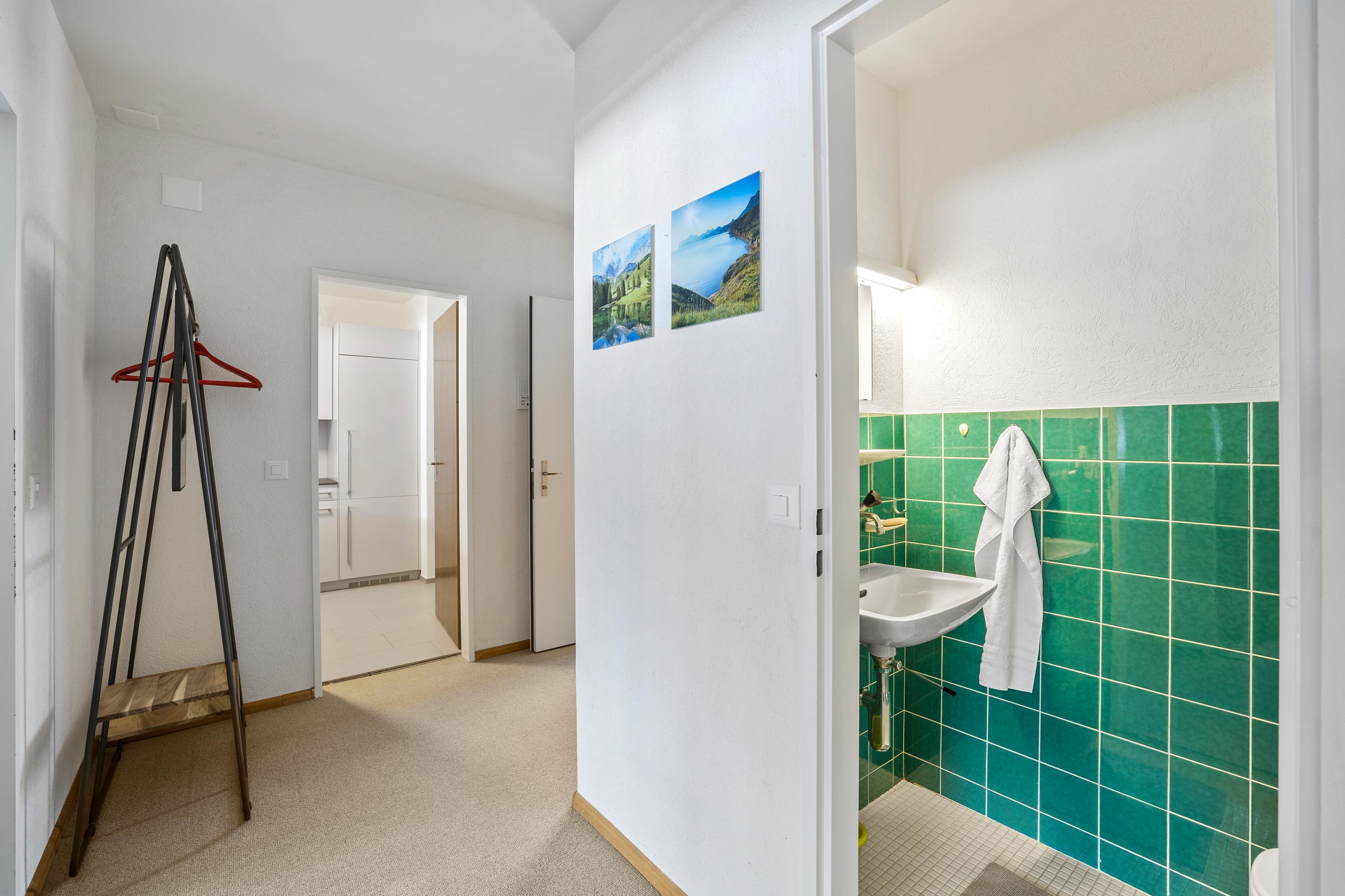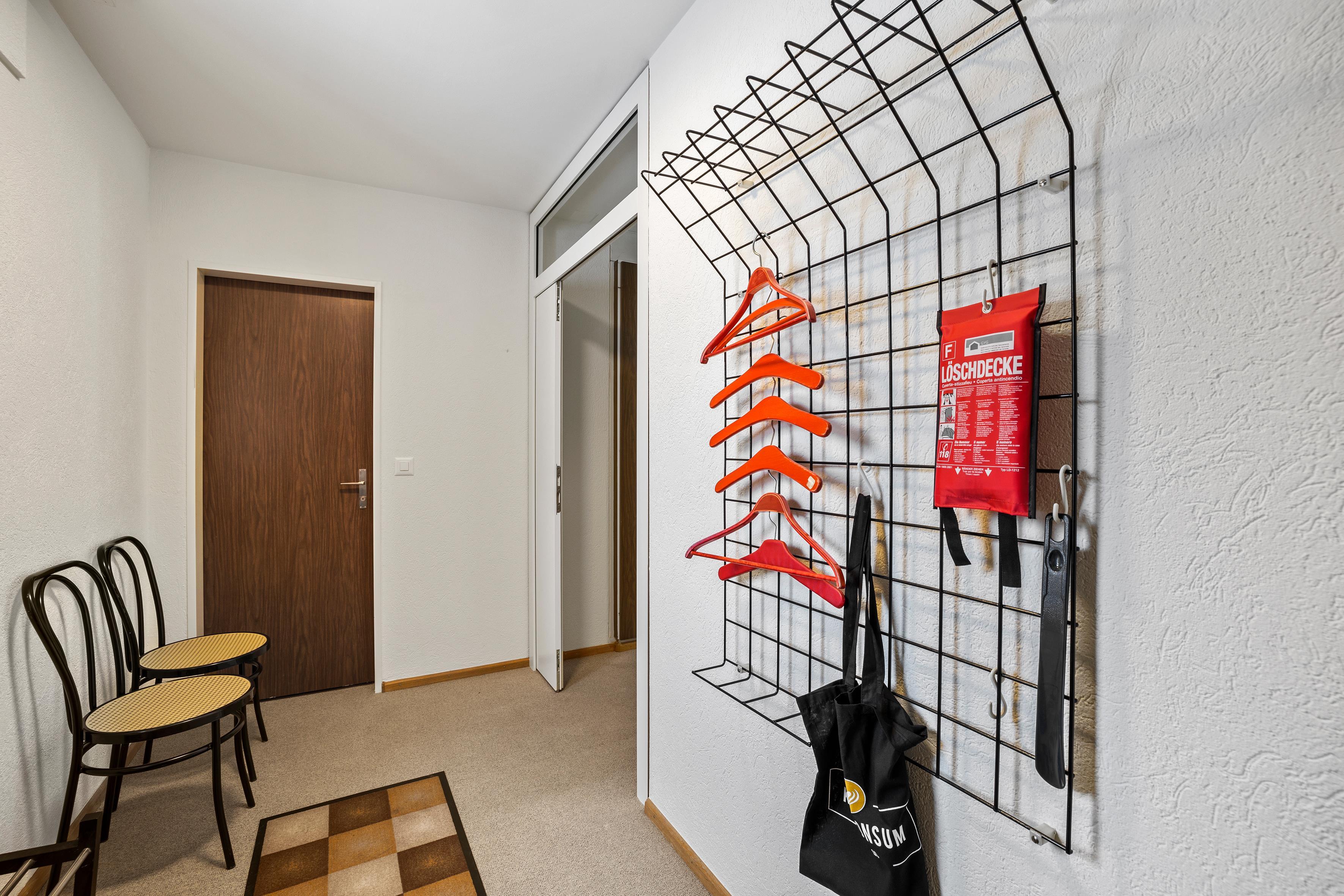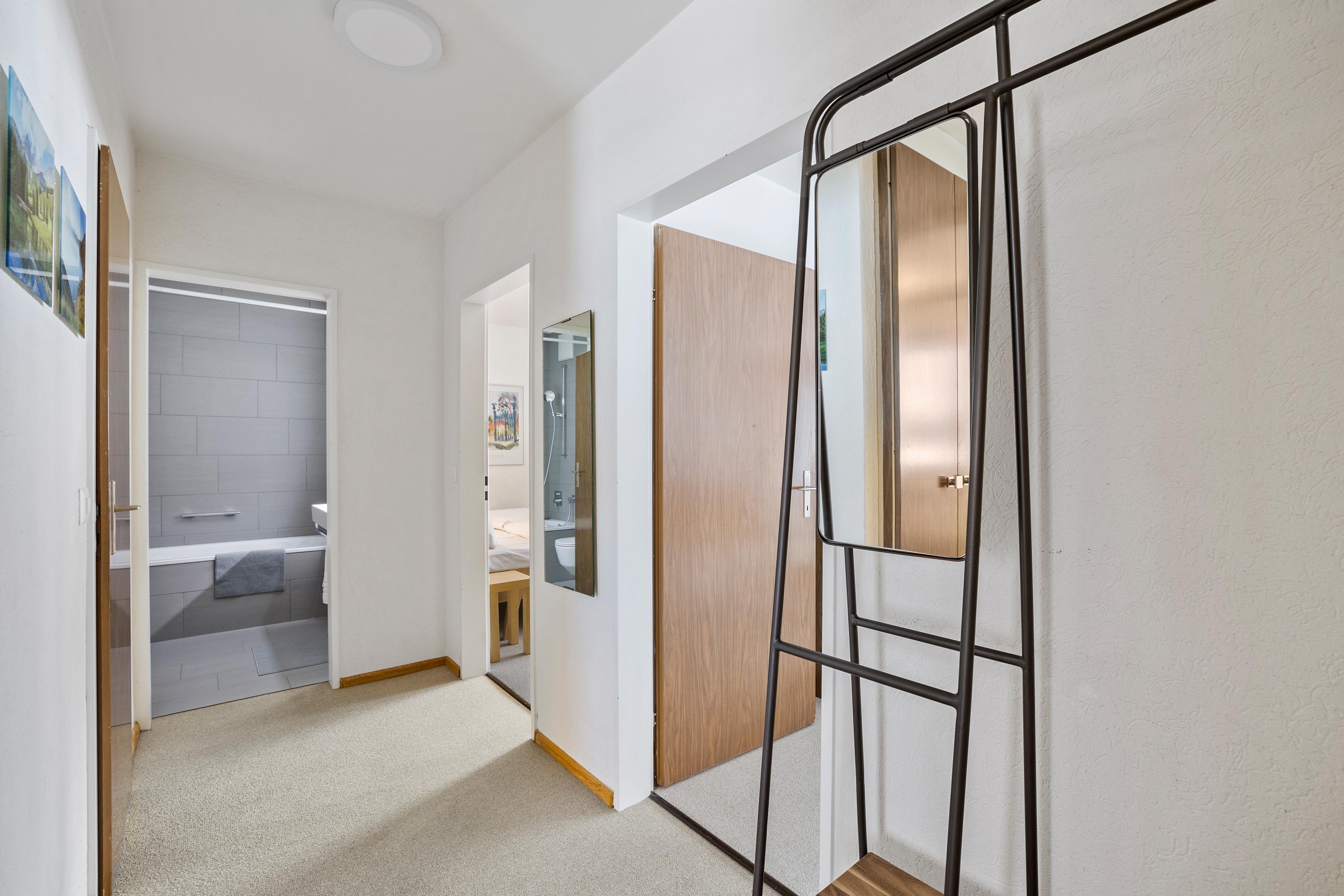 Um in das 4 Bettzimmer zu gelangen, muss man durch das Doppelzimmer gehen. Der Wohnbereich ist sehr grosszügig und ebenso verfügt die Wohnung über einen gedeckten Süd-Balkon.