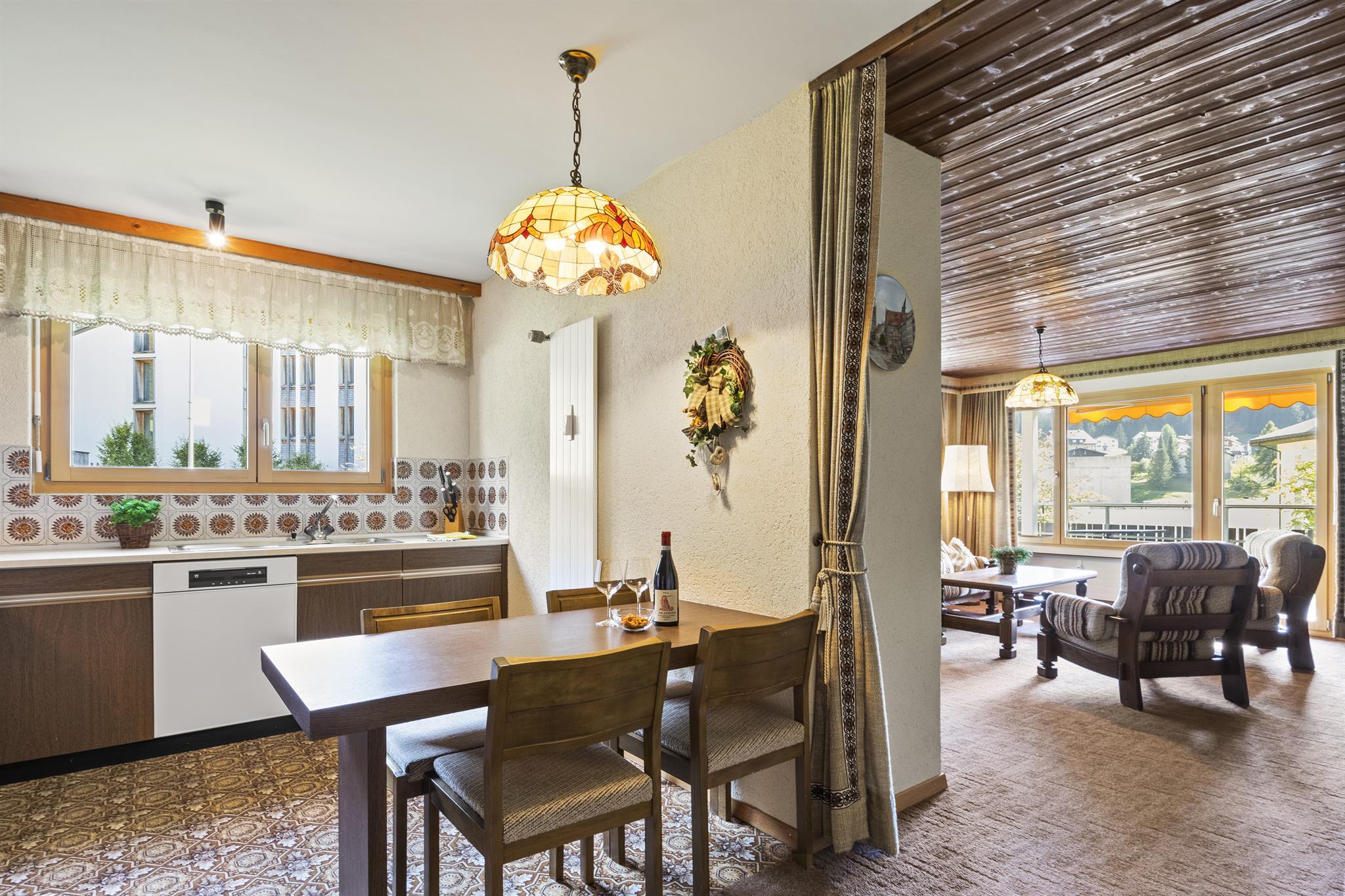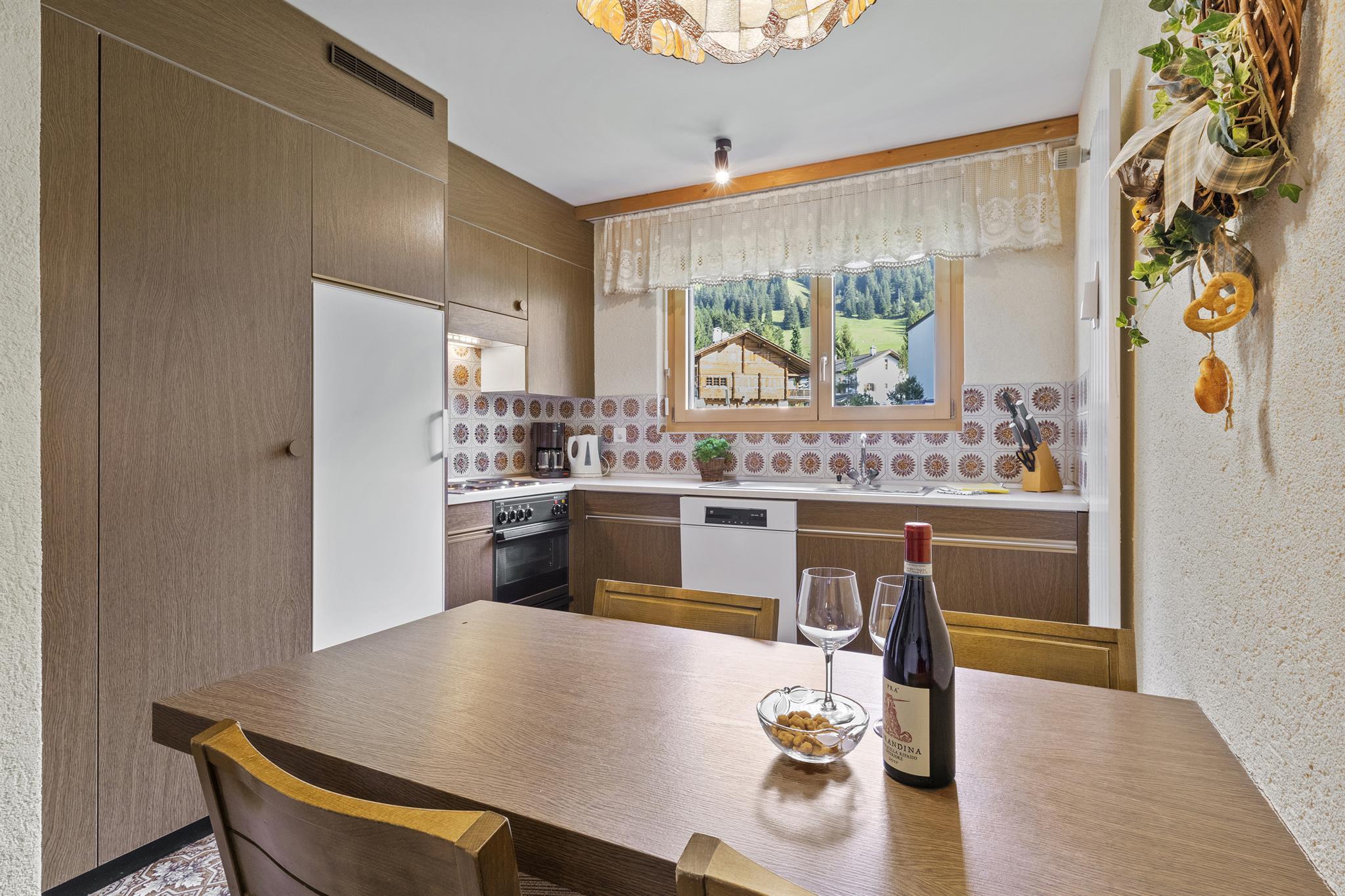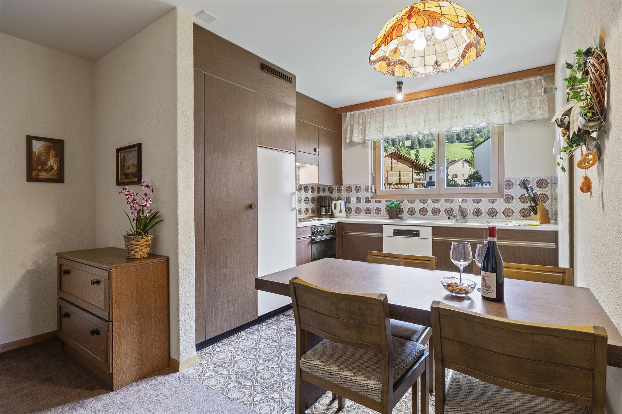Rustikale 2.5 - Zimmerwohnung in einem Mehrfamilienhaus. Die 4 Bett-Wohnung befindet sich im 1. Obergeschoss und ist mit Teppichboden ausgestattet, sie verfügt über eine offene Wohnküche.