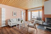 1.5 Zimmer-Ferienwohnung in einem Mehrfamilienhaus, offene Küche mit Essbereich, Wohnzimmer mit zwei Schrankbetten, Cheminée, gedeckter Süd-Balkon.