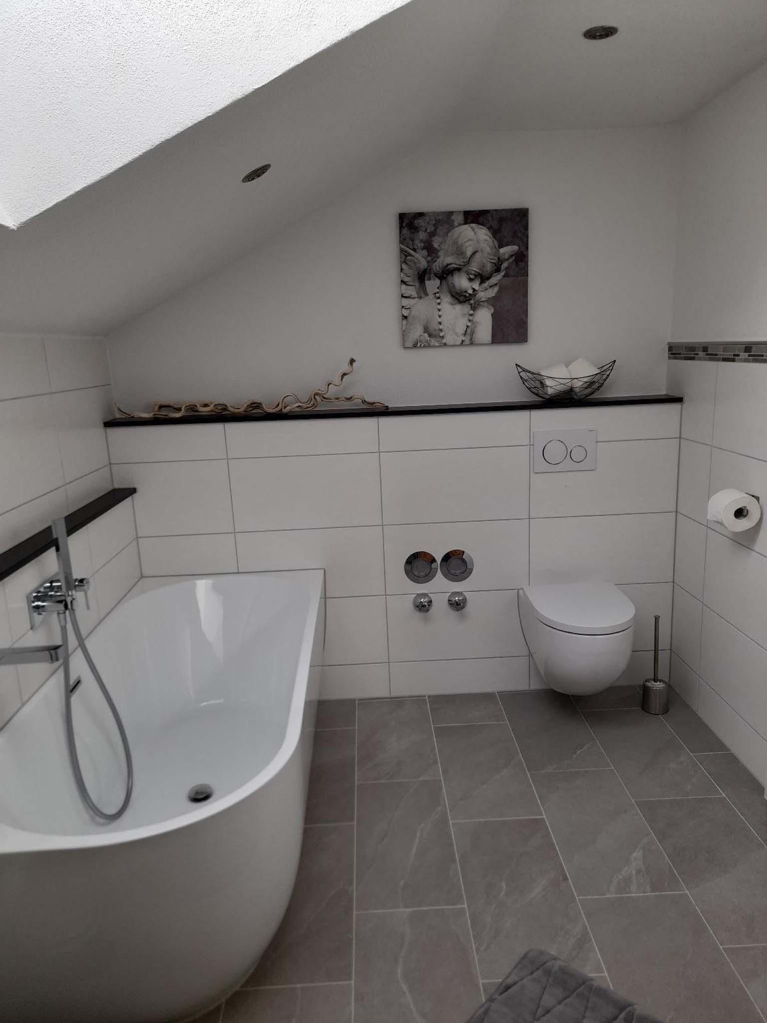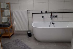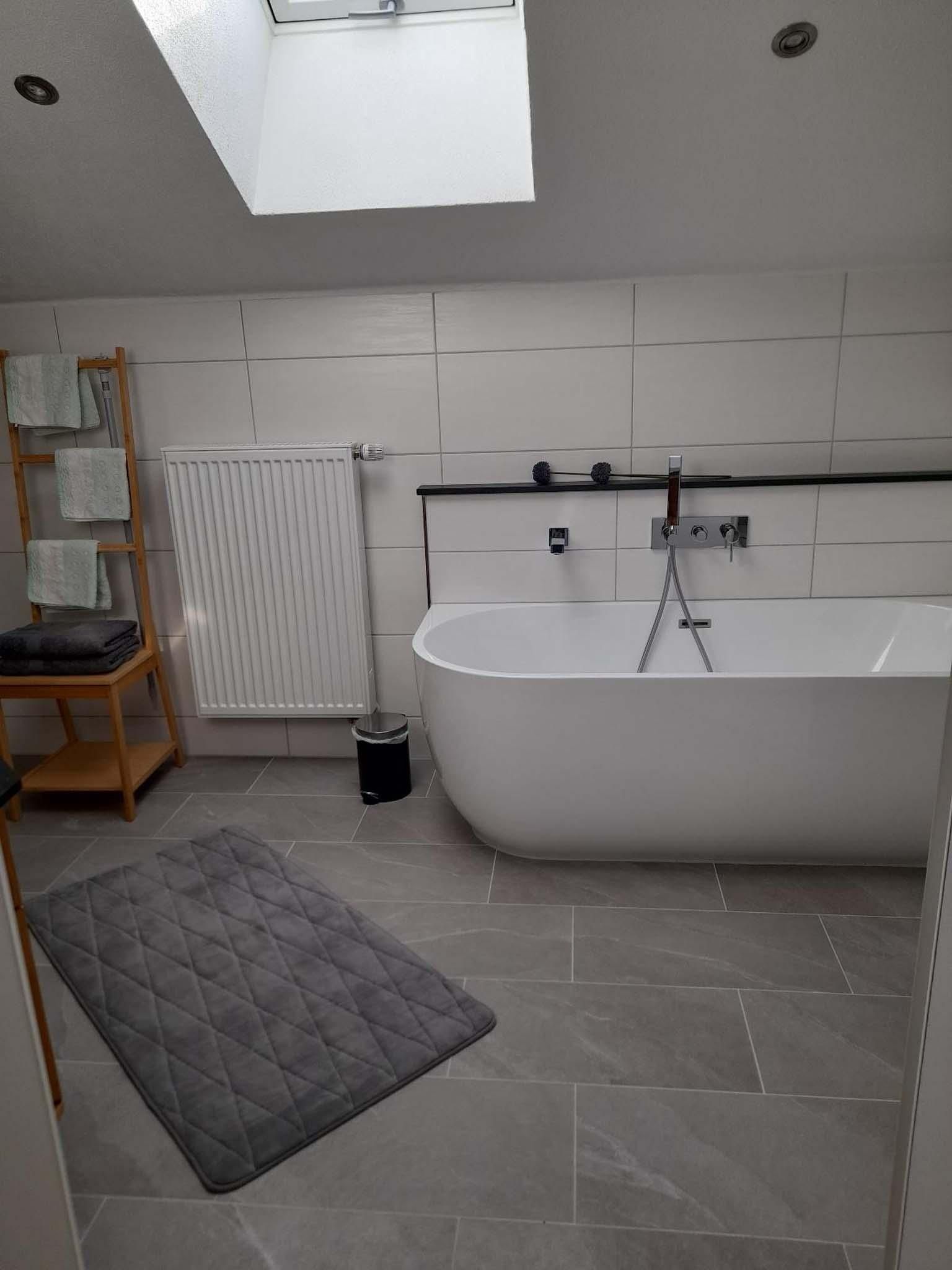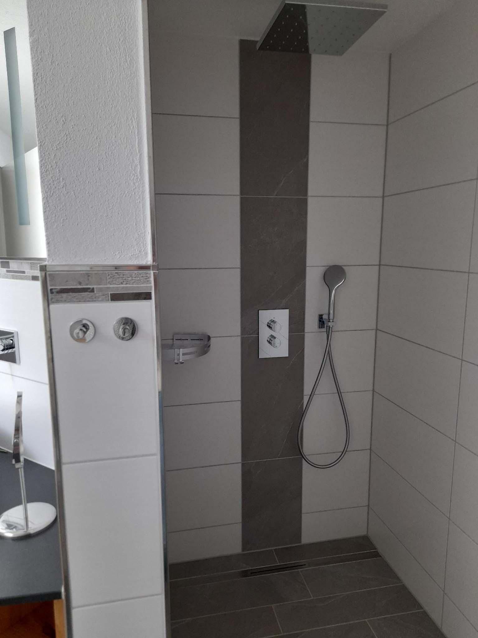 Das geräumige Badezimmer mit ebenerdiger Dusche und Regenbrause, Badewanne, großem Spiegel, Hand- und Badetücher runden das Gesamtbild ab.